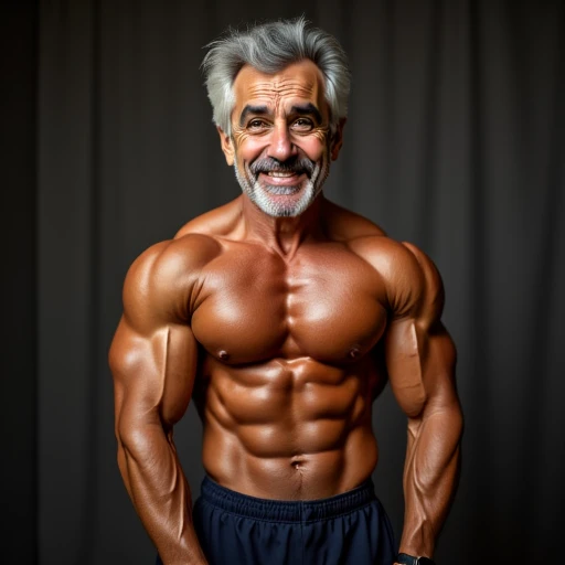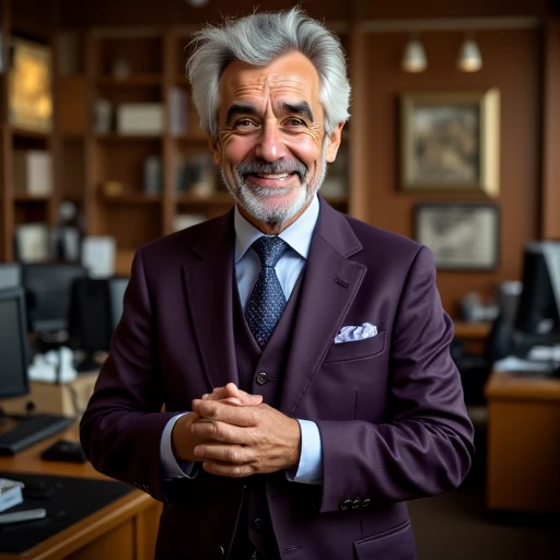 Photorealistic, Realistic, 61-year-old handsome white man, Jewish, friendly, well-dressed dapper, style, comedic aura, well-styled grey hair, standing in an arizona telesales office, highest quality, realistic, appears to be wise but also slightly perverted, mischievous, smiling calmly at viewer, wearing a summer linen suit,