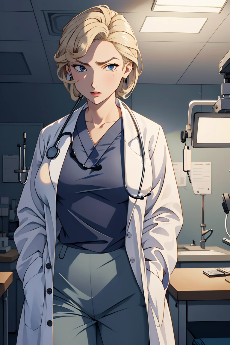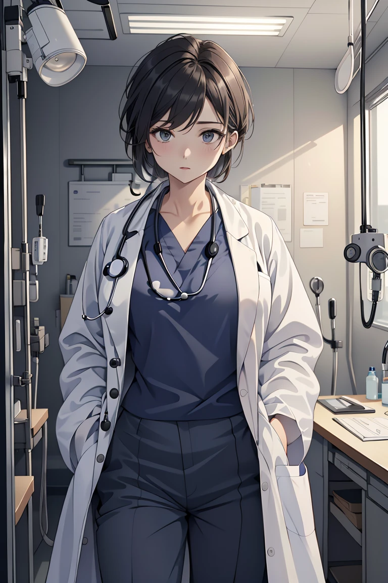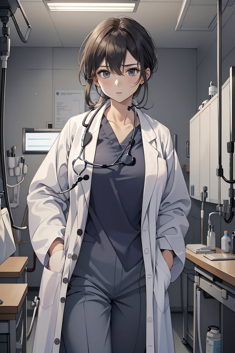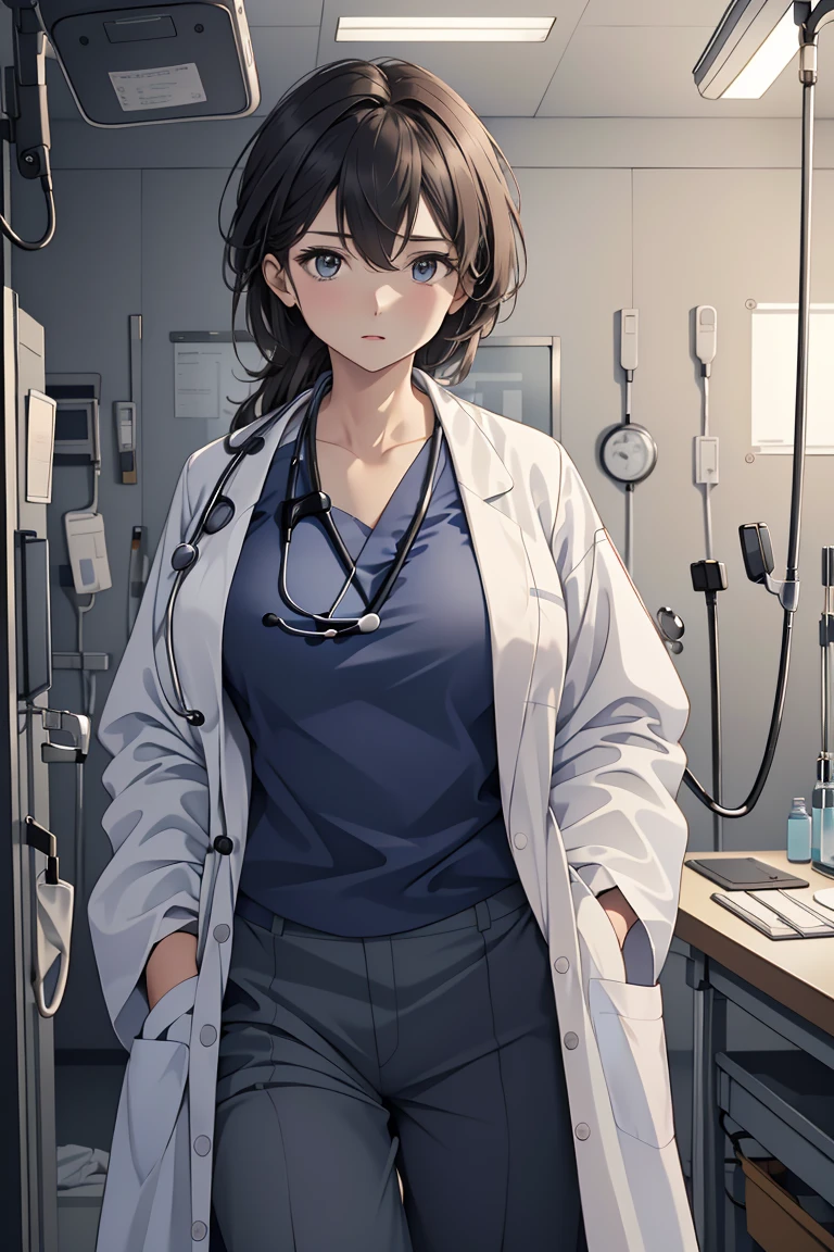 doctor_traditionalcoat, 1girl, solo, shirt, pants, labcoat, doctor, stethoscope, looking at viewer, hands in pockets,