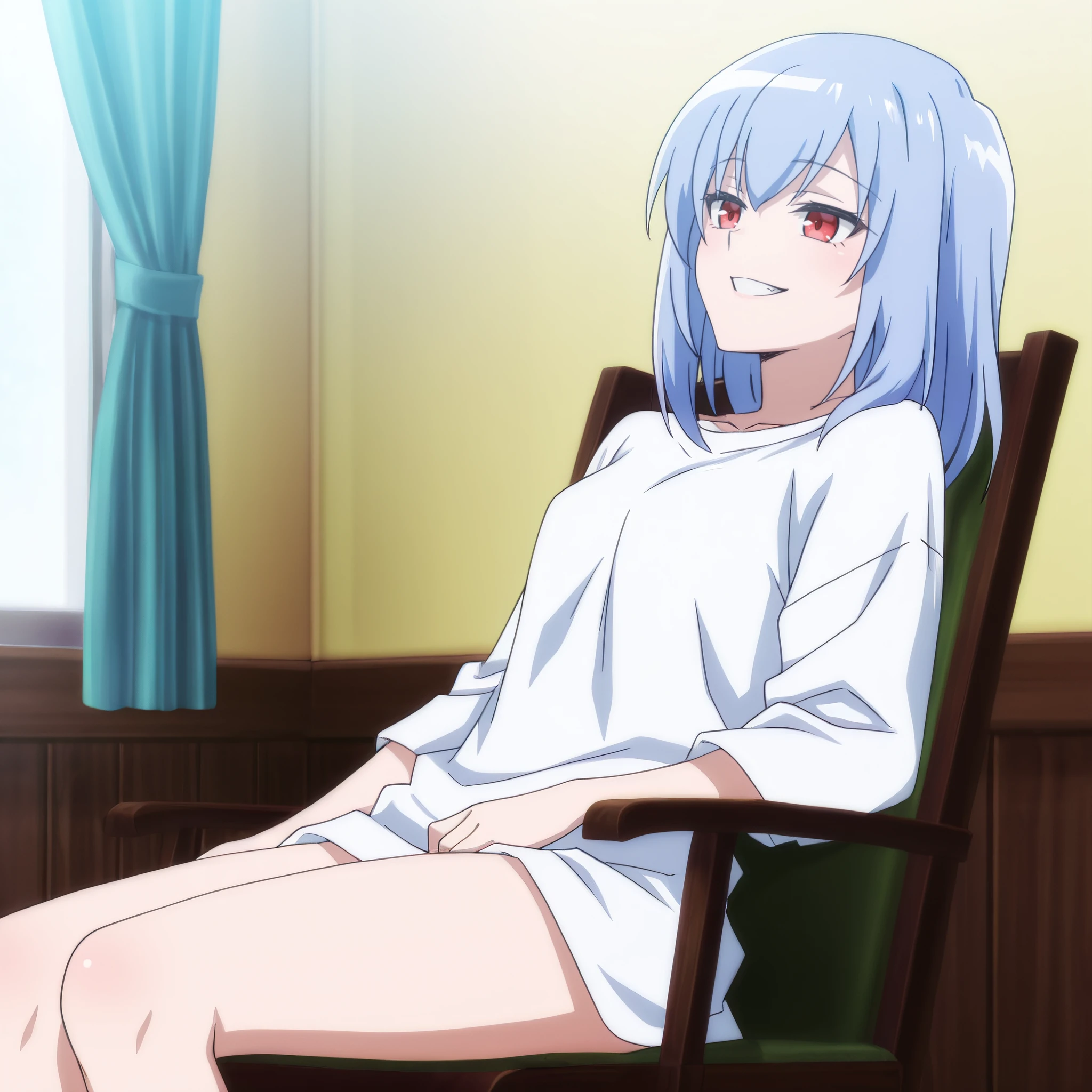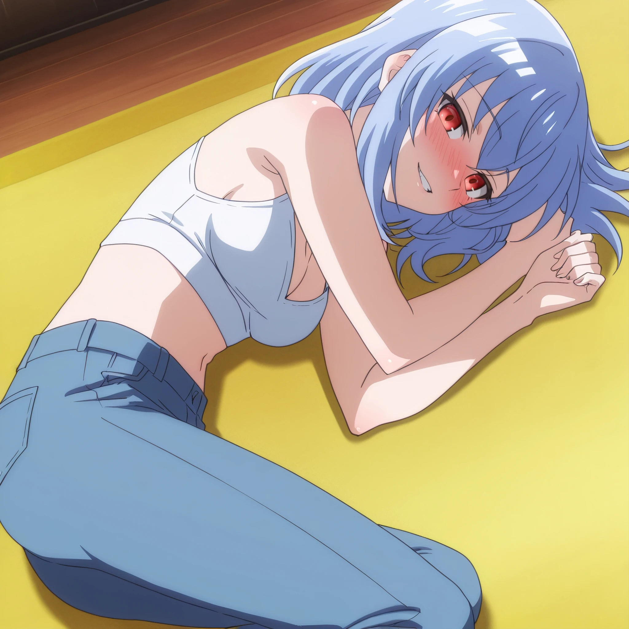 AMGSophie, red eyes, eyebrows visible through hair, bangs, long hair, hair between eyes, blue hair,