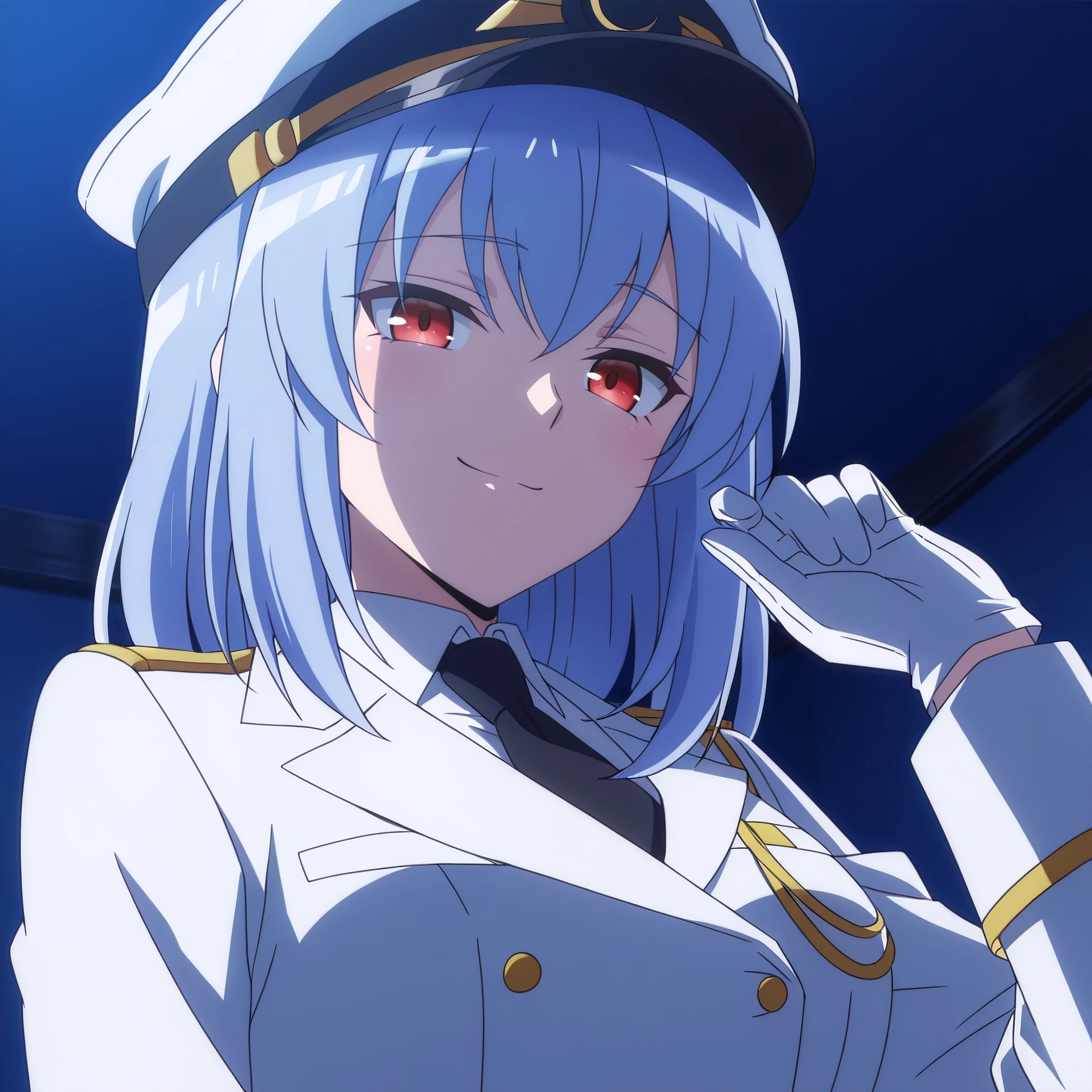 SophieMilitary, hat, peaked cap, military hat, uniform, military, military uniform, gloves, white gloves, necktie, white headwear, shirt, black necktie, jacket, long sleeves, collared shirt, white shirt,