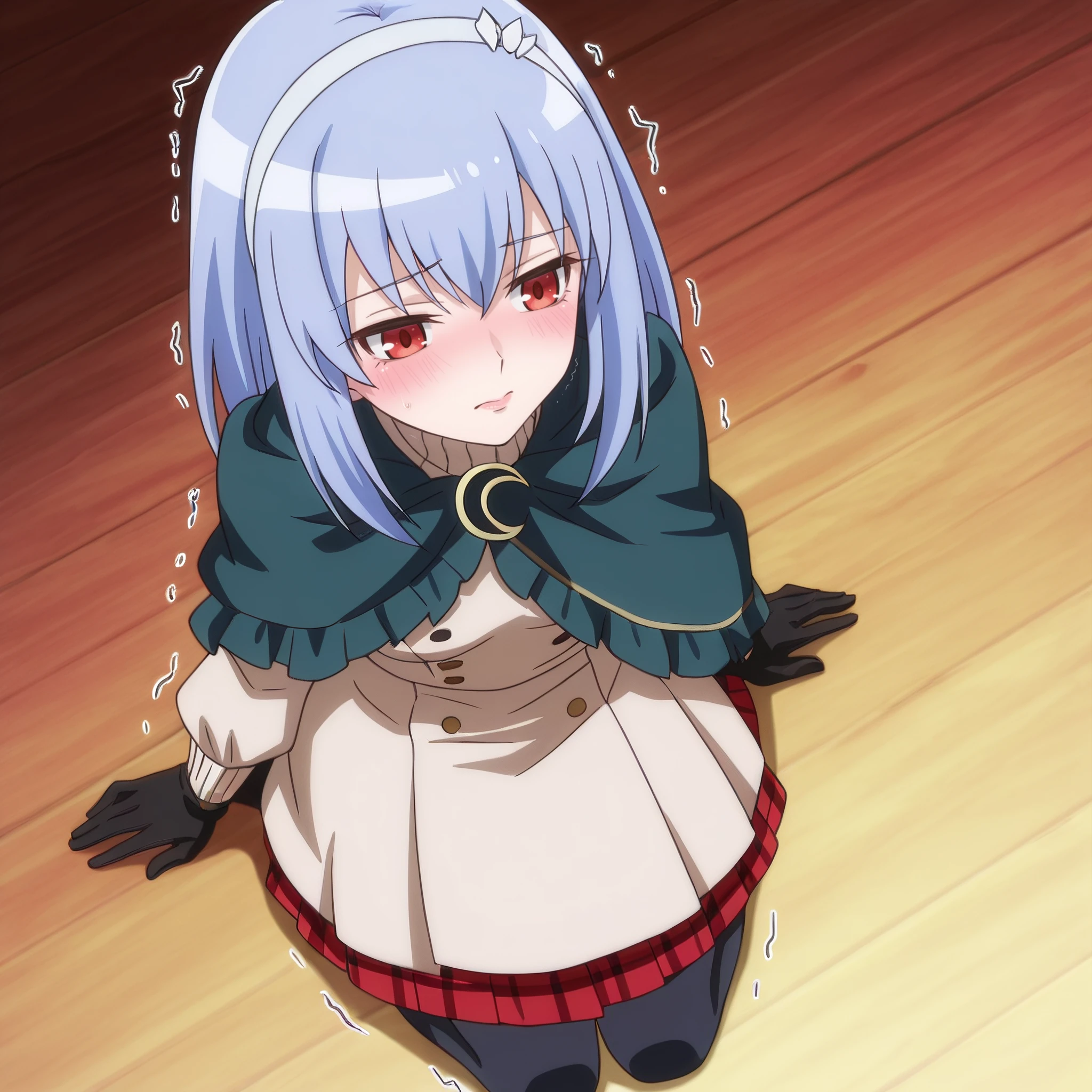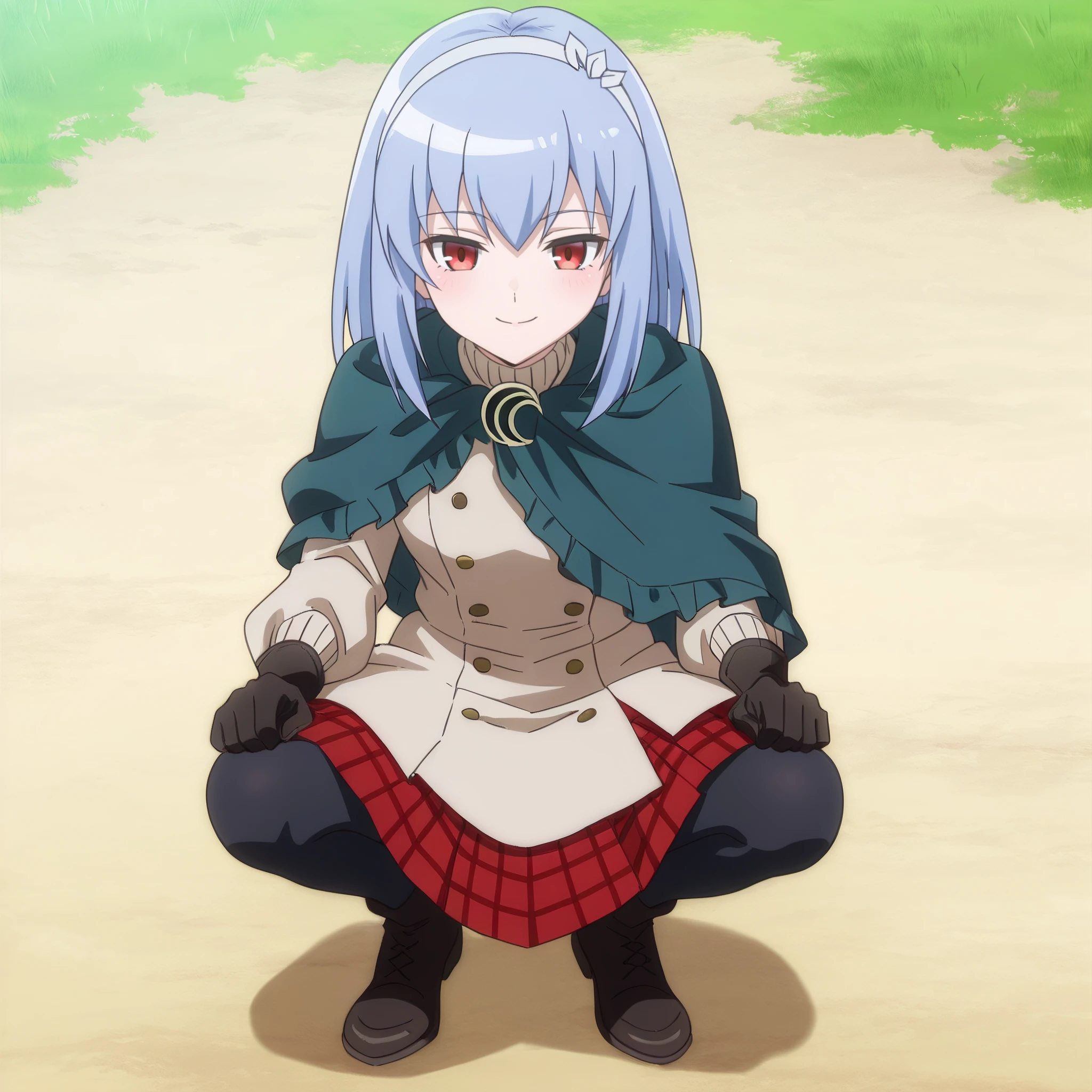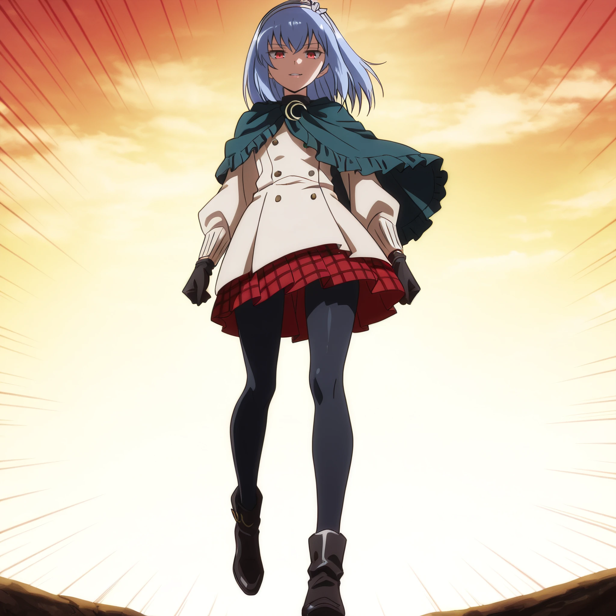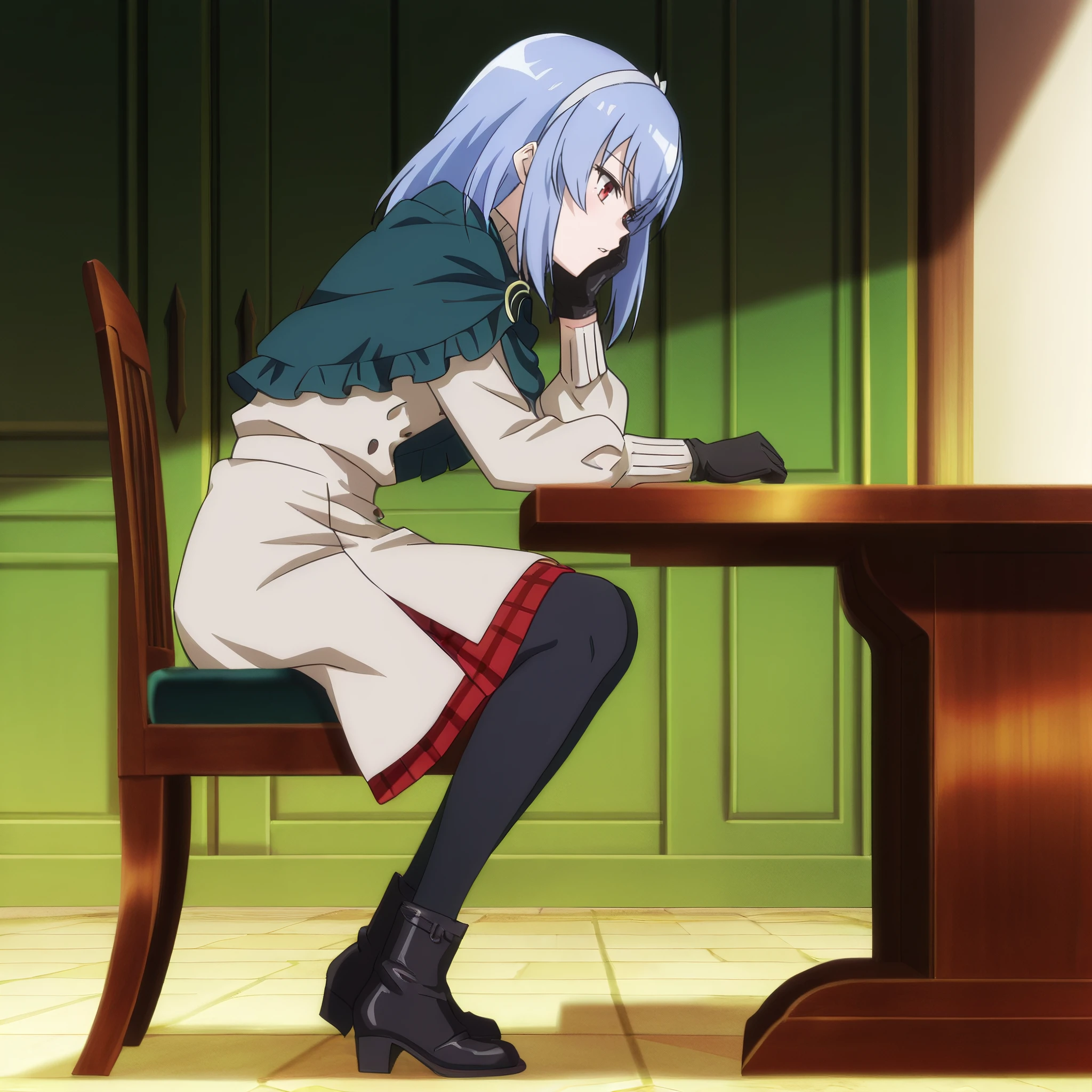 SophieOutfit, long sleeves, gloves, capelet, dress, hairband, cape, black gloves, skirt, pantyhose, black legwear, plaid, plaid skirt,