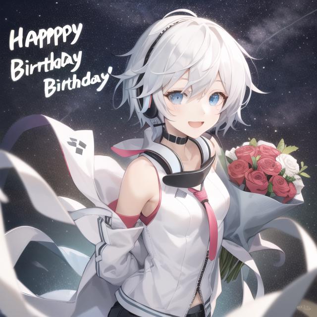 例Prompt: masterpiece, best quality, 4k, 8k, 1girl, solo,yanhe, <lora:yanhe:1>,hide hands, upper body,bouquet, dated, smile, looking at viewer, headset, jacket, short hair, white jacket, open mouth, holding bouquet, arms behind back, headphones, holding, white hair, grey hair