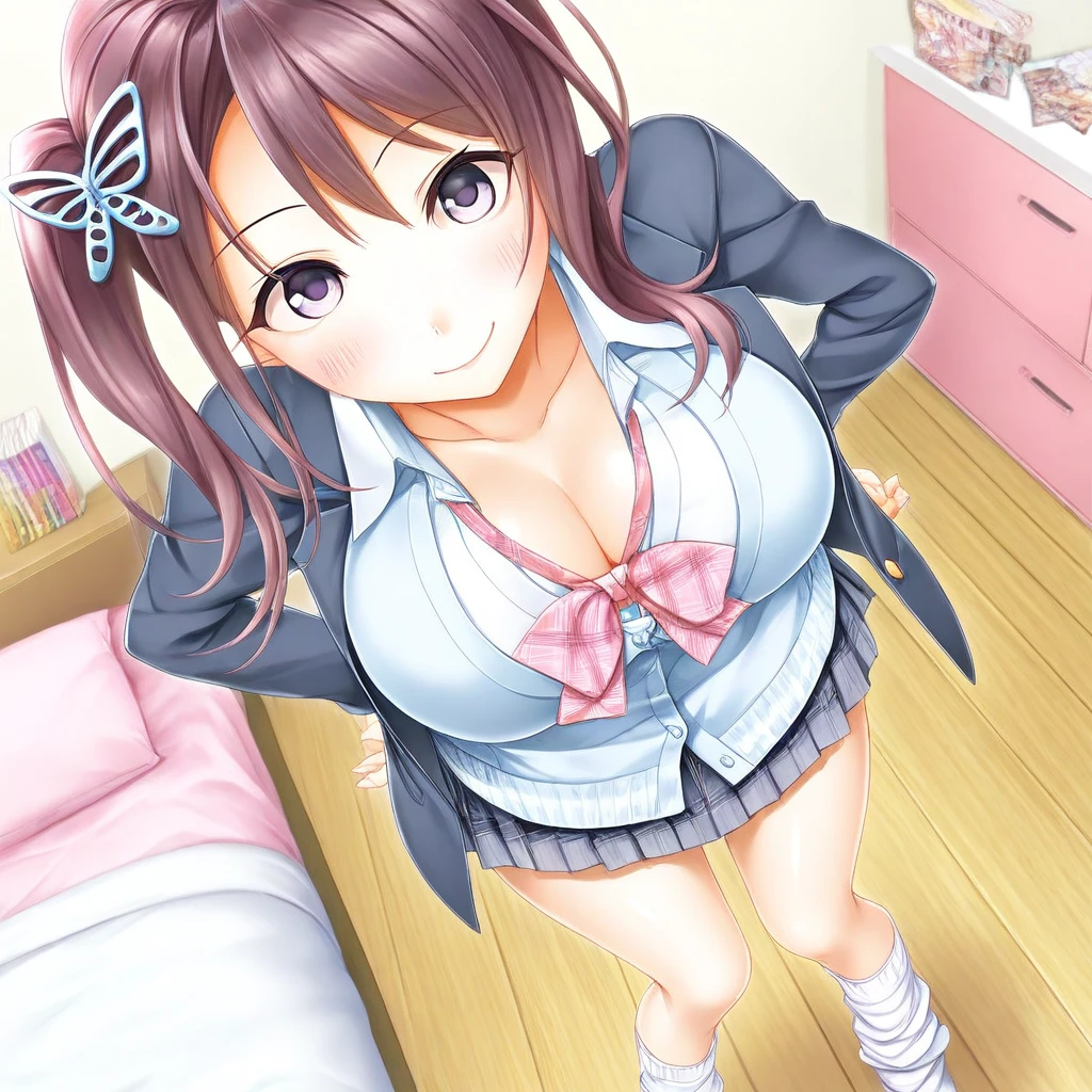 Recommend Prompt:Nanase Katsuragi, purple eyes, claret hair, long hair, side ponytail, butterfly hair ornament,