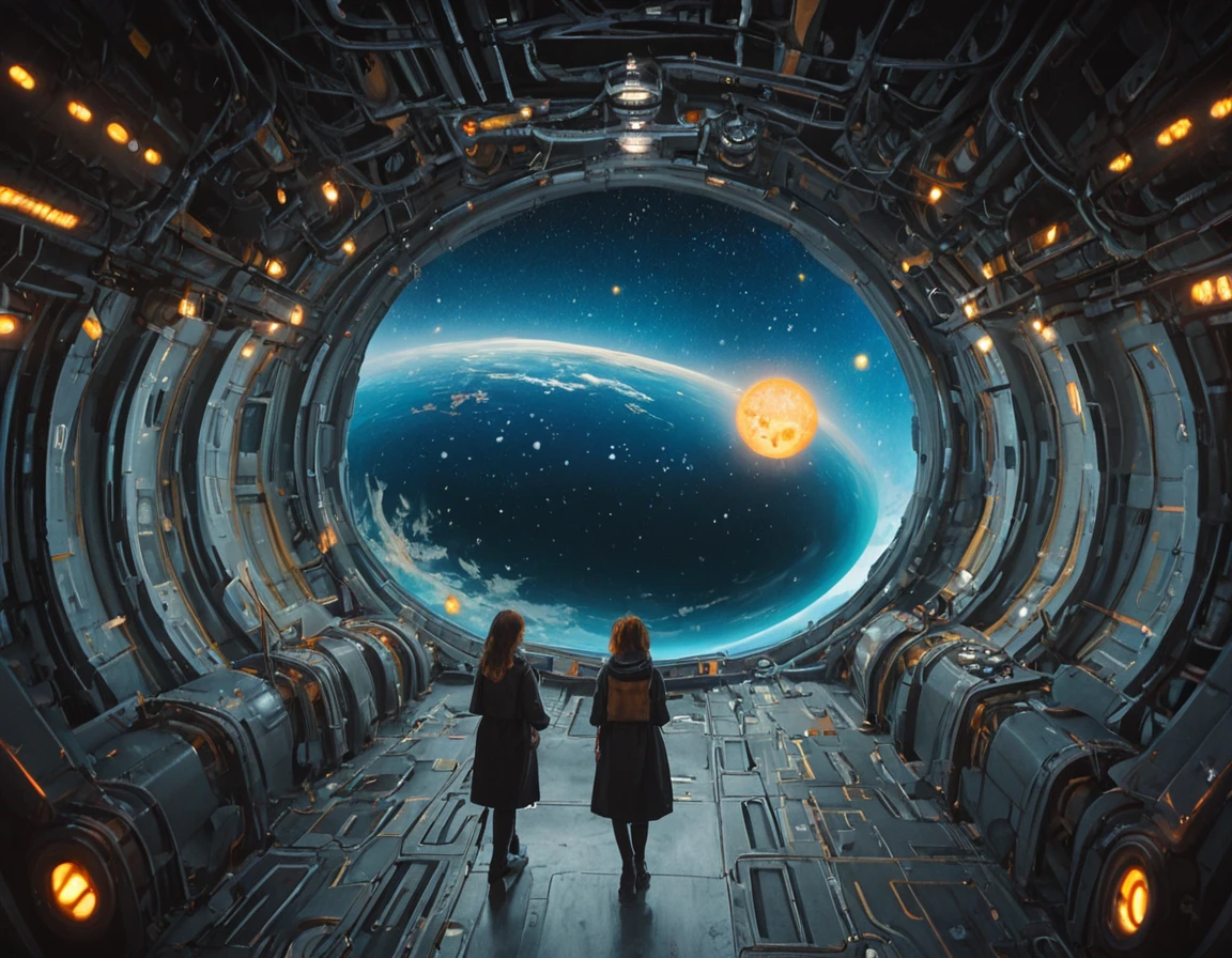 shipscene, SHIPSC3N3, (star) sky realistic, planet, background window, window, on a space ship, sci fi, starship, LED lights, hallway, corridor, planet, science fiction), galaxy, star, ship corridor shot, warhammer style