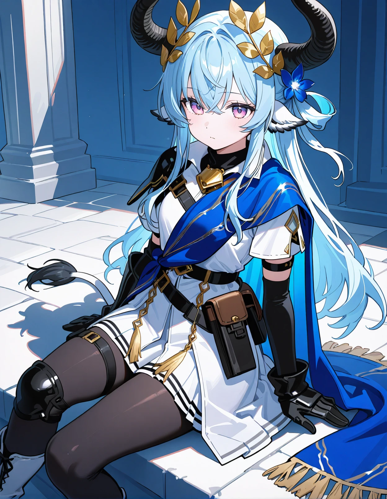 cynisca,1girl,horns,bird ears,light blue hair,crossed bangs,long hair,hair rings,sidelocks,laurel crown,hair flower,side cape,blue cape,layered clothes,white dress,short sleeves,shirt under dress,black shirt,single pauldron,arm strap,gauntlets,multiple belts,belt pouch,black pantyhose,single knee pad,white platform boots,cow tail,