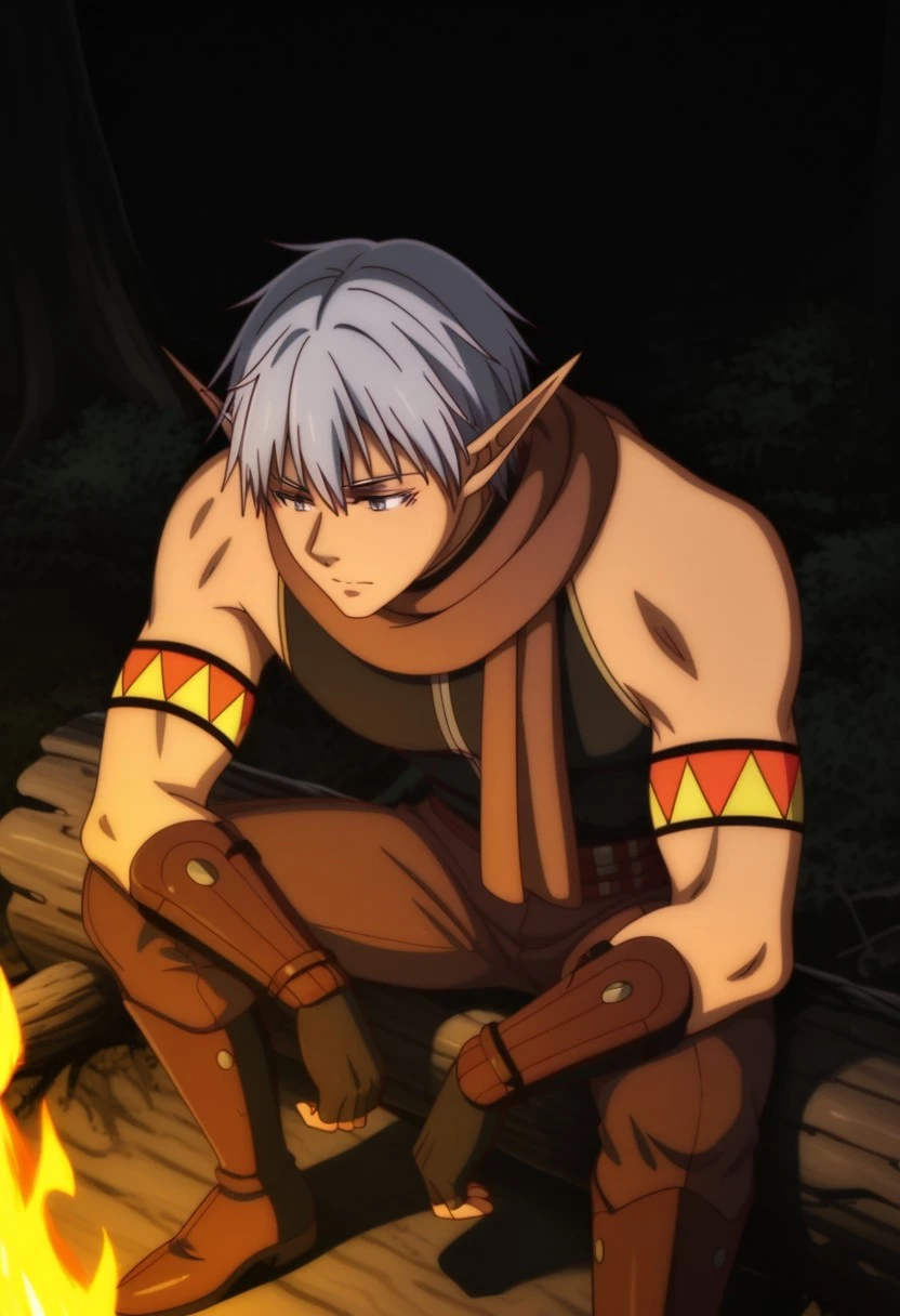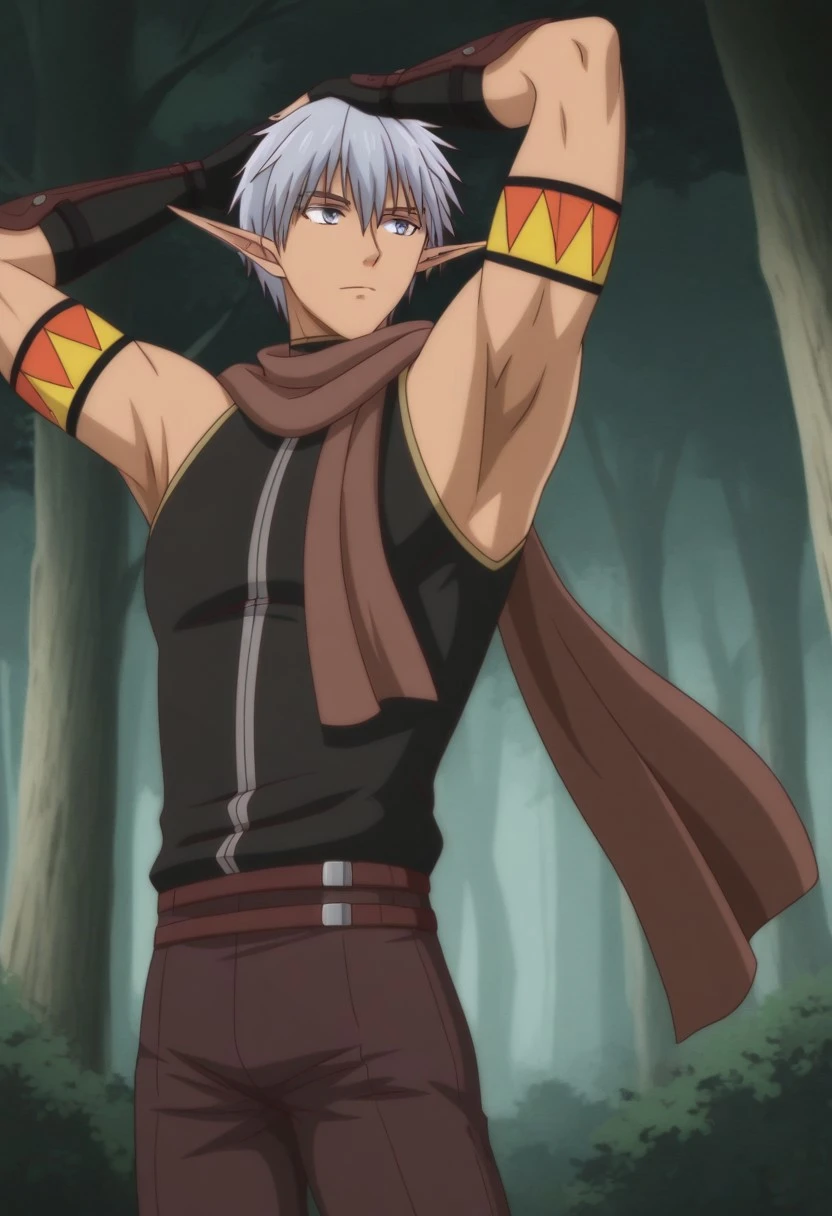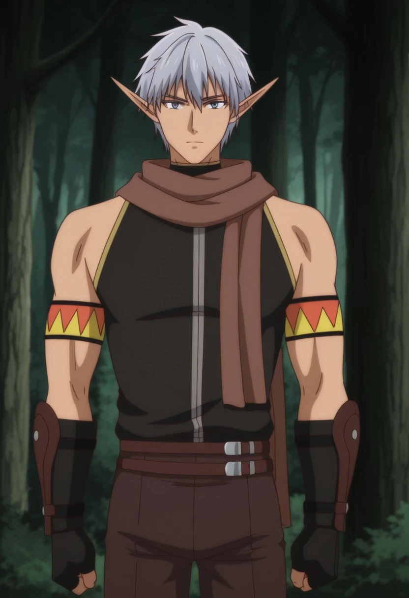 Gia Nagheev, gray hair, gray-blue eyes, long pointed ears, black sleeveless turtleneck shirt, long brown scarf, orange and yellow armbands, black fingerless gloves, brown leather gauntlets, double brown belts, brown pants, brown boots