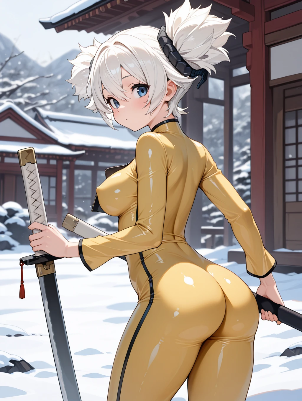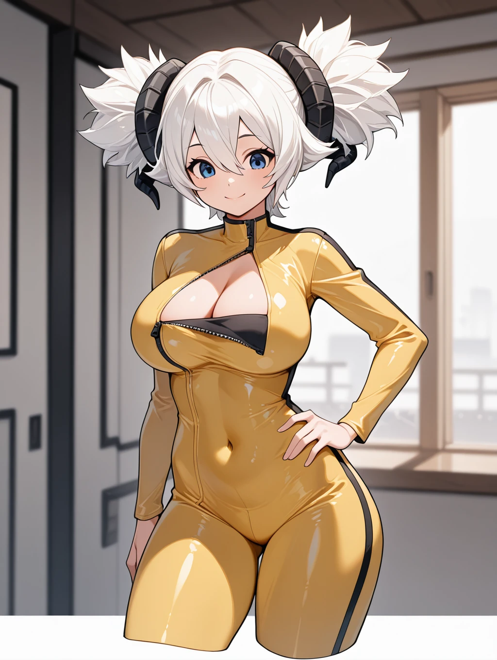 rey, 1girl, solo, blue eyes, large breasts, long sleeves, cleavage, hair between eyes, twintails, white hair, horns, zipper, curled horns, yellow bodysuit