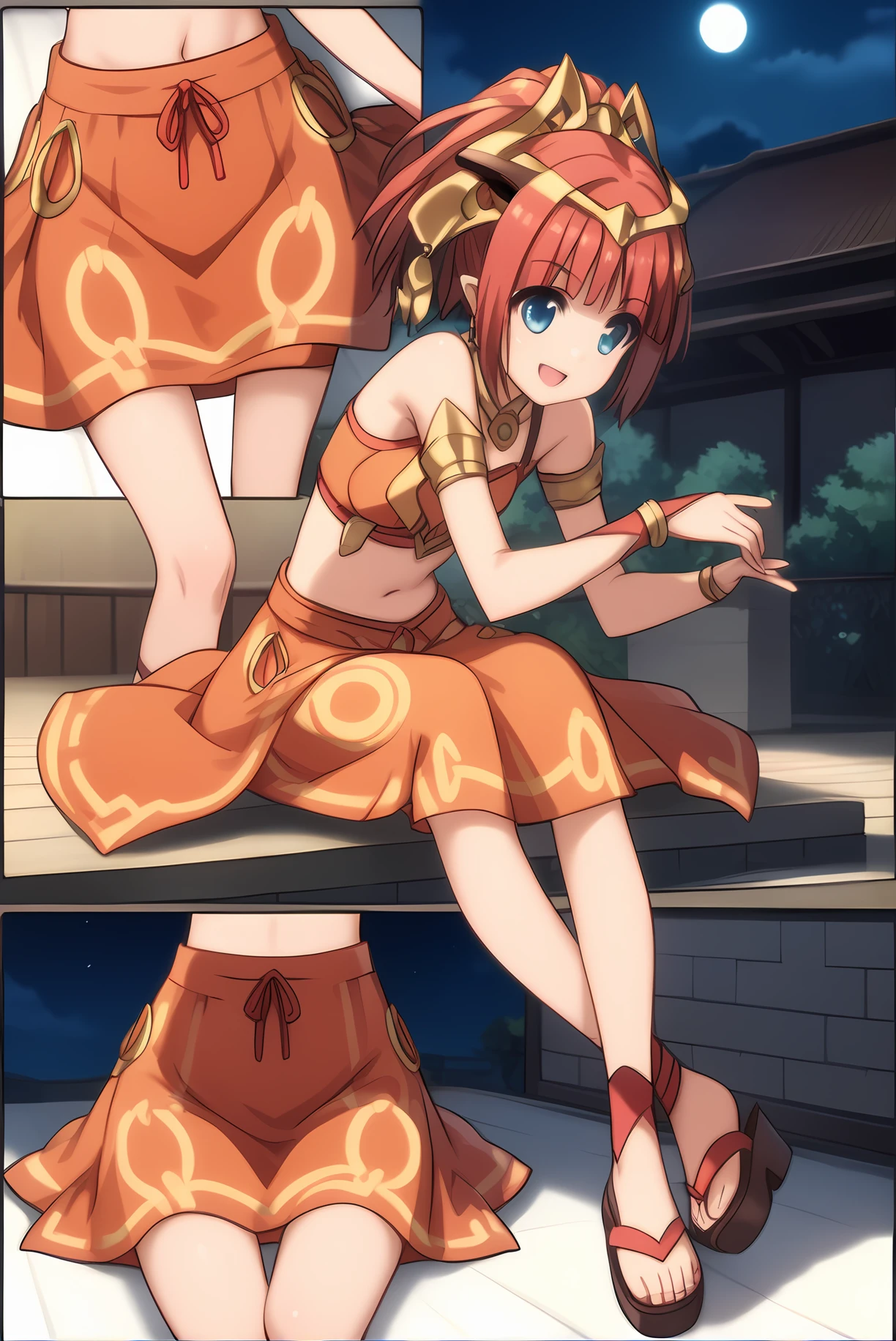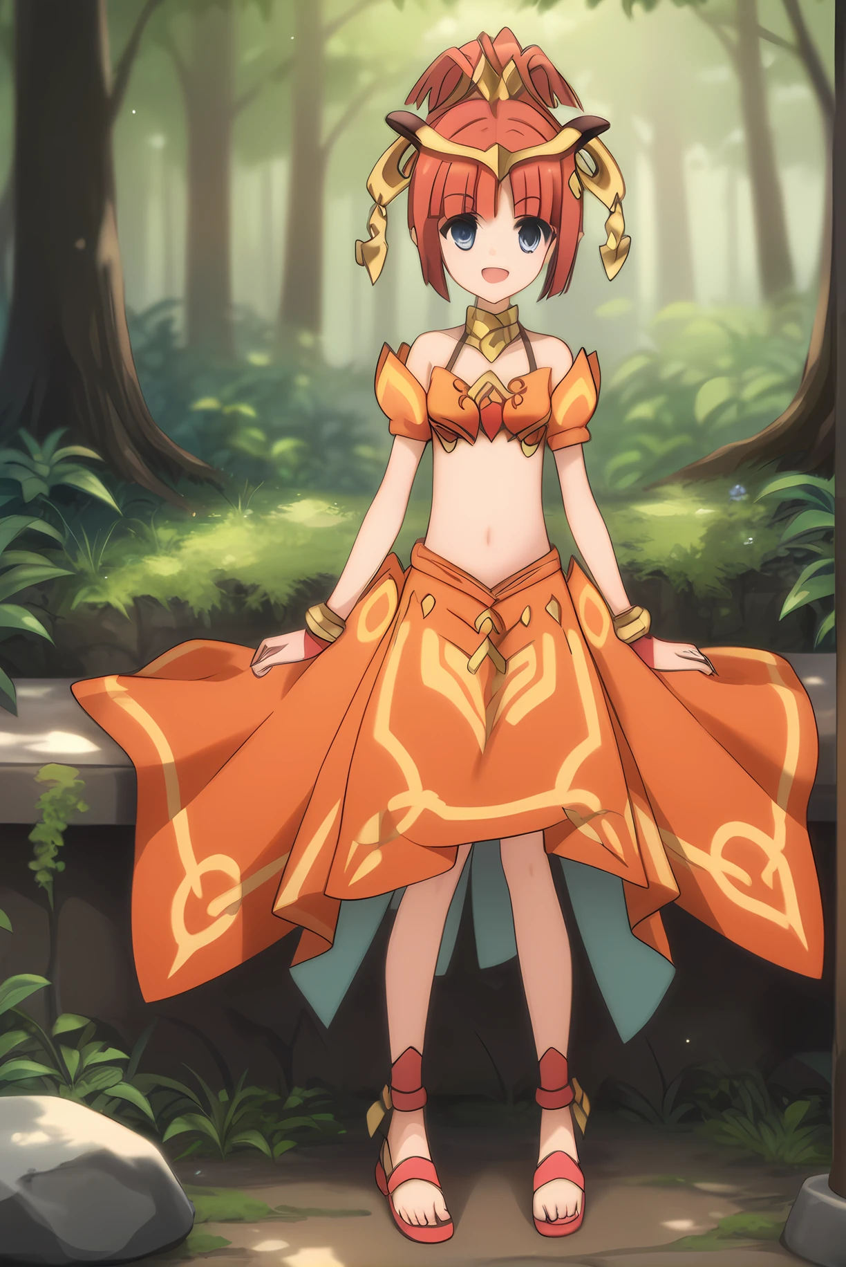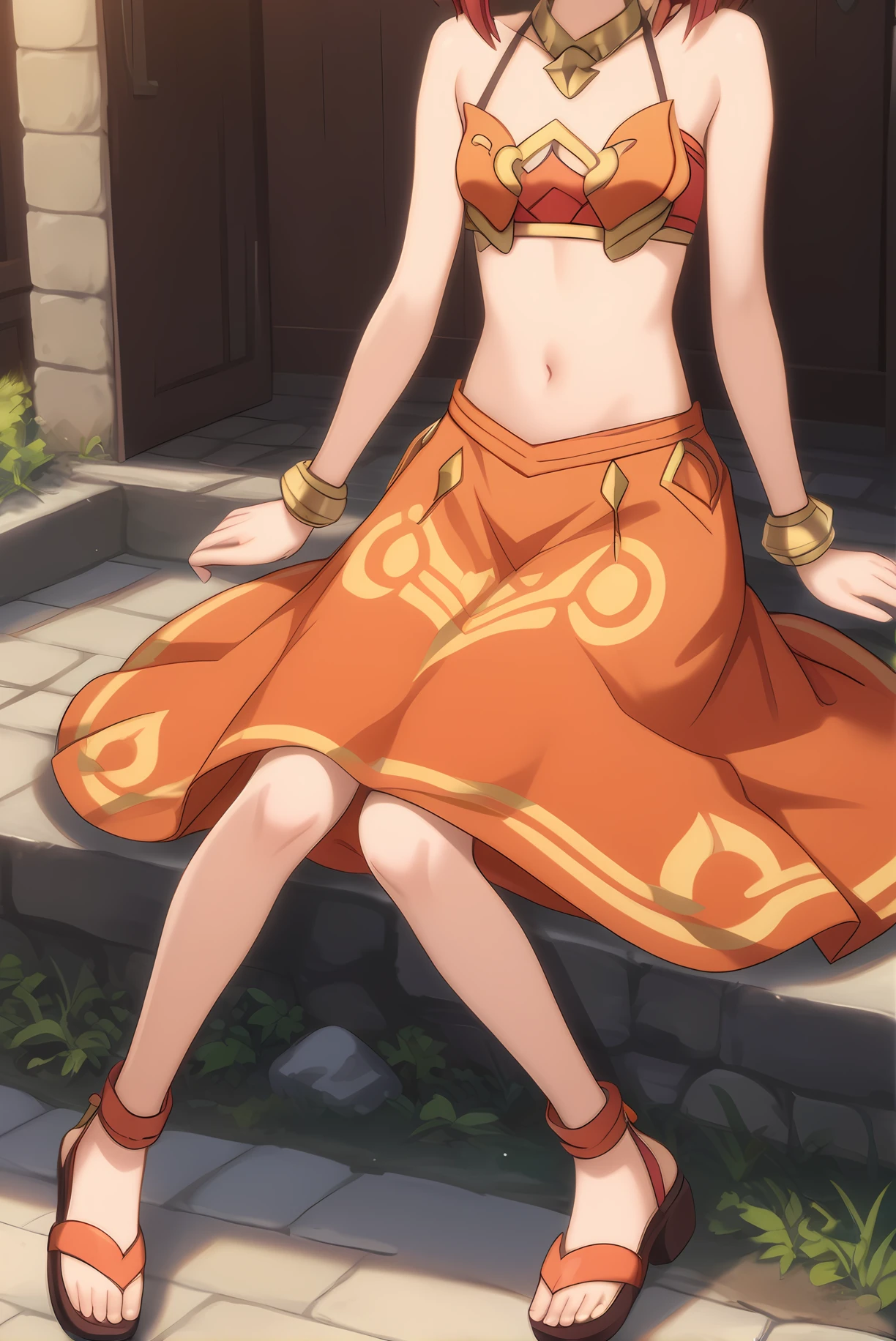 orange top, orange skirt, midriff, sandals