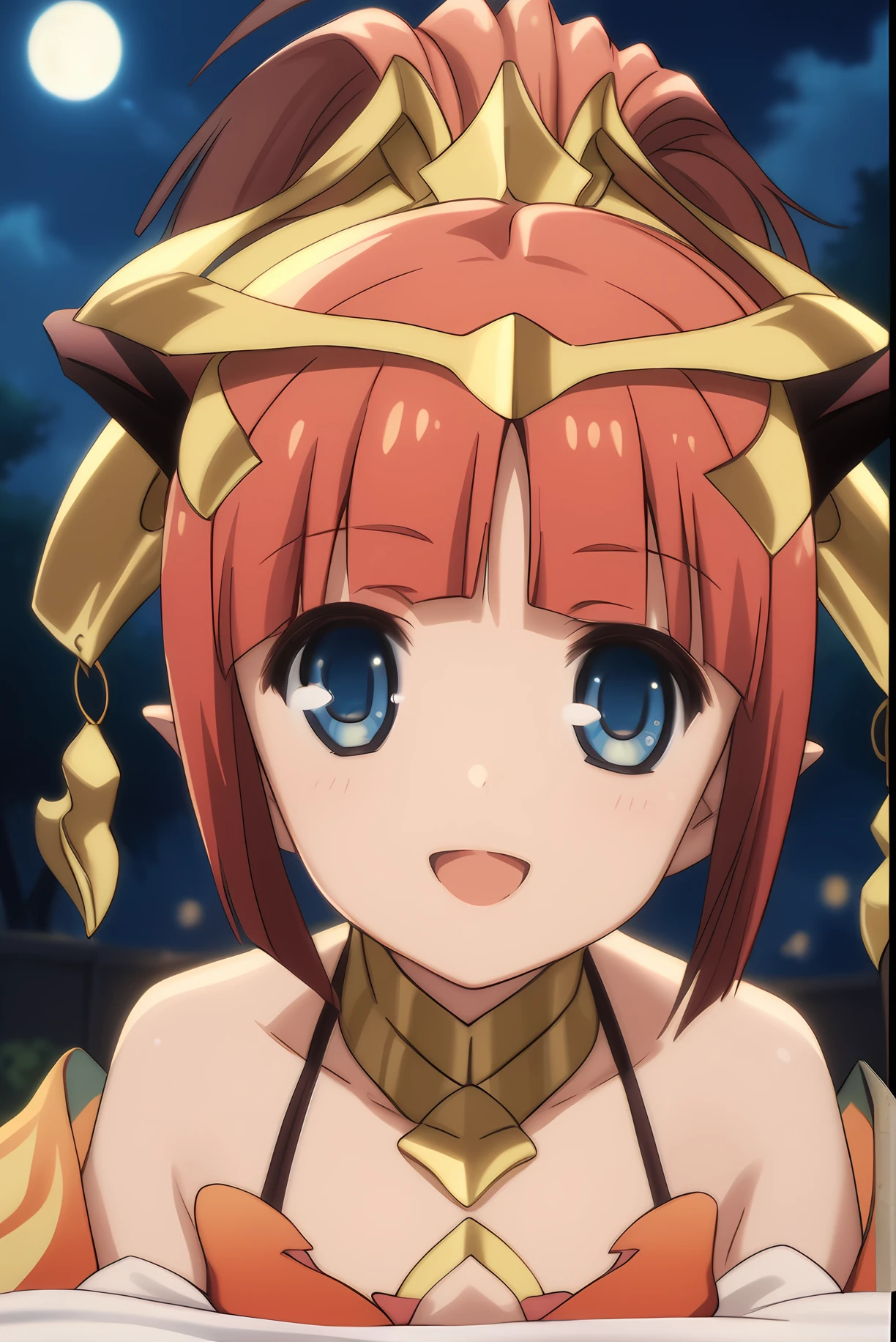 red hair, short hair, ponytail, blue eyes, pointy ears, horns