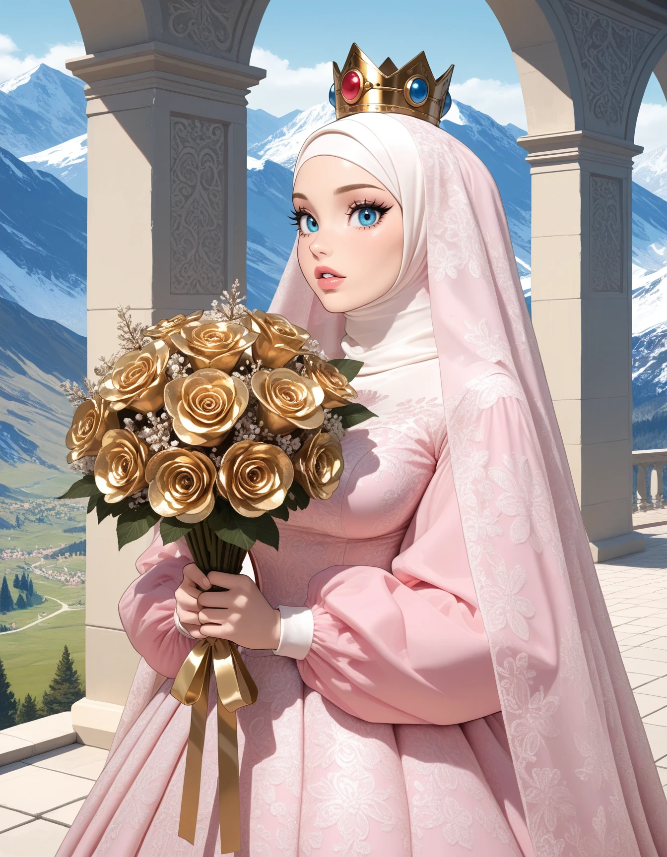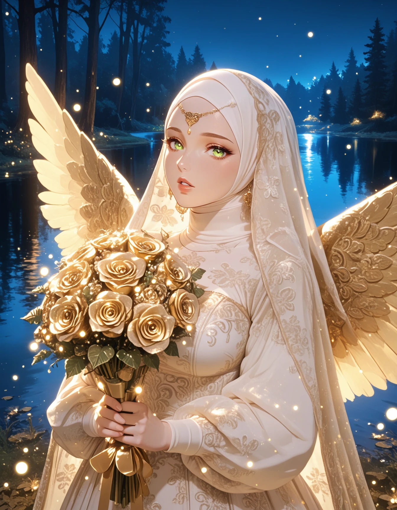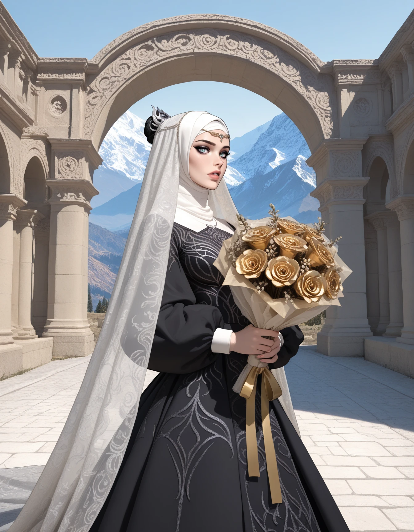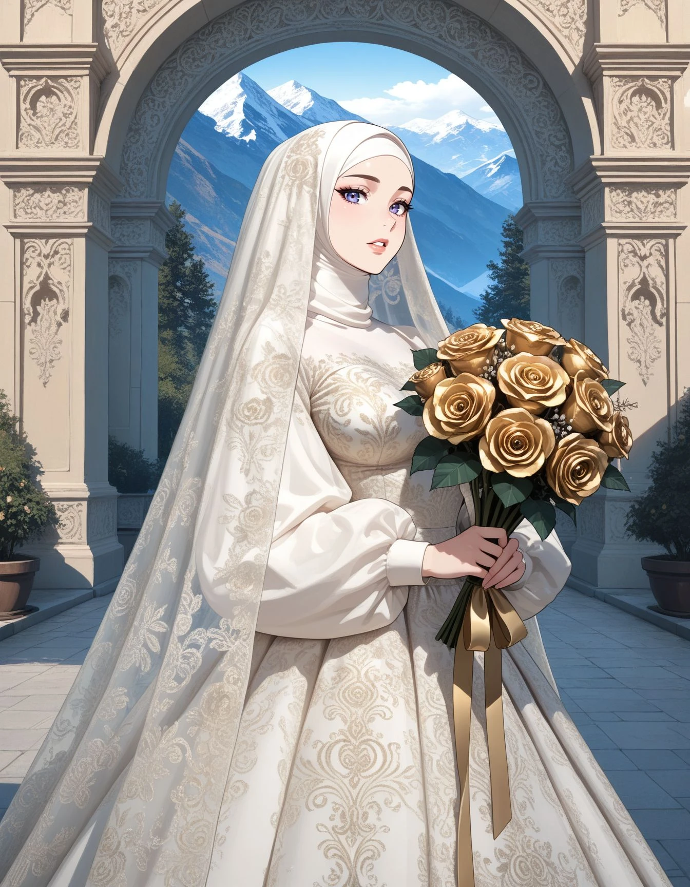 <color> dress hijab, bridal veil, puffy sleeves holding, gold bouquet