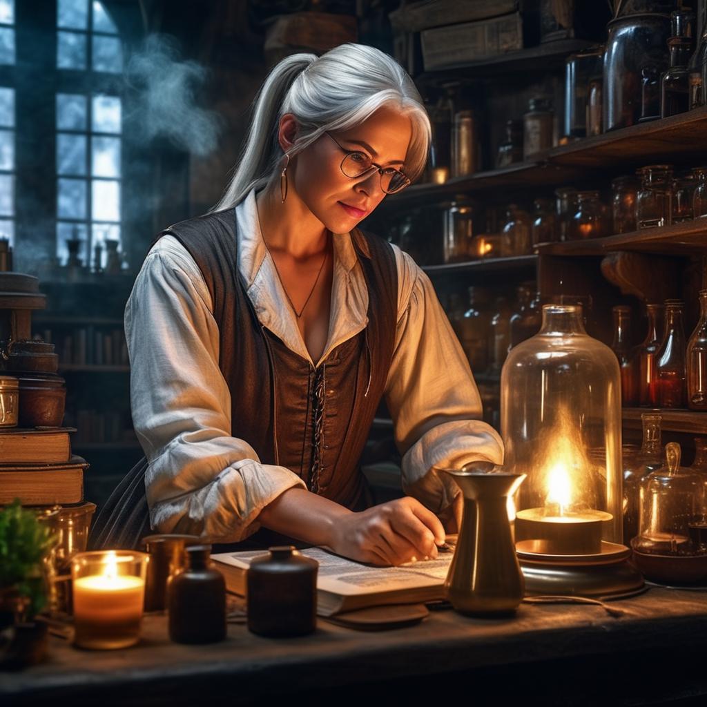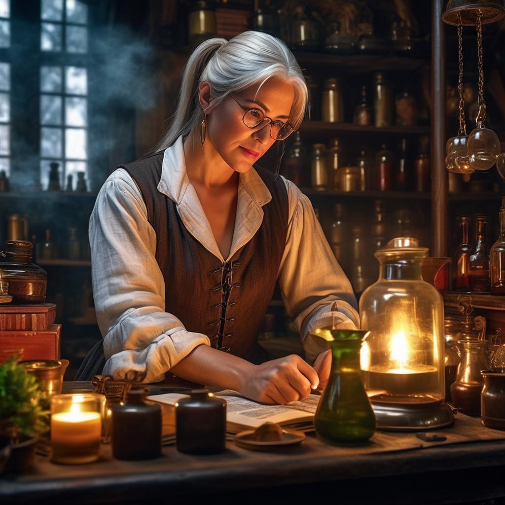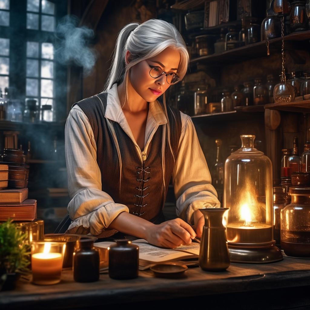 1boy, 1girl, alchemist, alcohol, apple, bald, bar (place), bare shoulders, bartender, basket, beard, black hair, blonde hair, blue eyes, blurry, blurry background, book, bookshelf, bottle, braid, breasts, brown eyes, brown hair, brown vest, candle, candlelight, chair, cleavage, closed eyes, closed mouth, coat, collared shirt, cup, dark, depth of field, dress, earrings, facial hair, fire, food, from side, fruit, glasses, green eyes, grey hair, hat, head tilt, holding, hood, indoors, jar, jewelry, lamp, light bulb, lips, long hair, long sleeves, looking at viewer, looking down, male focus, manly, medium breasts, mustache, necklace, old, old man, old woman, pendant, piercing, plant, ponytail, pouring, profile, realistic, ring, robe, round eyewear, shirt, short hair, sitting, sleeves rolled up, smile, smoke, solo, spoon, sunlight, table, twin braids, upper body, vest, watermark, wavy hair, web address, white hair, white shirt, window, wrinkled skin, writing, zipperDescription