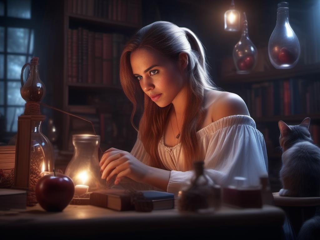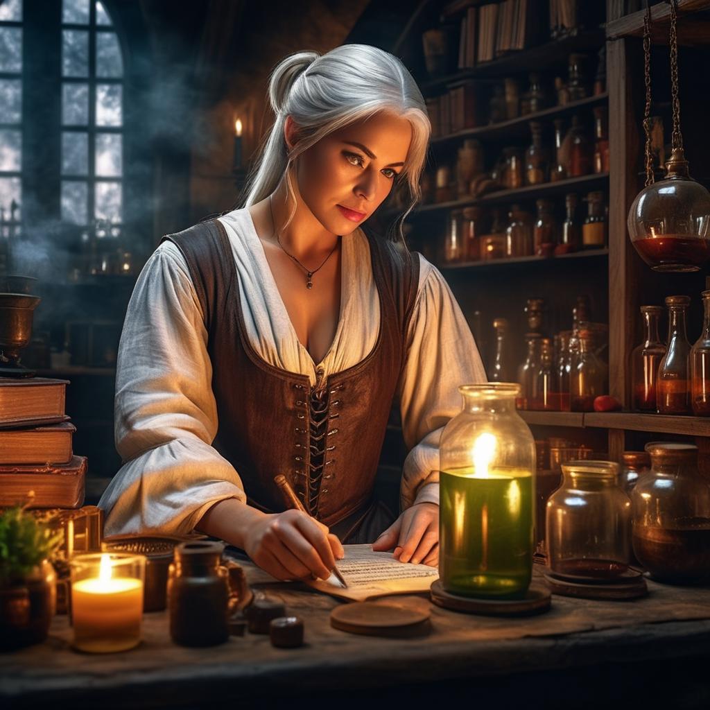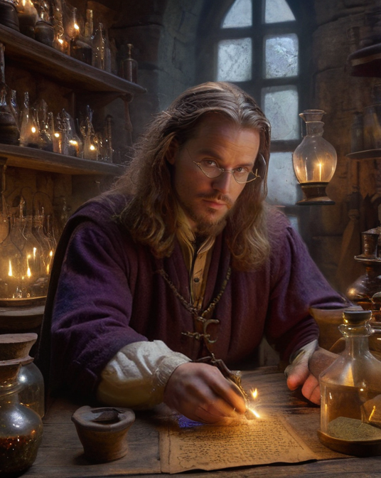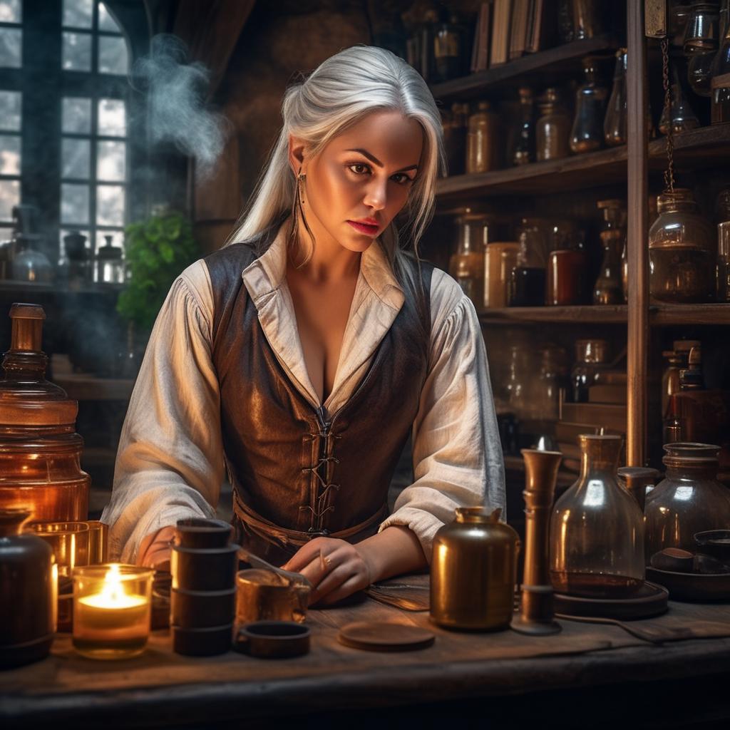 1boy, 1girl, alchemist, alcohol, apple, bald, bar (place), bare shoulders, bartender, basket, beard, black hair, blonde hair, blue eyes, blurry, blurry background, book, bookshelf, bottle, braid, breasts, brown eyes, brown hair, brown vest, candle, candlelight, chair, cleavage, closed eyes, closed mouth, coat, collared shirt, cup, dark, depth of field, dress, earrings, facial hair, fire, food, from side, fruit, glasses, green eyes, grey hair, hat, head tilt, holding, hood, indoors, jar, jewelry, lamp, light bulb, lips, long hair, long sleeves, looking at viewer, looking down, male focus, manly, medium breasts, mustache, necklace, old, old man, old woman, pendant, piercing, plant, ponytail, pouring, profile, realistic, ring, robe, round eyewear, shirt, short hair, sitting, sleeves rolled up, smile, smoke, solo, spoon, sunlight, table, twin braids, upper body, vest, watermark, wavy hair, web address, white hair, white shirt, window, wrinkled skin, writing, zipperDescription