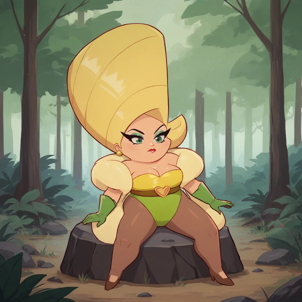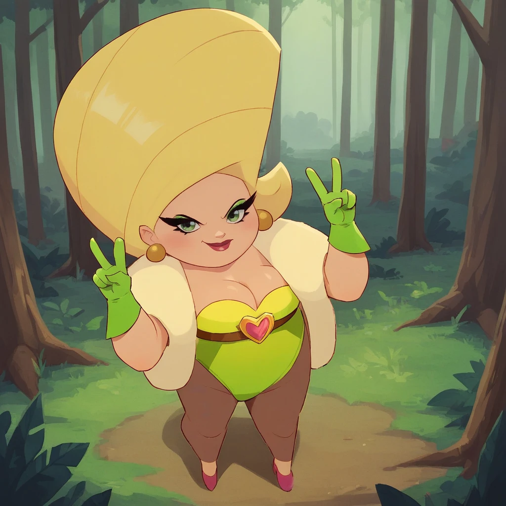 LemonChiffon, 1girl, solo, blonde hair, green eyes, makeup, earrings, cleavage, yellow leotard, belt,