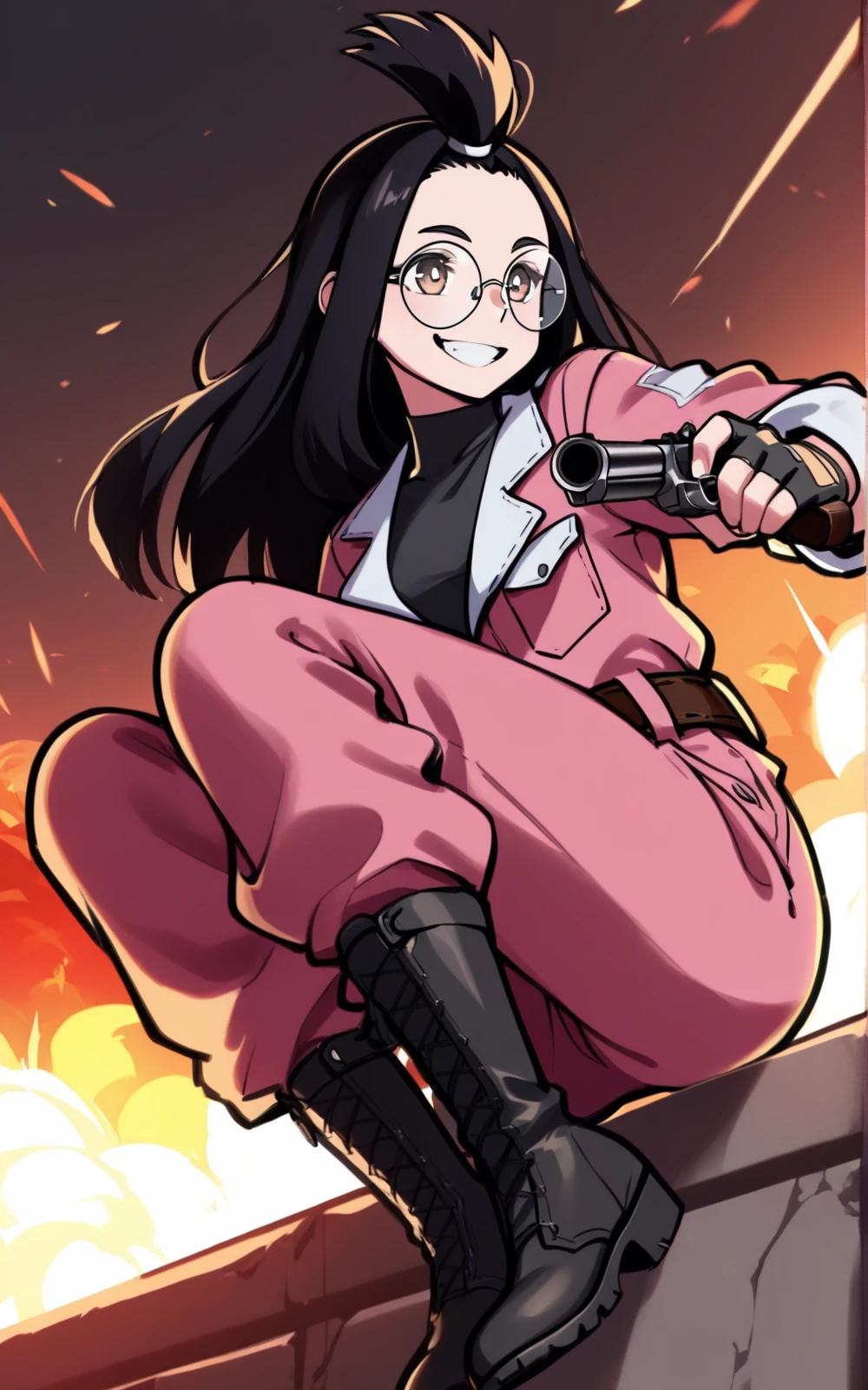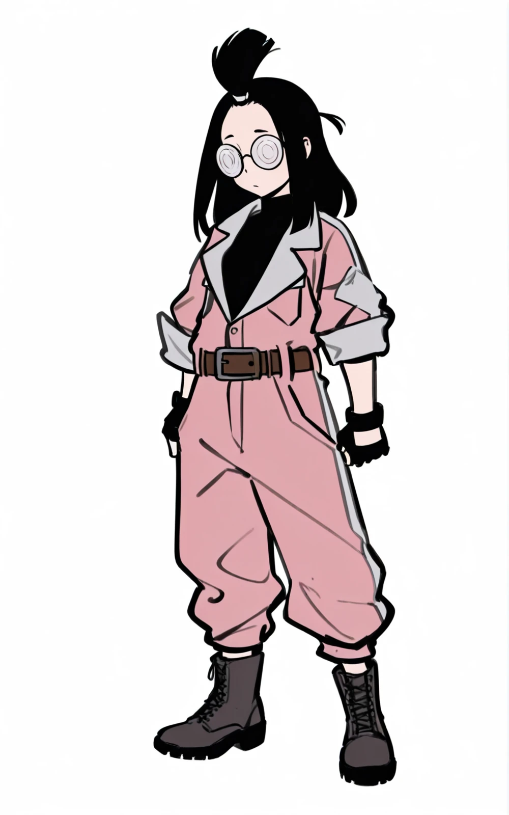 For her Outfit: jumpsuit, pink jumpsuit, combat boots, boots, gloves, fingerless gloves, belt, black shirt