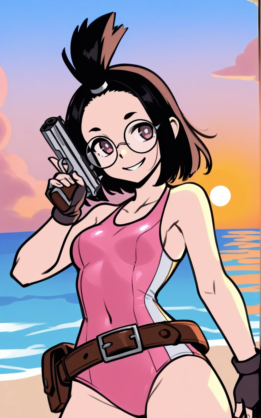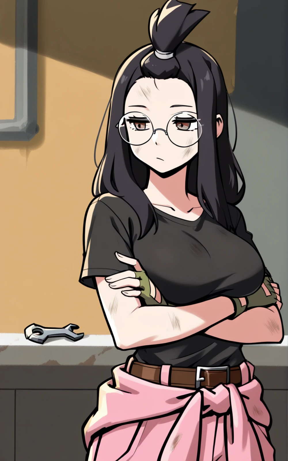 Reinforcement Tags: topknot, glasses, round eyewear, black hair, long hair, white glasses OR brown eyes