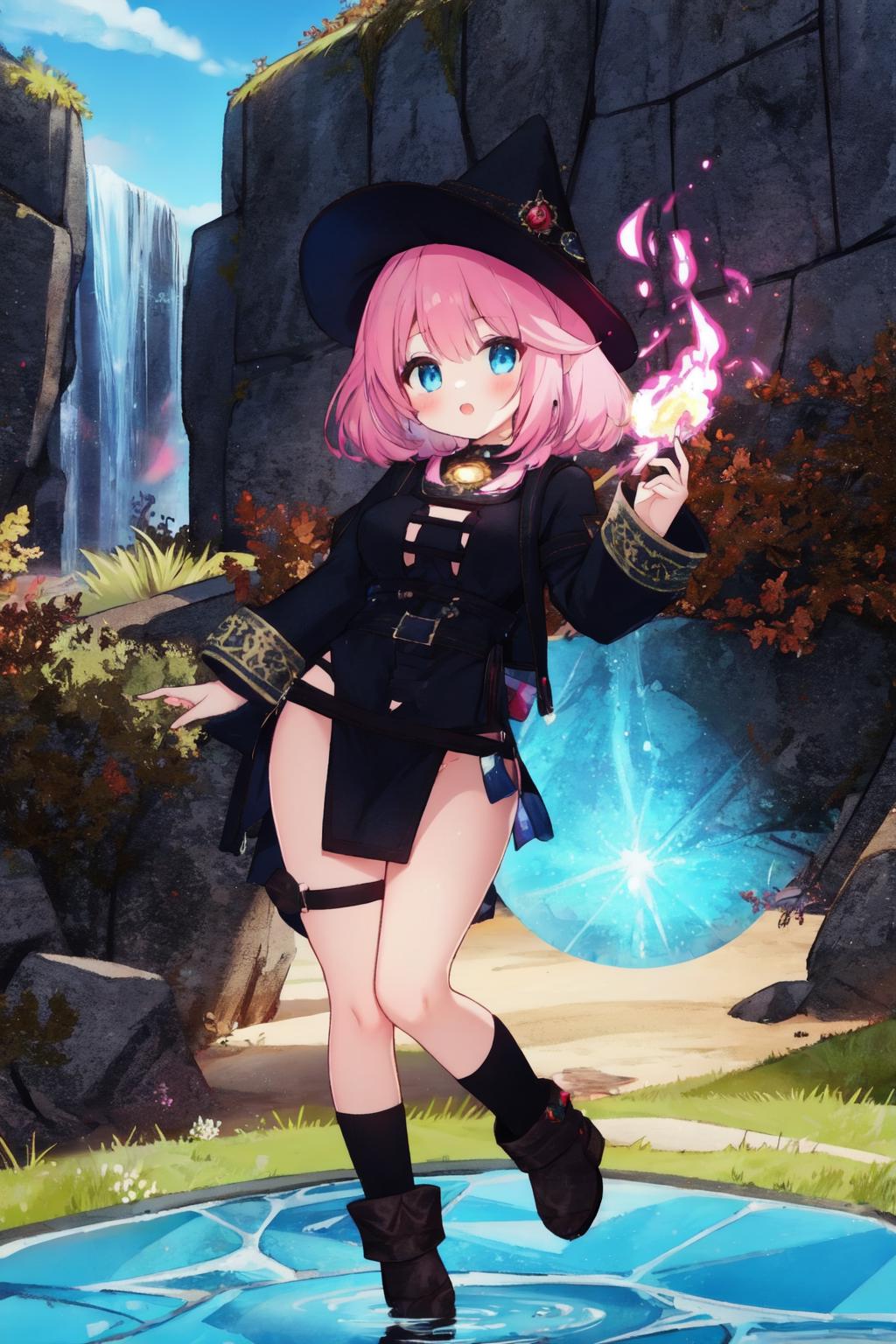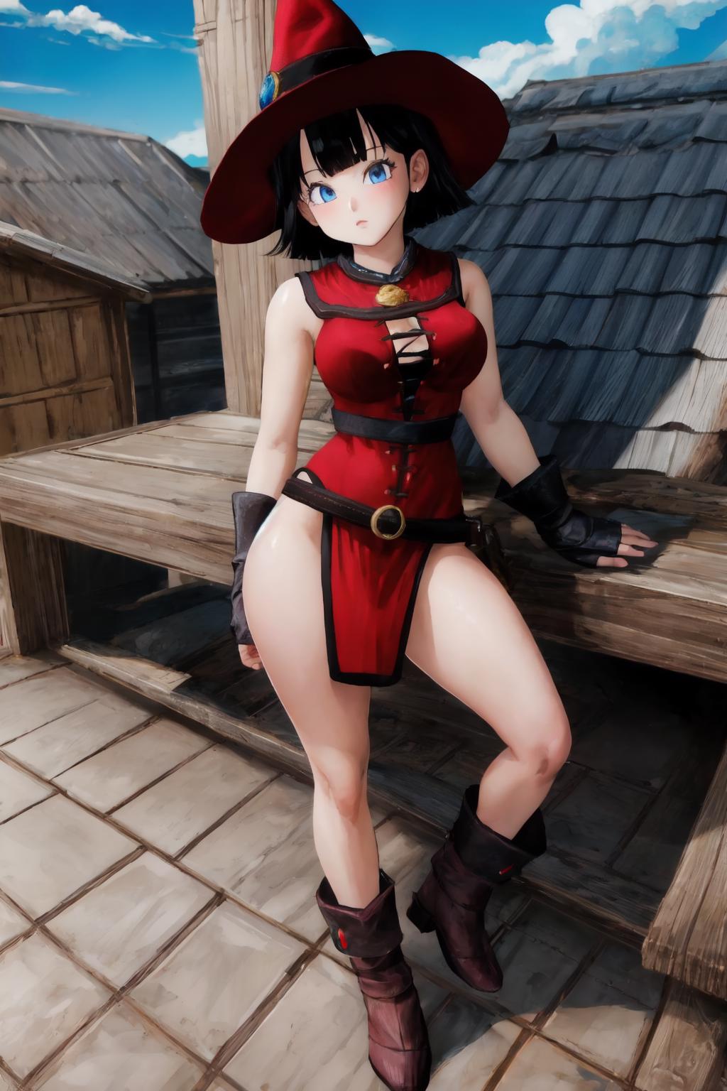 detached sleeves, witch hatorhood, highleg panties, thigh strap, thighhighsandbrown boots.