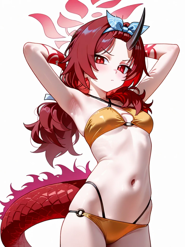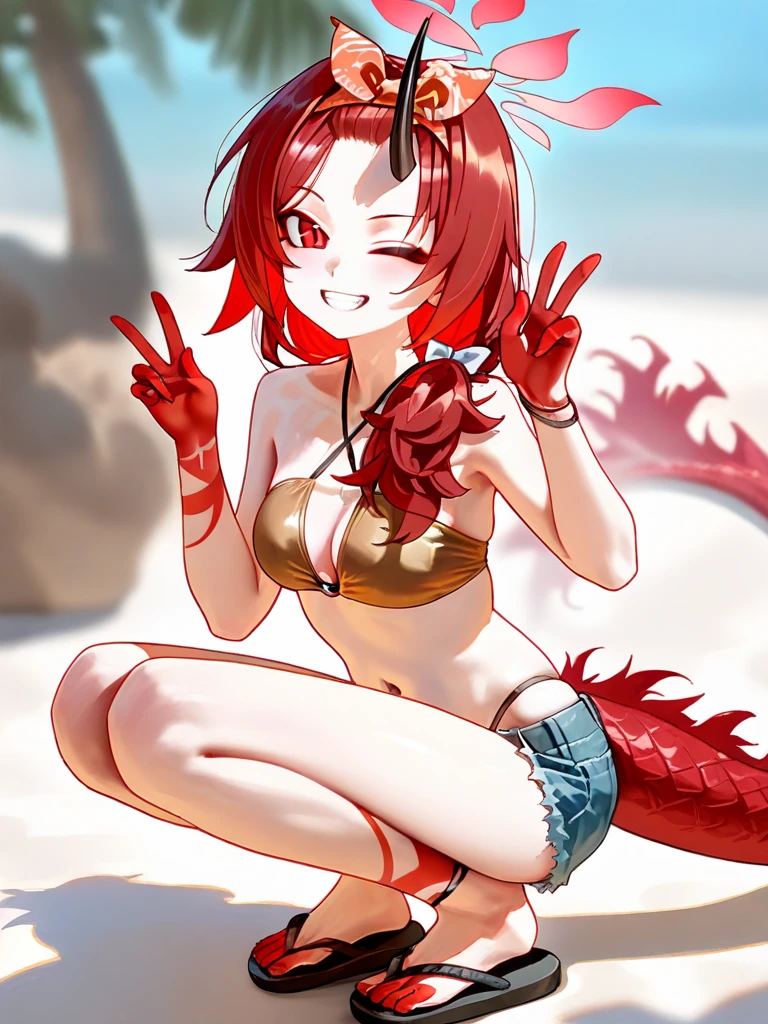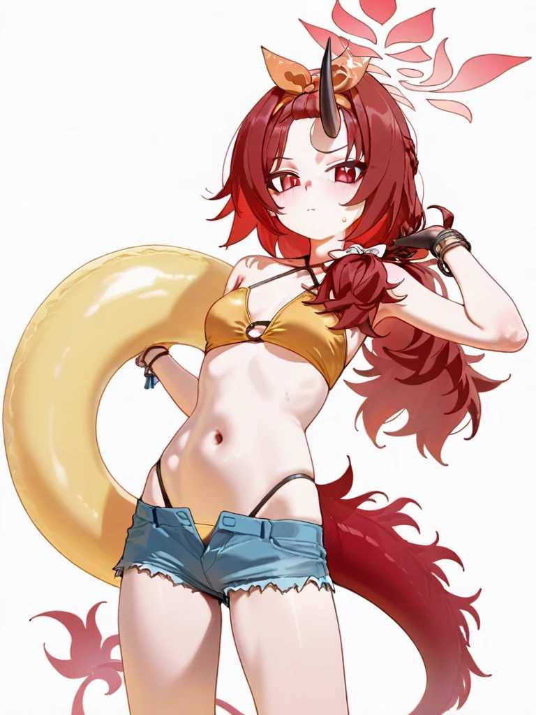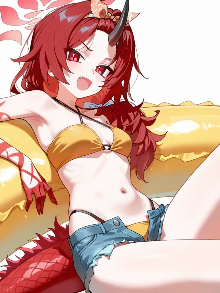 renge (swimsuit) (blue archive), 1girl, solo,renge (swimsuit) (blue archive), 1girl, solo, dragon girl, single horn, red eyes, long hair, red hair, small breasts, n bikini under shorts, blue shorts, denim shorts, official alternate costume, yellow bikini, red halo, 训练模型:ILL V0.1