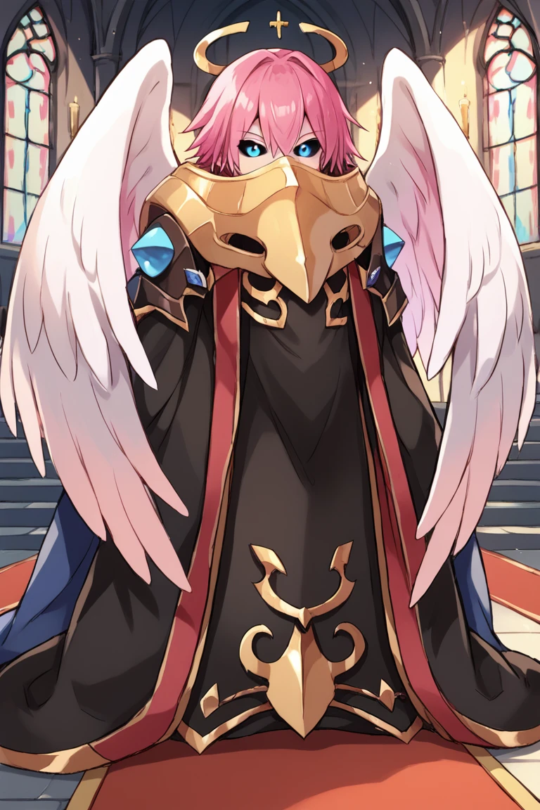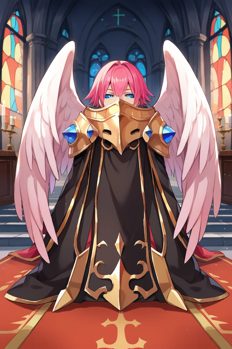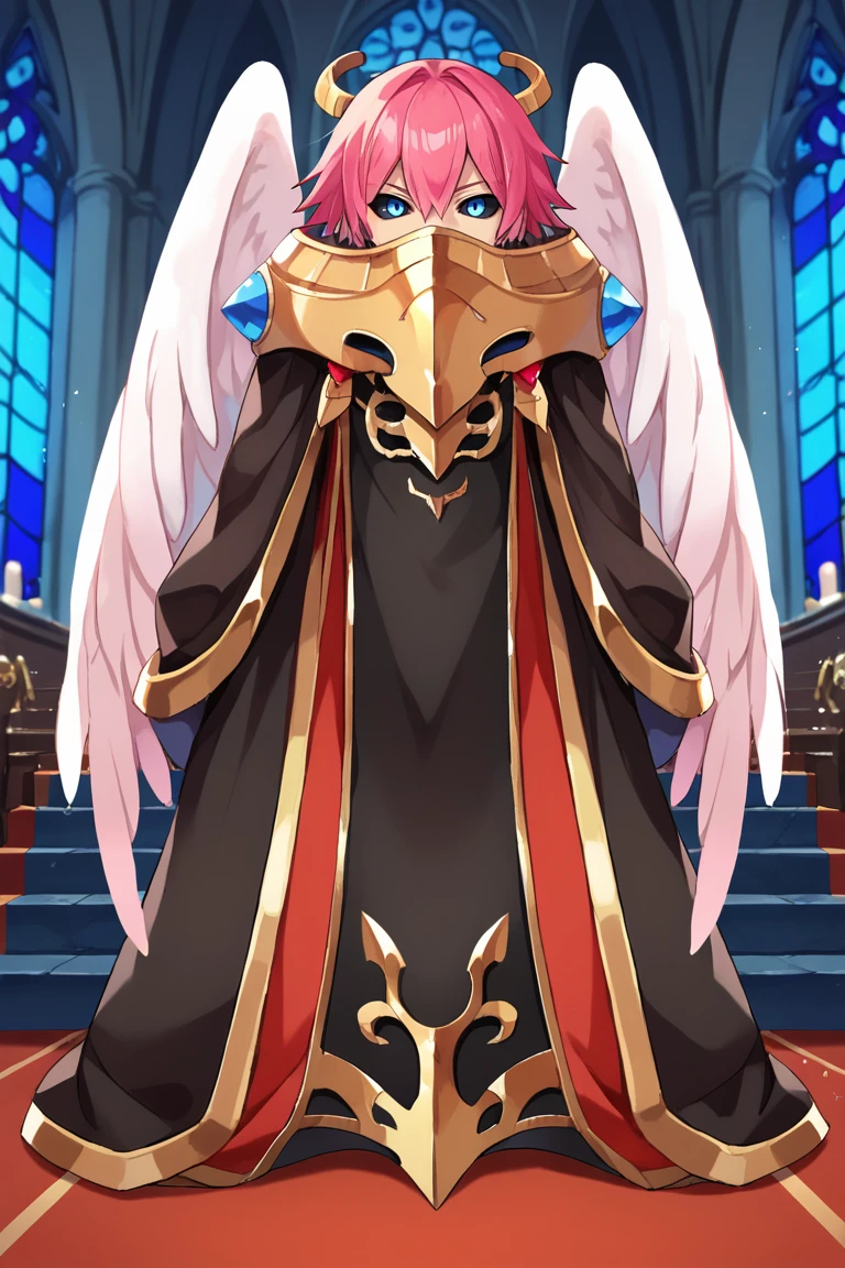 Helpful Tags: 1boy, pink hair, blue eyes:0.2, black sclera:0.2, wings, angel wings, feathered wings, armor, shoulder armor, robe, mask, gold trim, covered mouth