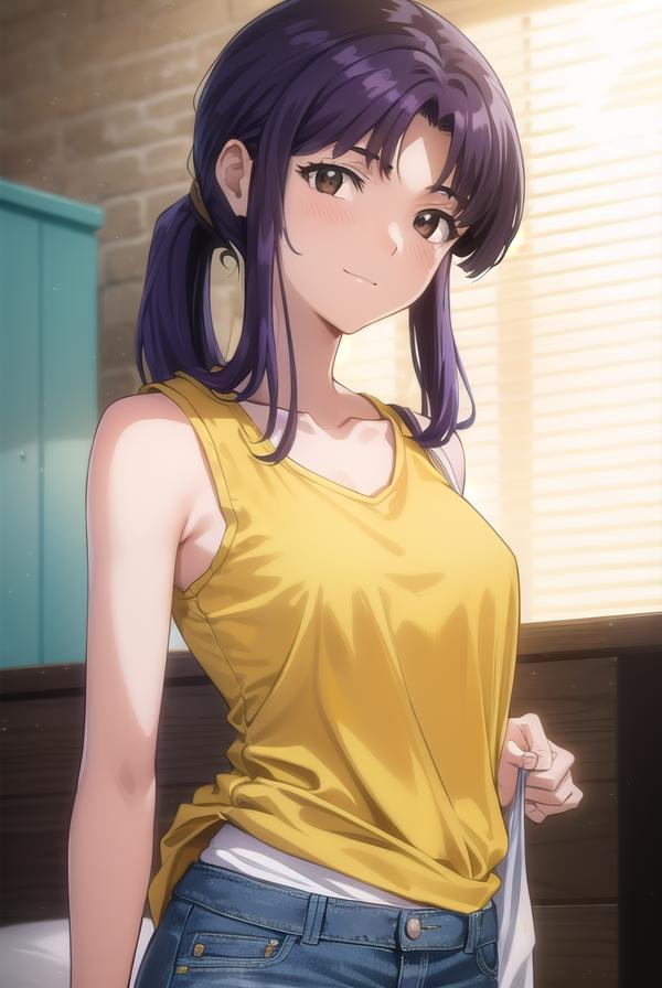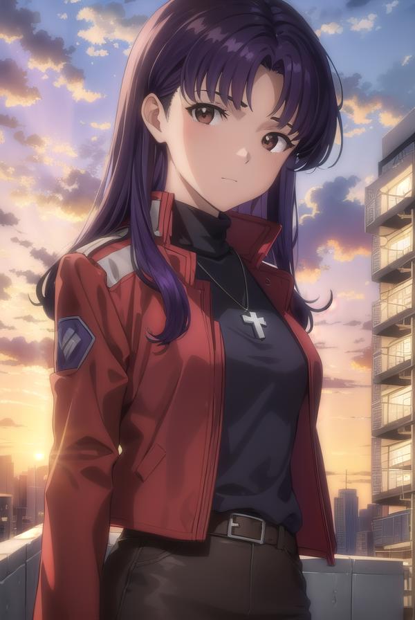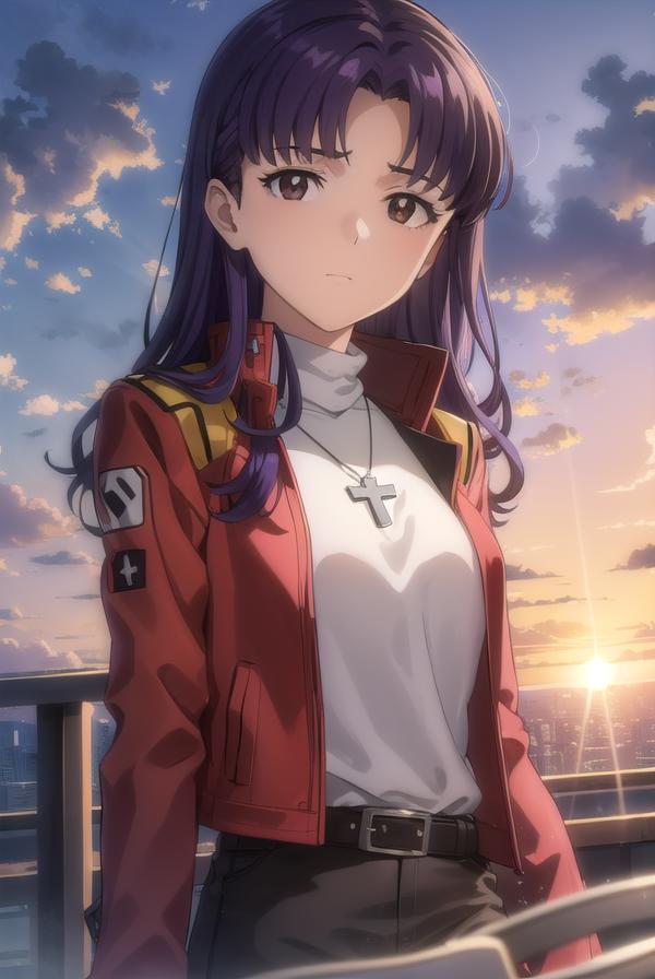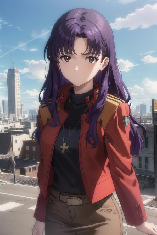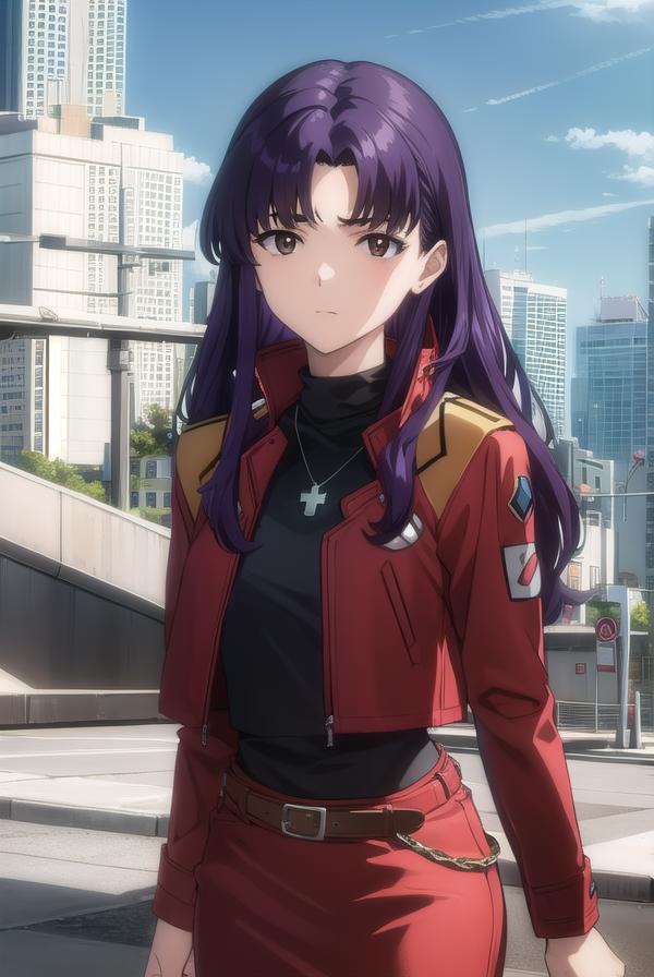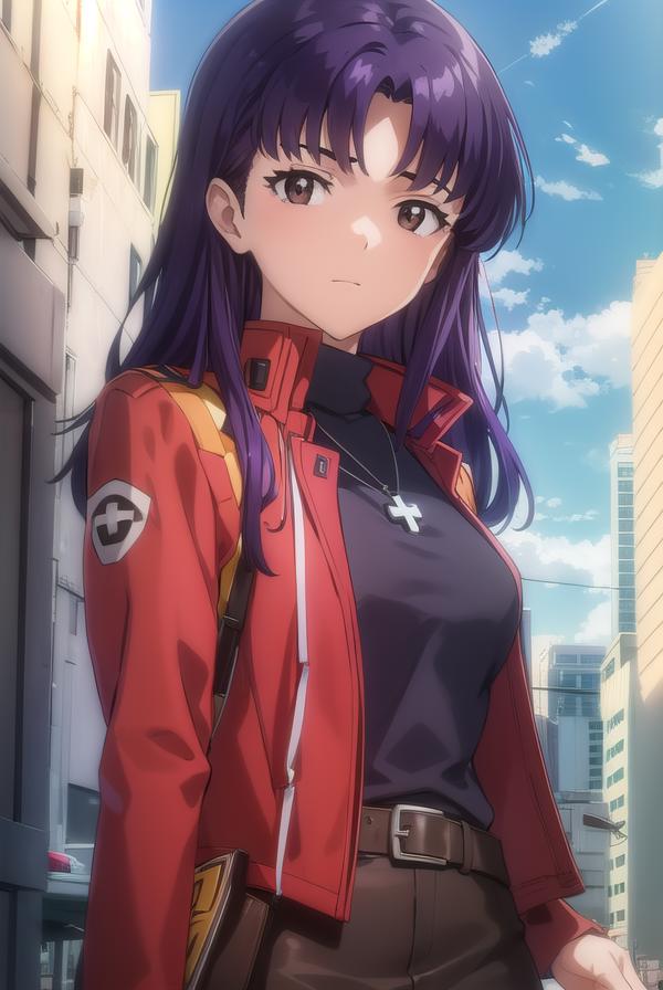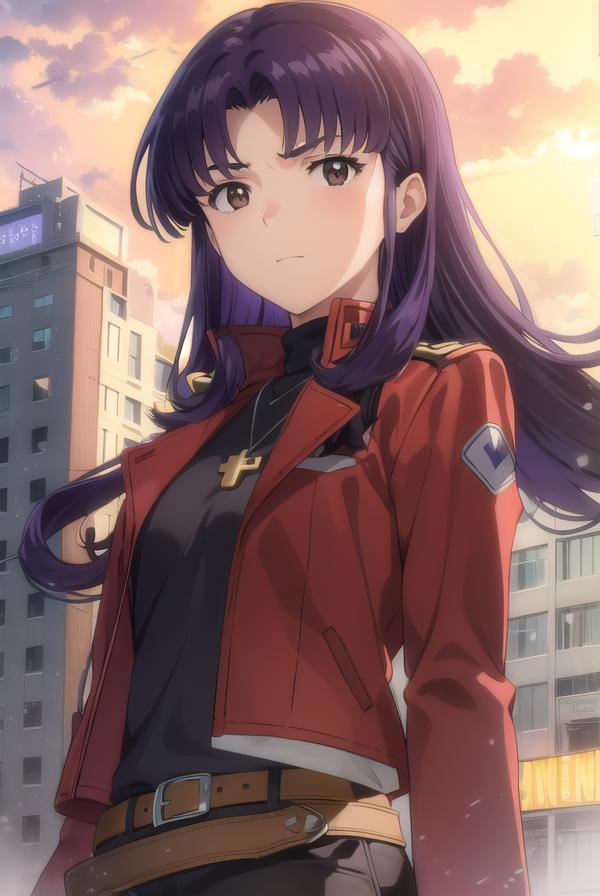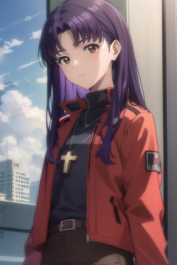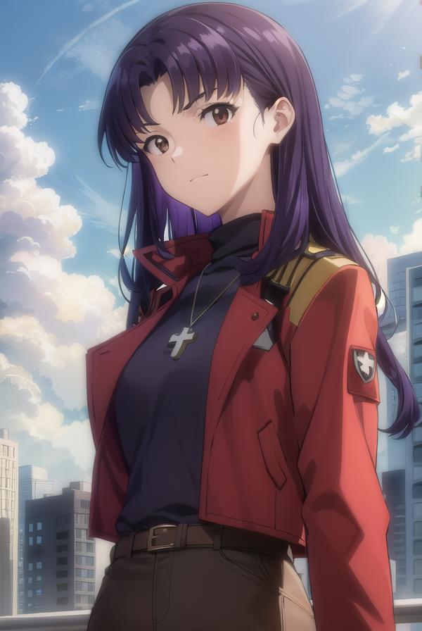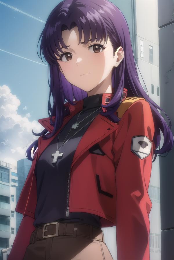 misato katsuragi, long hair, (brown eyes:1.5), (purple hair:1.2), (parted bangs:1.5),