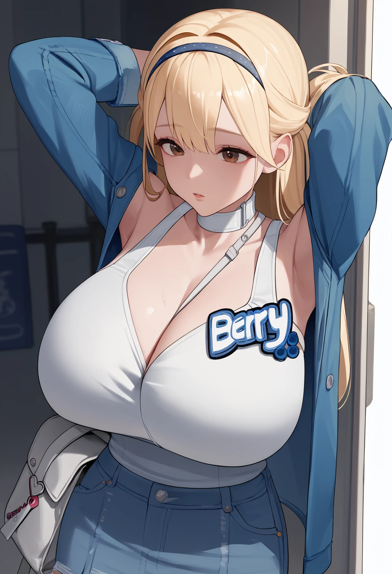 tiadate, brown eyes, blonde hair, long hair, hair band, white choker, huge breasts, cleavage, white tank top, badge, blue jacket, long sleeves, denim skirt, shoulder bag, multiple rings