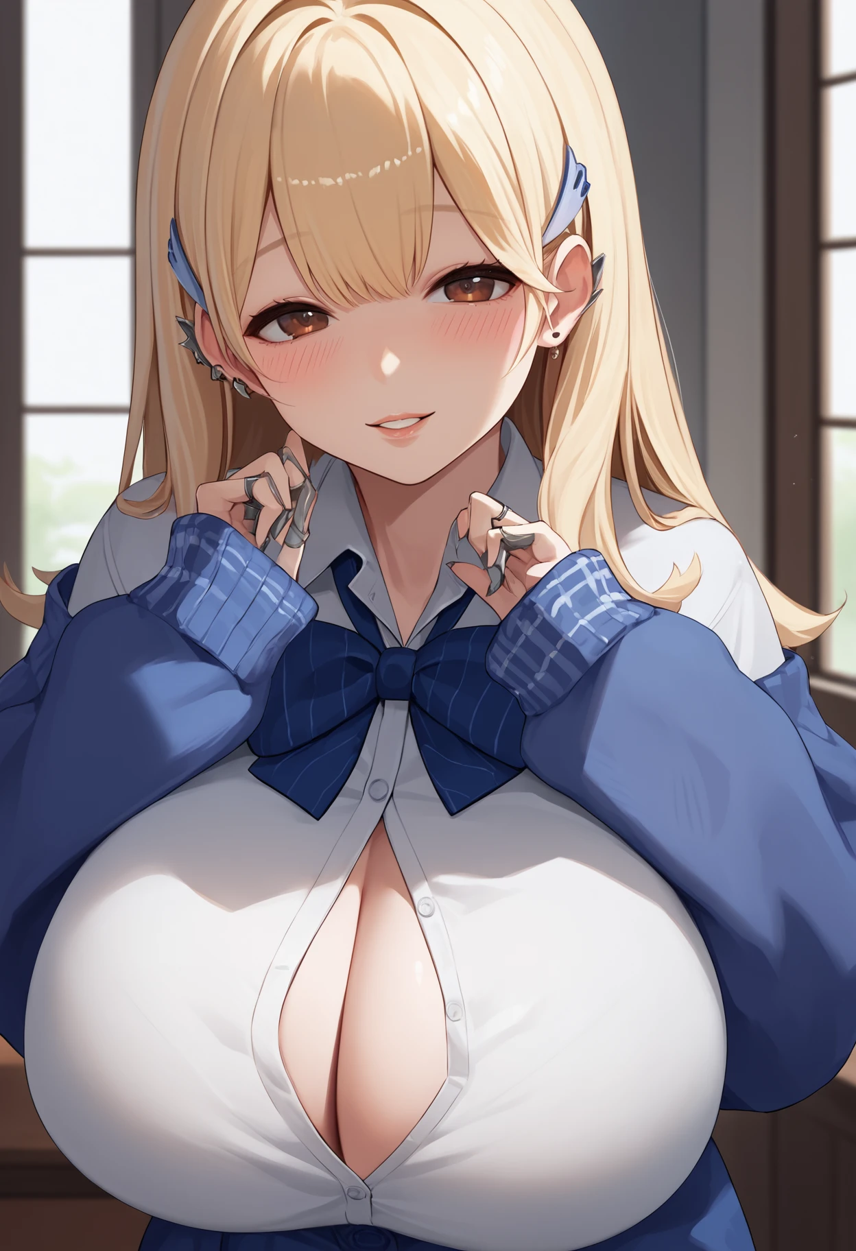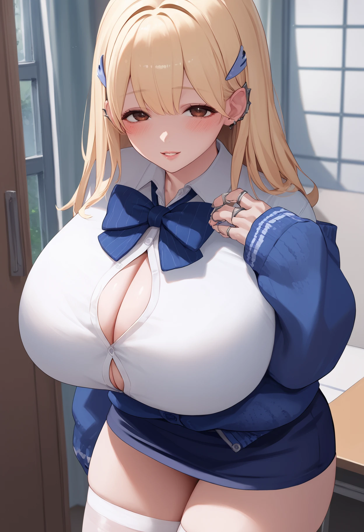 tiadef, brown eyes, blonde hair, long hair, hair ornament, ear piercing, huge breasts, white shirt, cleavage, button gap, blue bowtie, blue cardigan, sleeves past wrists, blue skirt, multiple rings, black nails, white thighhighs, hip pouch