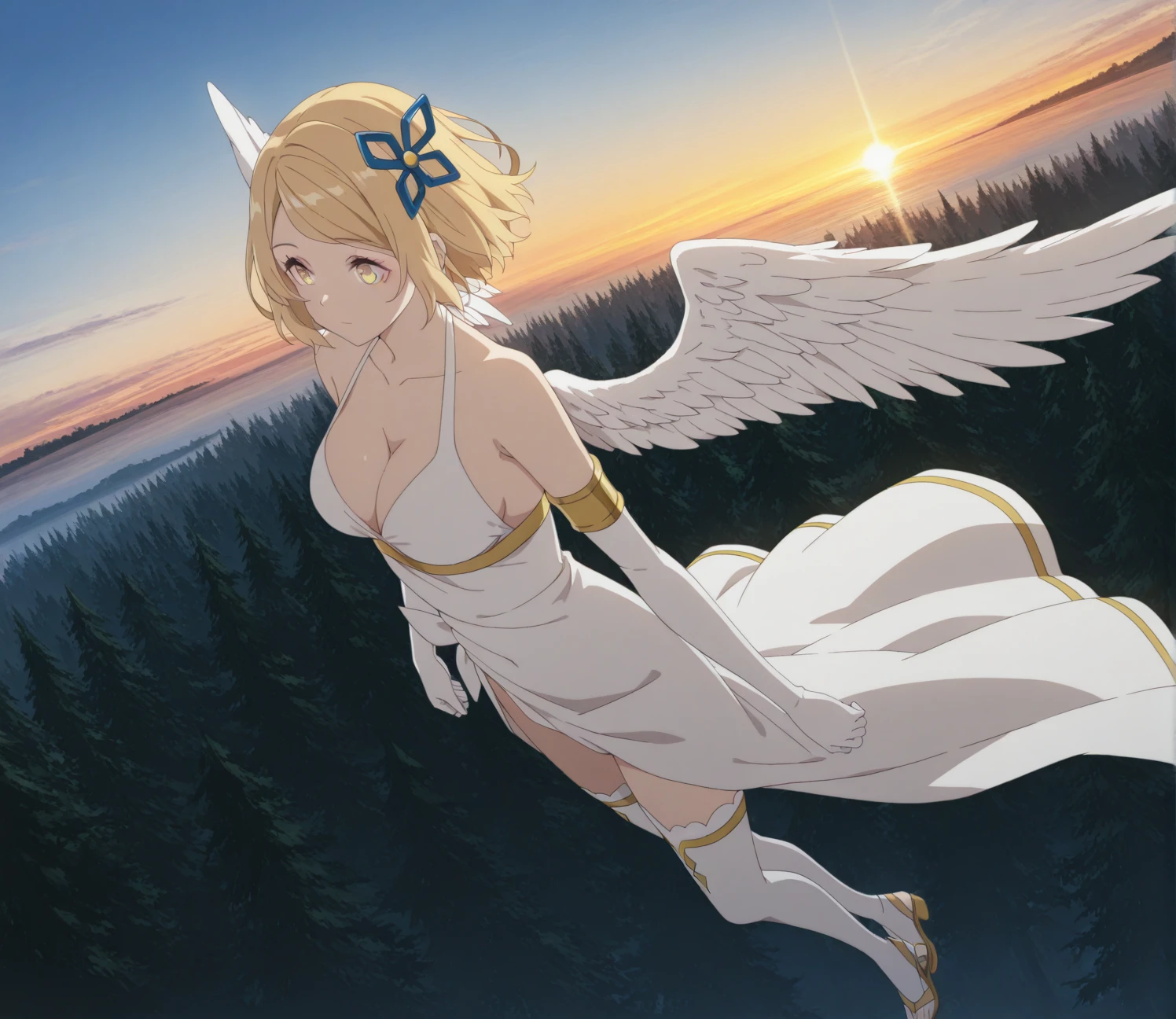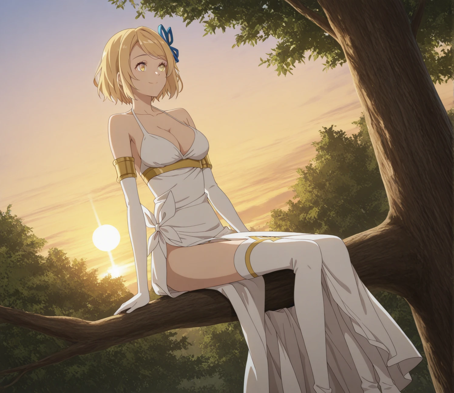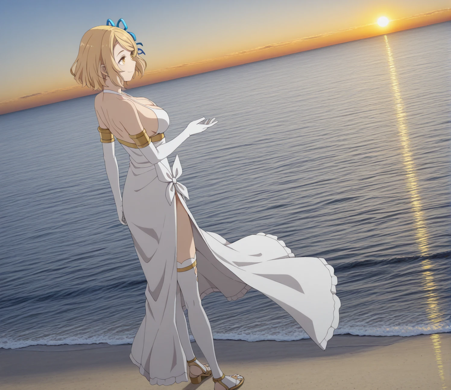 Clothes: (white dress, left slit, cleavage, bare shoulders, white gloves, thighhigh sandals)