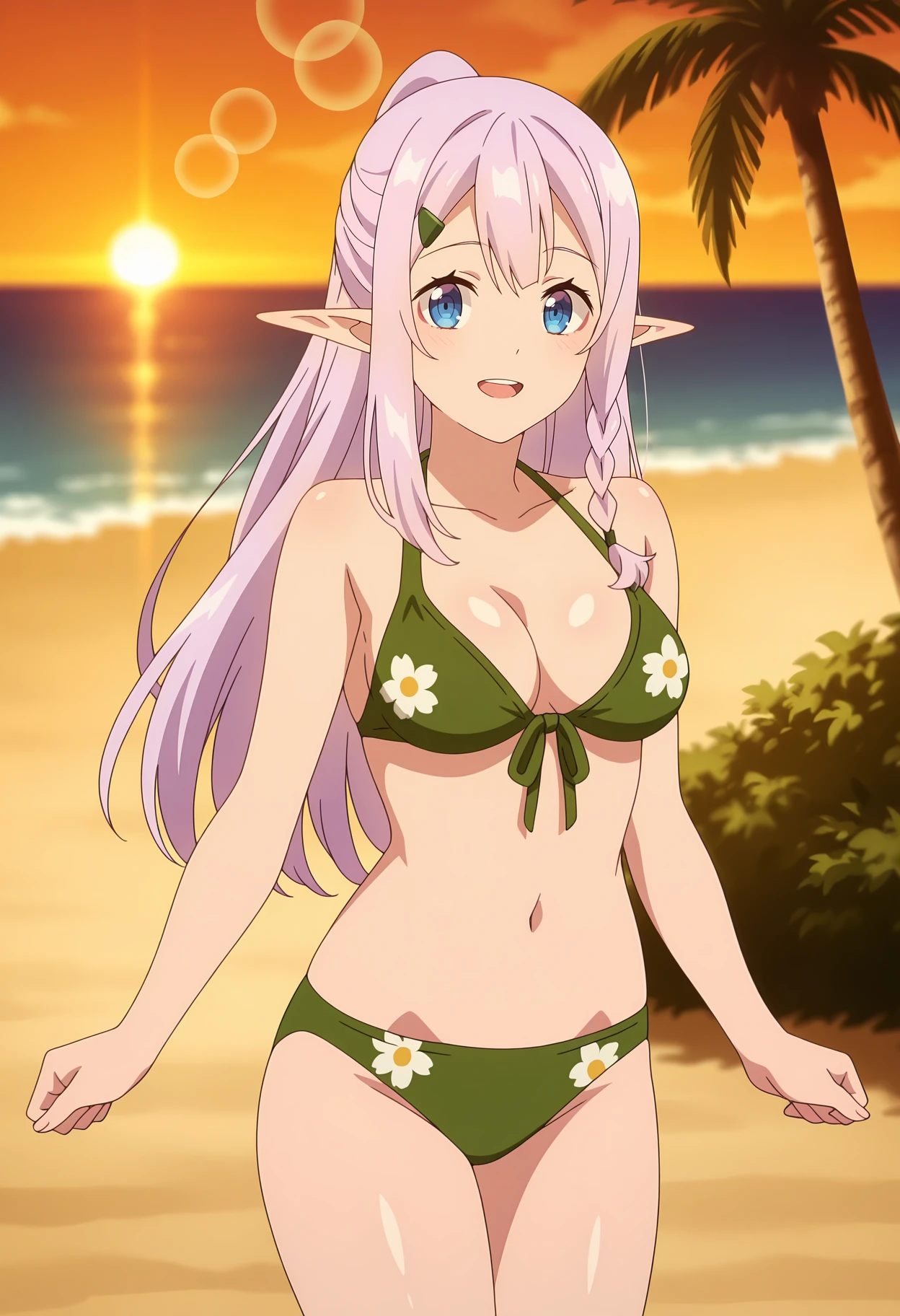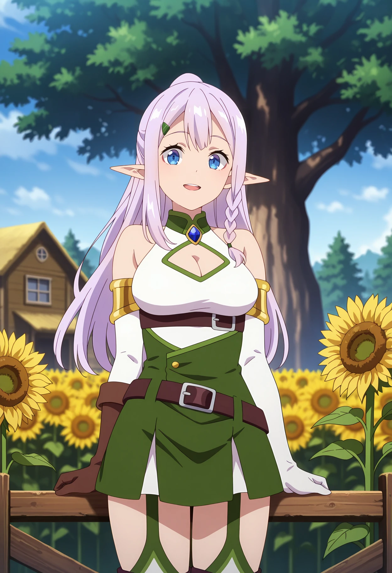 ponytail, light purple hair, long hair, side braid, blue eyes, pointy ears, hairclip