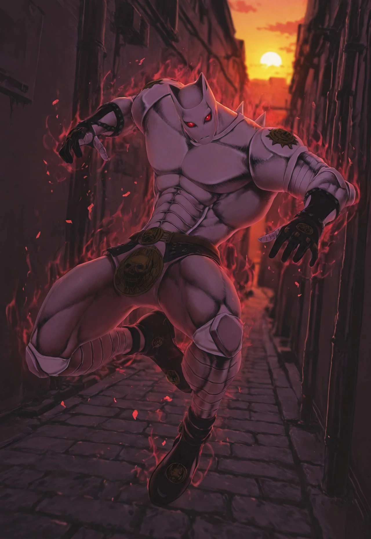 Tags: killerqueen3d, 1boy, stand (jojo), pink skin, cat ears, red sclera, slit pupils, gloves, belt, skirt, sandals, solo, full body, no humans, 3d, white background, simple background