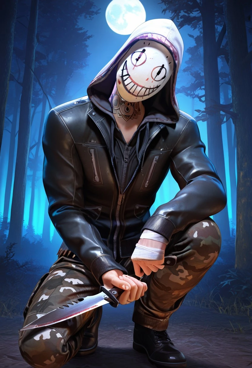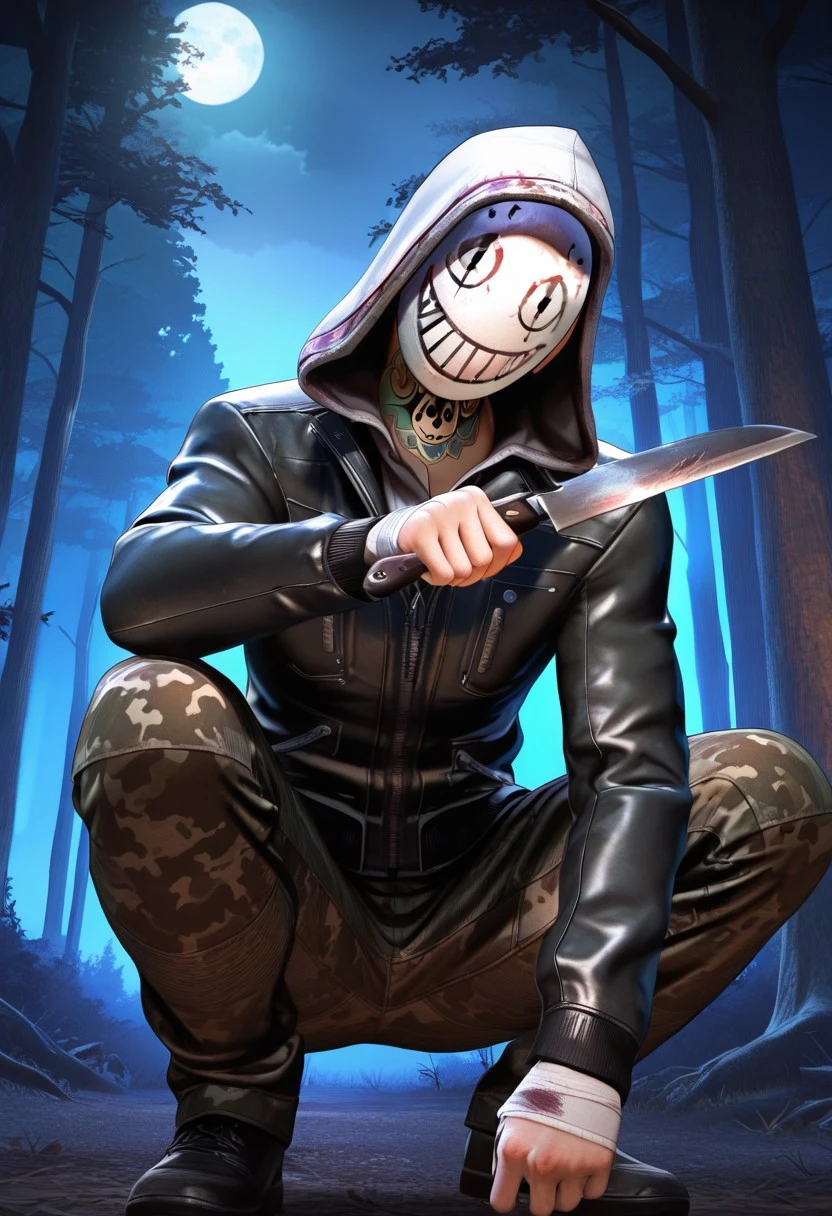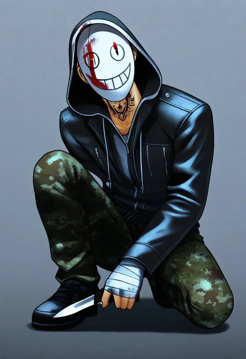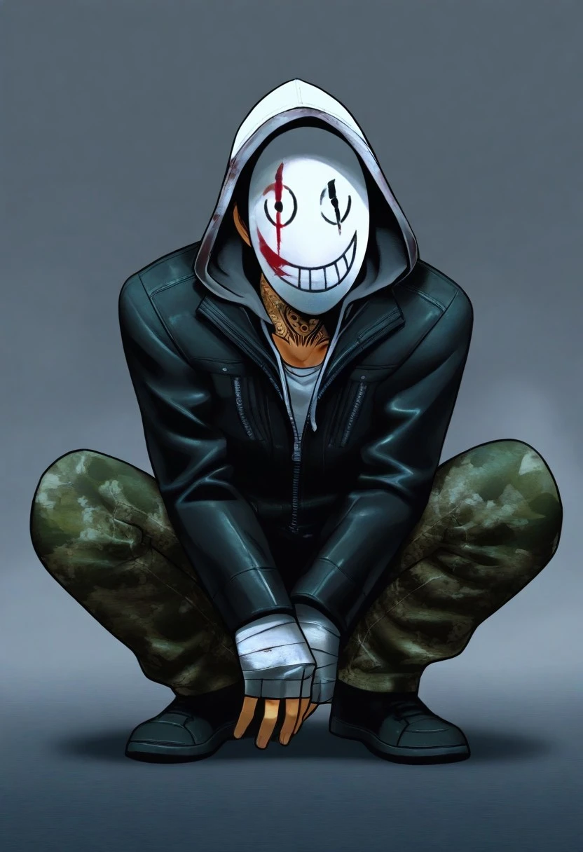 frank_morrison, light skin tone, ((neck tattoo)), leather jacket with spikes underneath, black shoes, white hood, bandaged hands, white socks, ((white legion mask, wearing a white mask, masked men, mask quality focus)), camo pants,