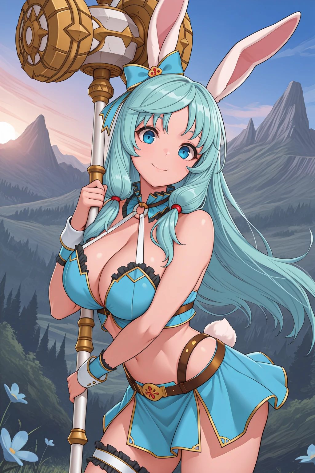 sh3a, large breasts, rabbit ears, rabbit tail, blue eyes, aqua hair, low-tied sidelocks, long hair, hair bow, blue bow