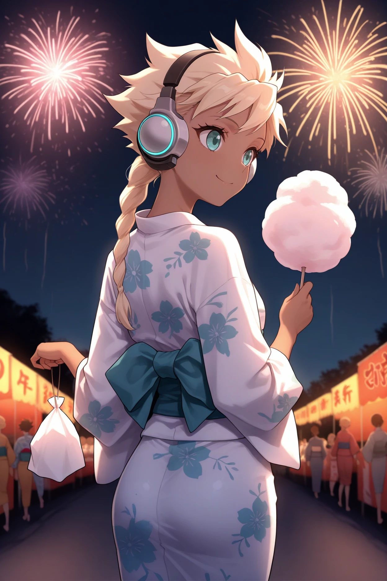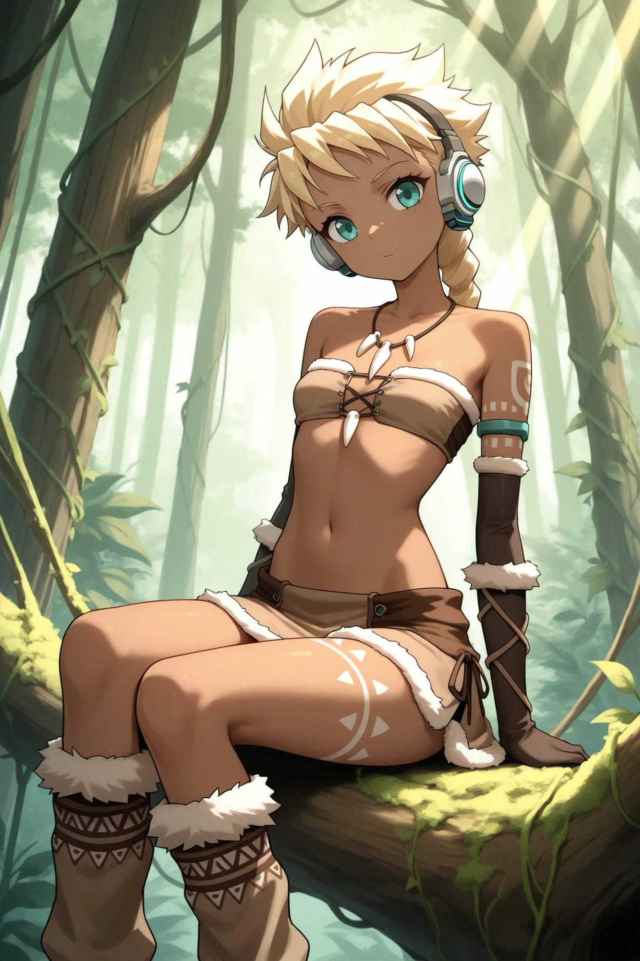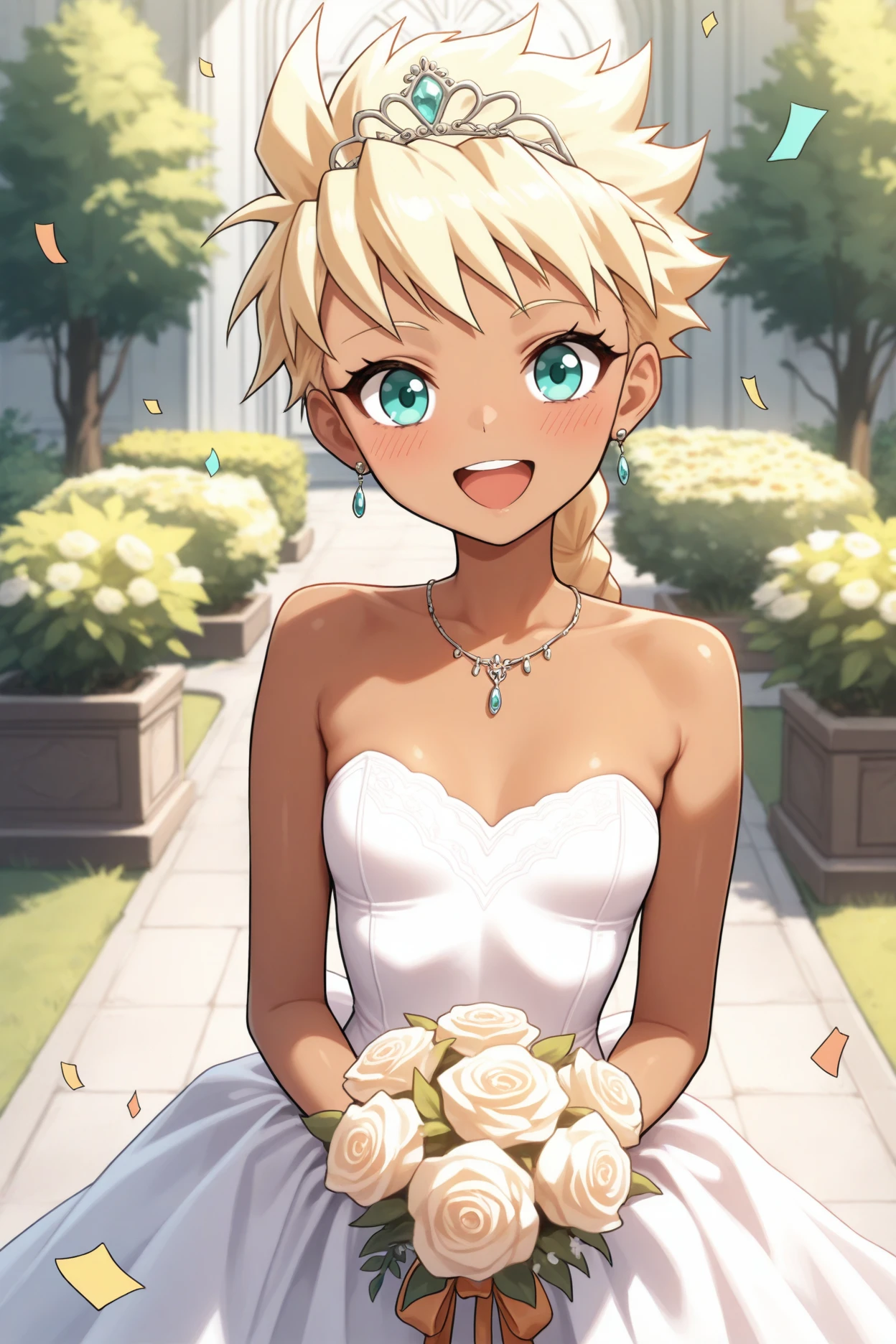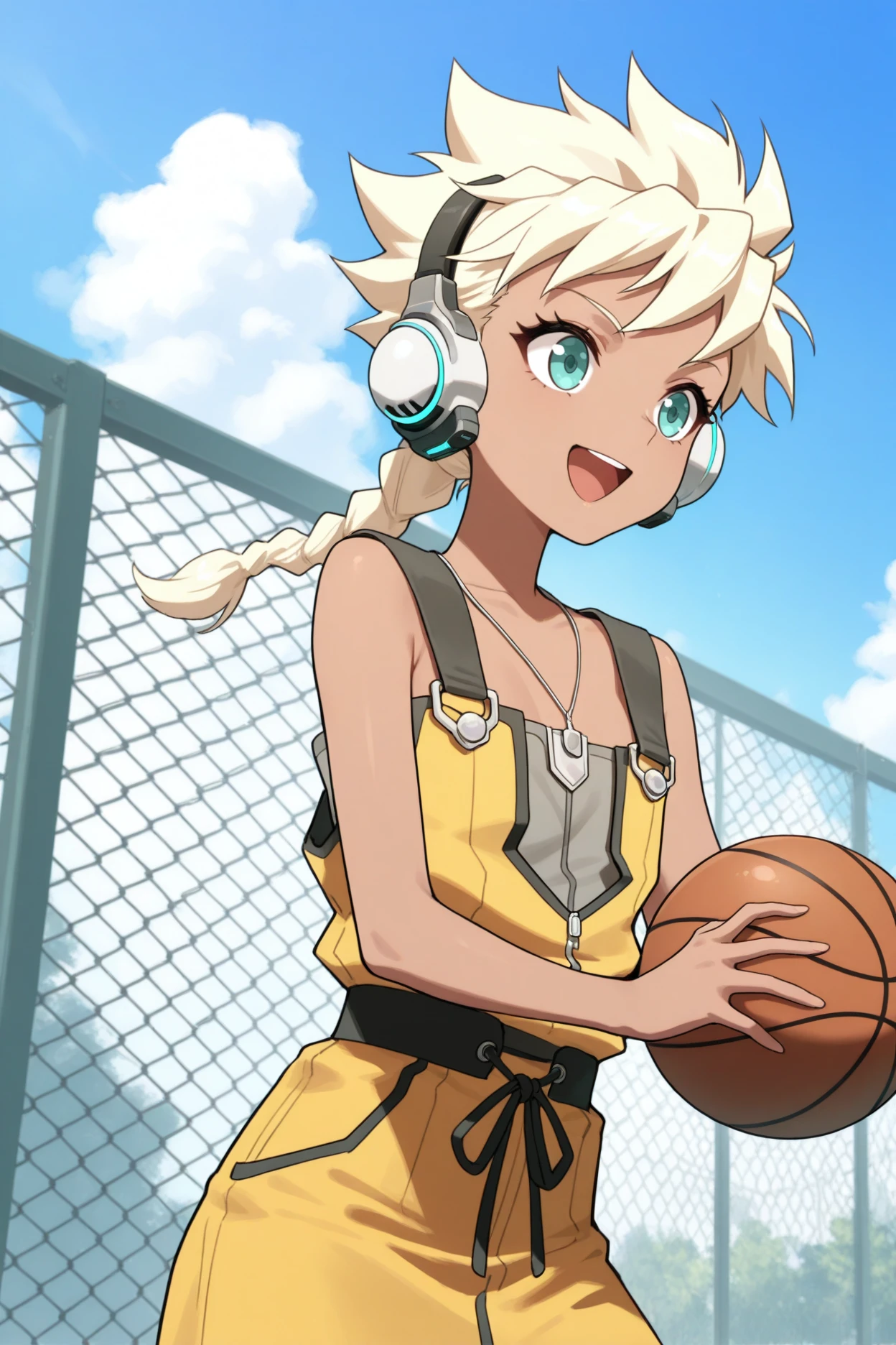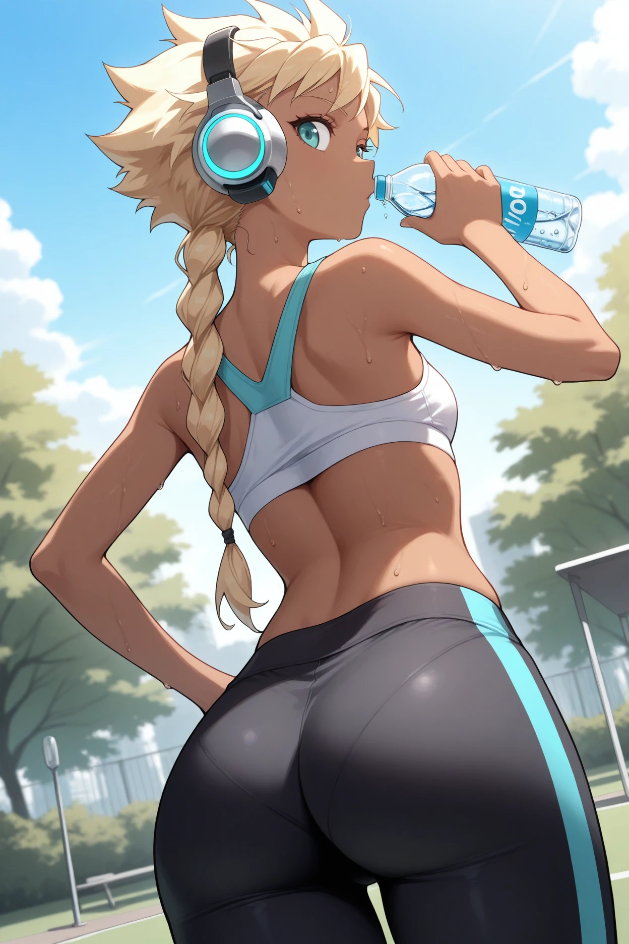 sdmbsq, dark-skinned female, blonde hair, braided ponytail, spiked hair, aqua eyes