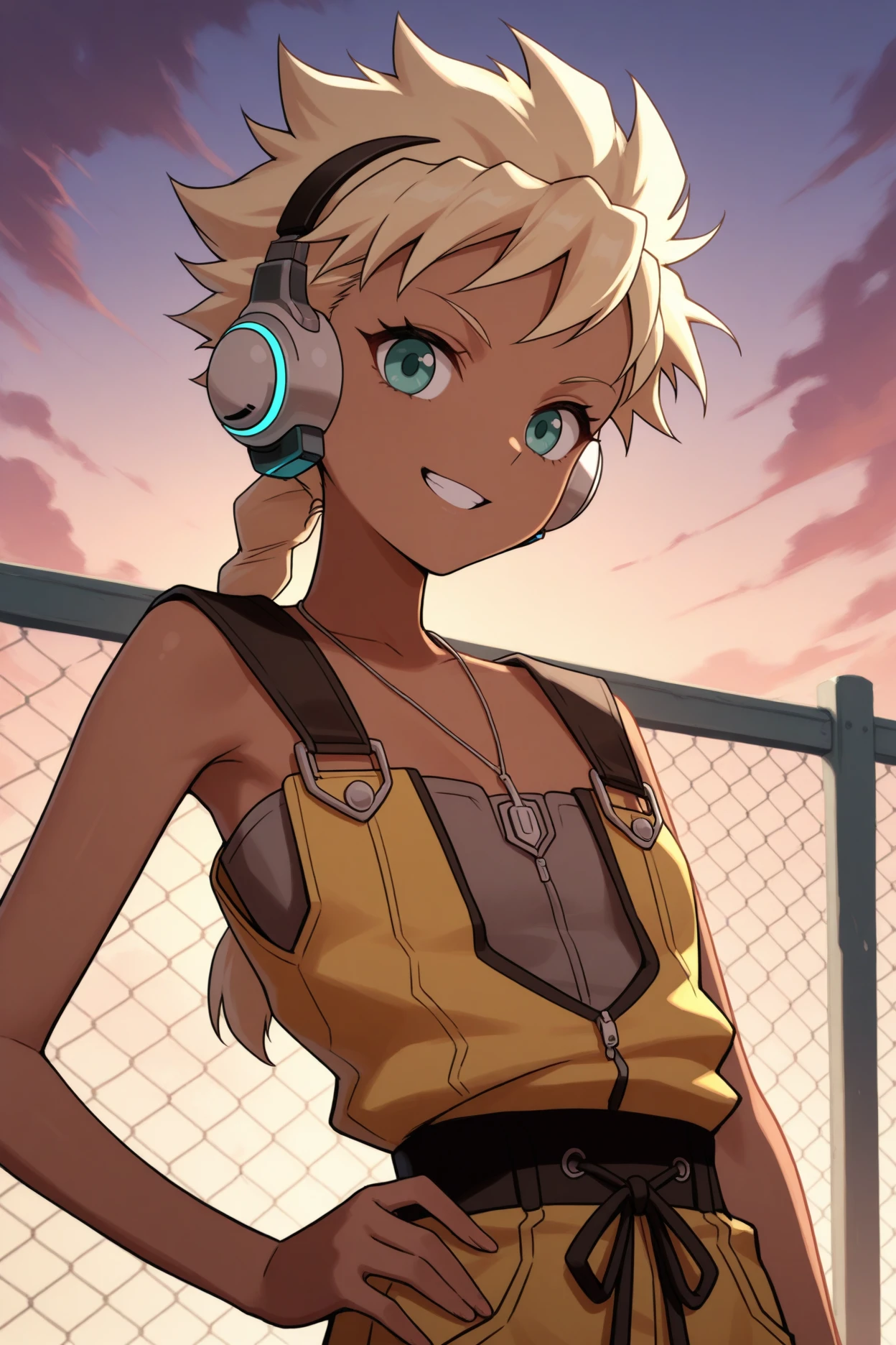 - sdmbsq, headphones, necklace, yellow pinafore dress, grey strapless shirtTrained on Illustrious 0.1