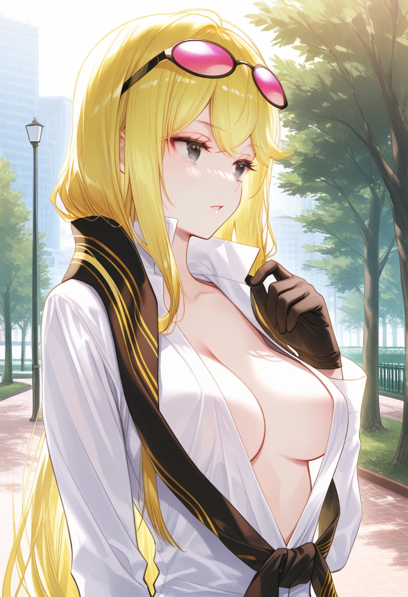 kuremi kyoko, black eyes, blonde hair, long hair, sunglasses, black-framed eyewear, pink-tinted eyewear, eyeware on head, white shirt, black scarf, no bra, black gloves, black shorts, short shorts, grey footwear, high heels