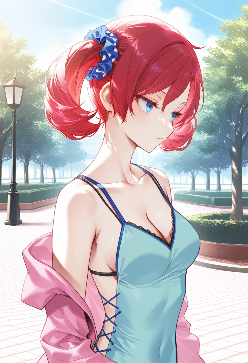 shiramine nokia, blue eyes, red hair, short twintails, hair scrunchie, blue dress, sideless outfit, bare shoulders, blue camisole, short dress, pink jacket, garter straps, grey thighhighs, black footwear, high heels