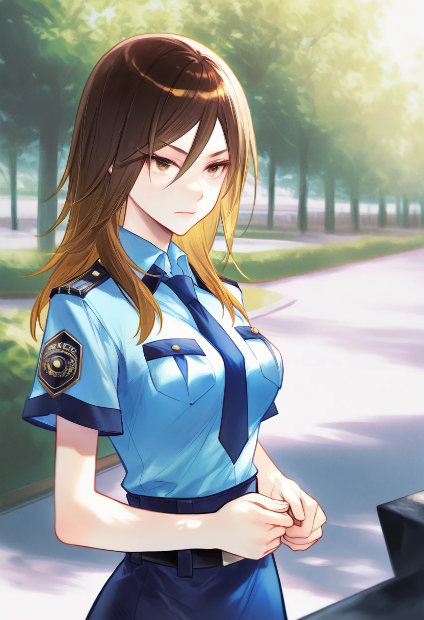date makiko, policewoman, brown eyes, brown hair, medium hair, police uniform, blue shirt, blue necktie, short sleeves, blue skirt, pencil skirt, belt, blue footwear, high heels