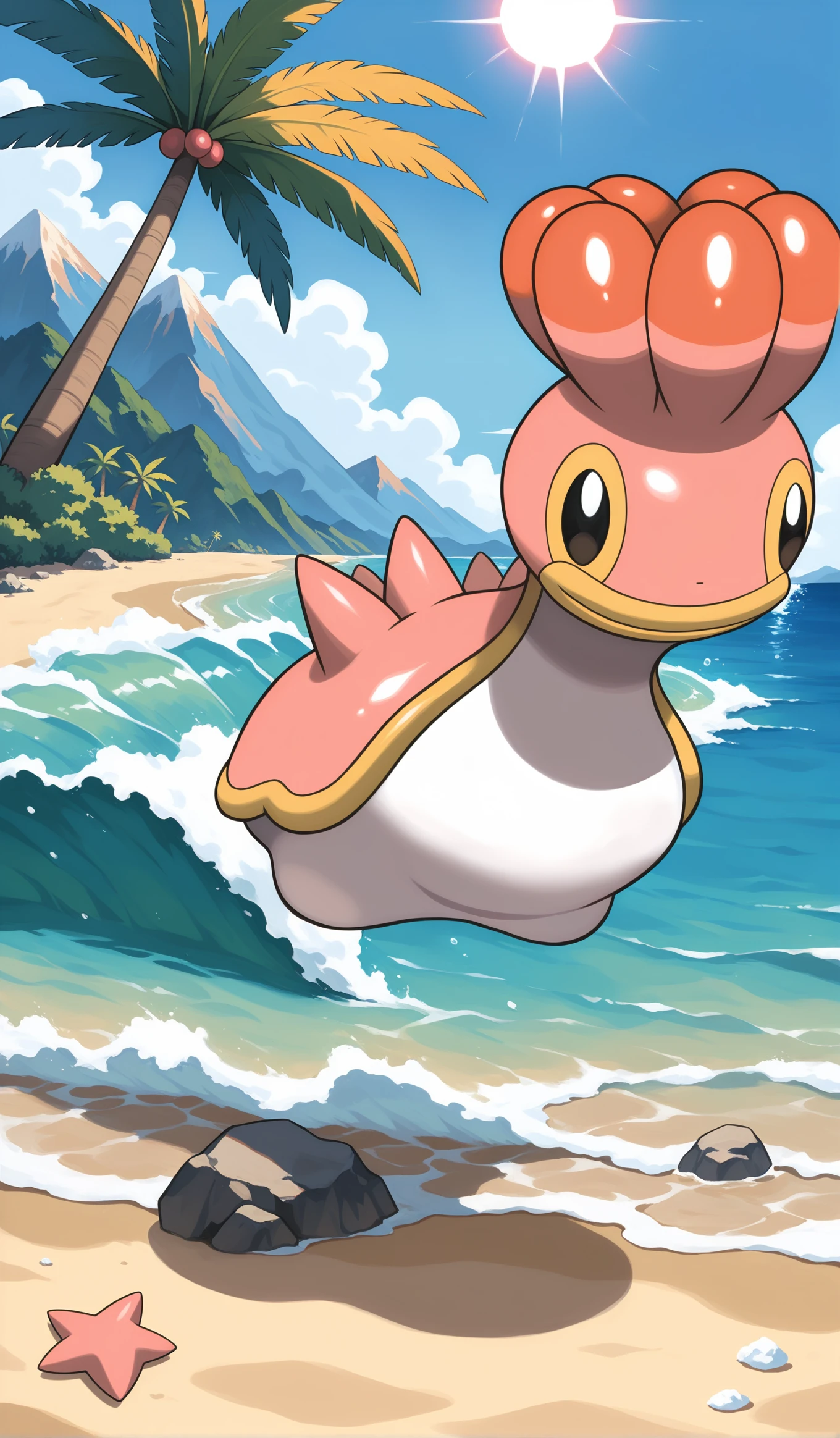 shiny shellos (west sea), pokemon (creature), coral body, cream belly, tan trim, orange head protrusions, black eyes, yellow sclera,