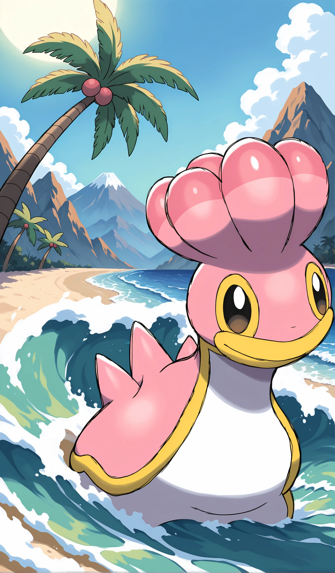 shellos (west sea), pokemon (creature), pink body, white belly, yellow trim, head protrusions, black eyes, yellow sclera,