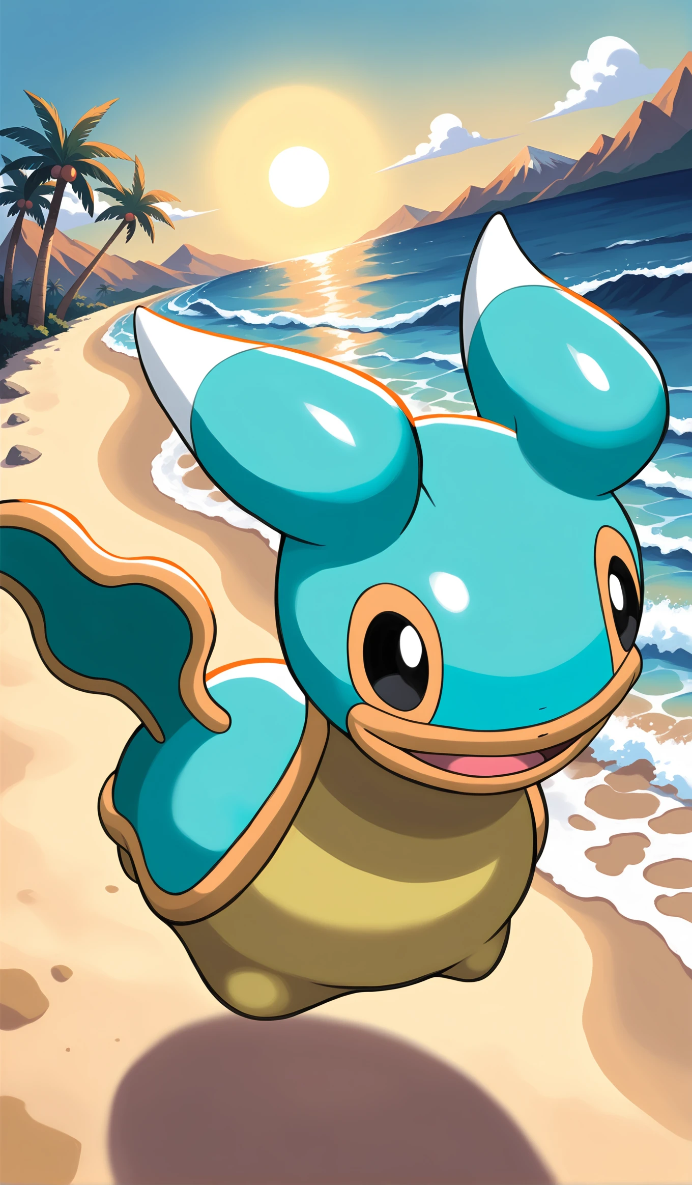 shiny shellos (east sea), pokemon (creature), teal body, olive belly, tan trim, wing-like ears, white horns, black eyes, yellow sclera,