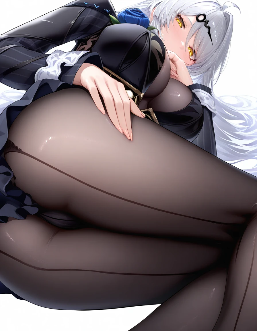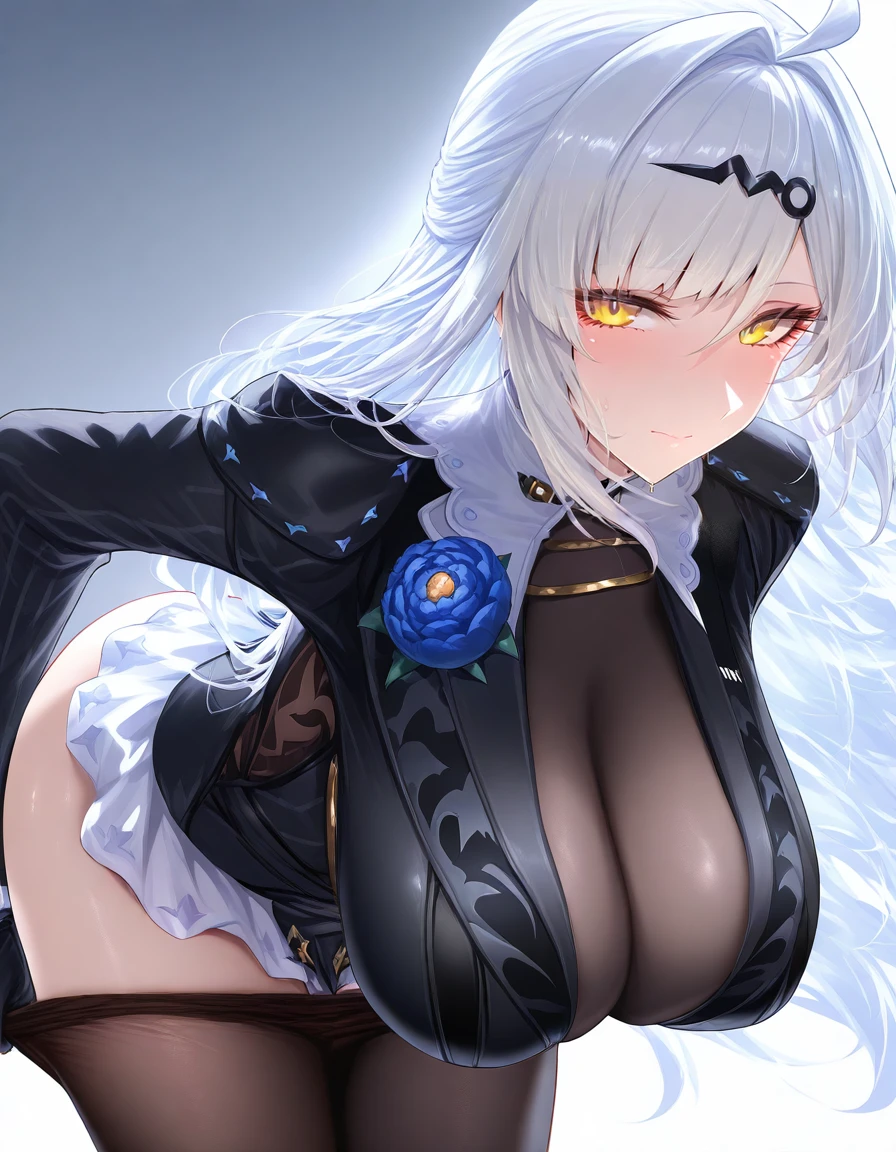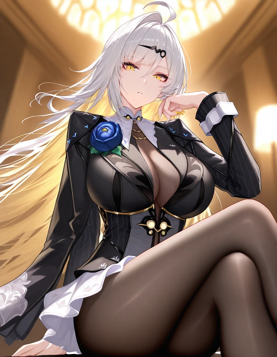 Appearance: ahoge, white hair, very long hair, hair ornament, hairclip, bangs, yellow eyes