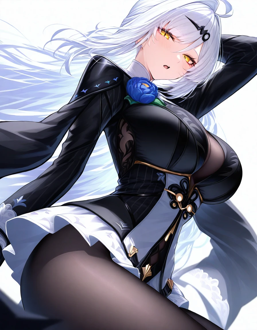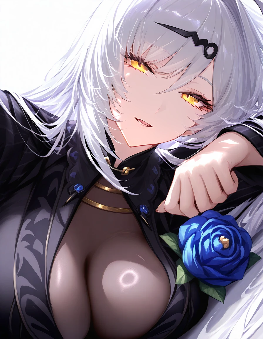 Attire: jewelry, blue rose, blue flower, see-through cleavage, long sleeves, (black jacket, frilled dress, frilled skirt, black skirt, (black bodystocking, black pantyhose)), high heels
