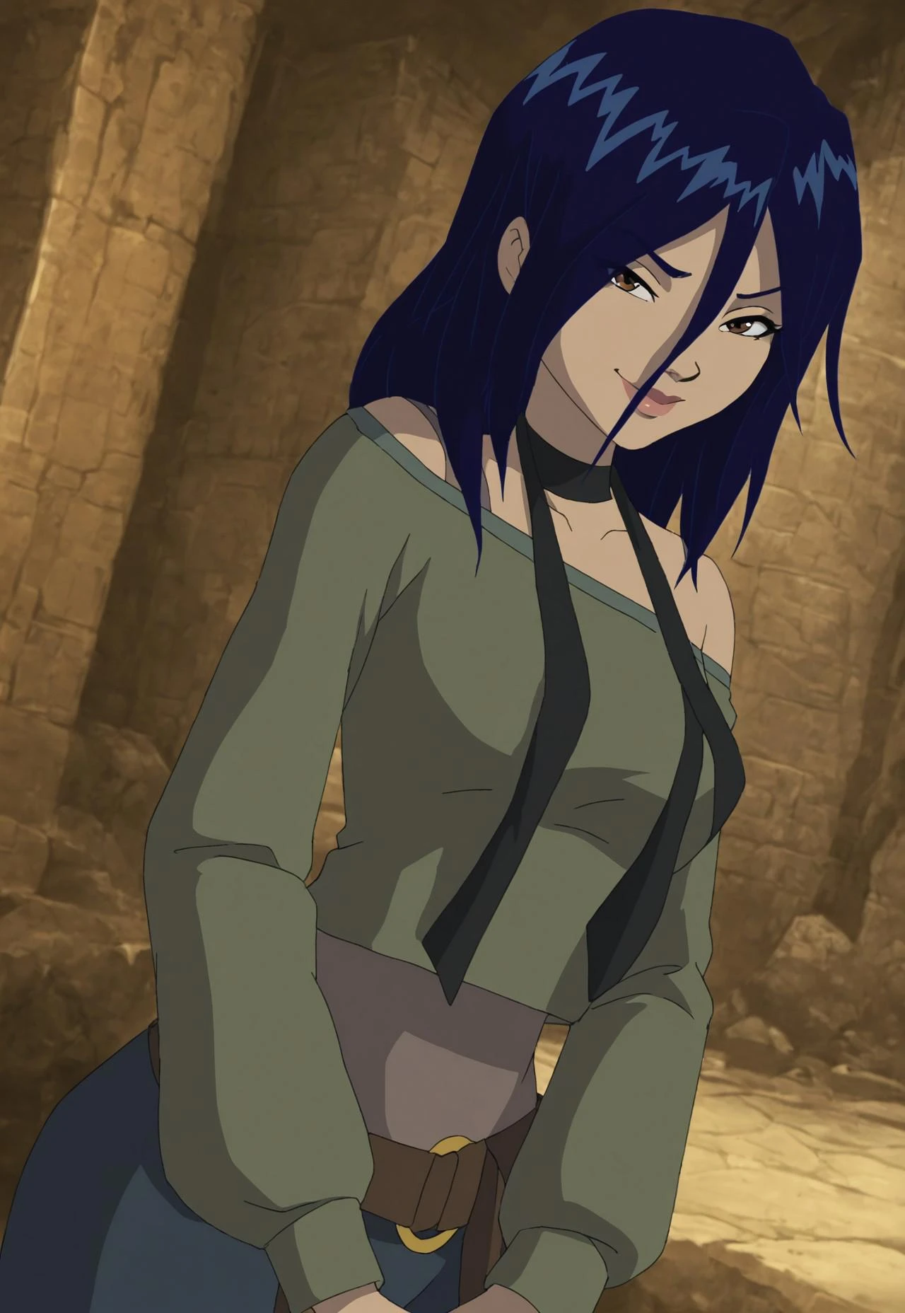 choker, green crop top, off-shoulder, long sleeves, undrshirt, (pants), cropped pants, belt, hip pouch with strap, knee-high dark green heeled boots,Description