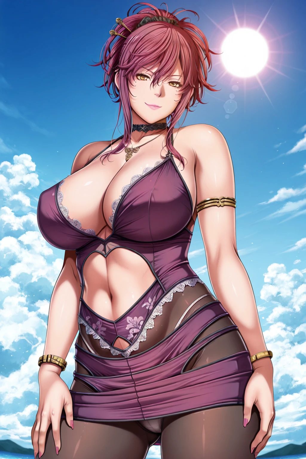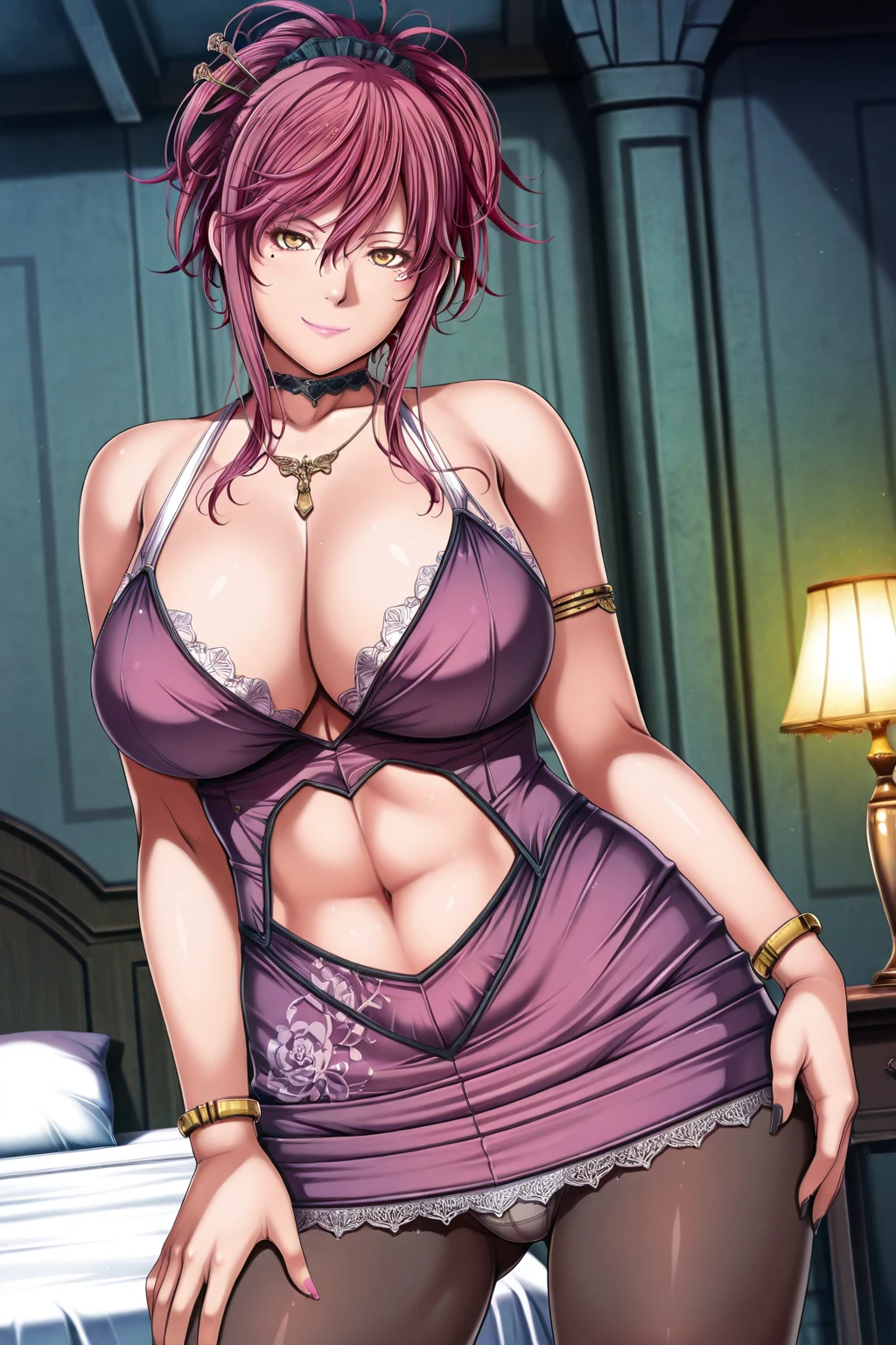 Marie Mamiya, long hair, purple hair, sidelocks, red hair, hair between eyes, ponytail, yellow eyes, large breasts, hair ornament, navel, bare shoulders, necklace, nail polish, white panties, bracelet, black pantyhose, see-through, clothing cutout, mole under eye, sleeveless dress, black choker, makeup, halterneck, lipstick, lace trim, purple dress, armlet, long fingernails, purple skirt, panties under pantyhose, pink lips, hair stick, navel cutout, hair up, lace-trimmed dress, marie's dress, mature female