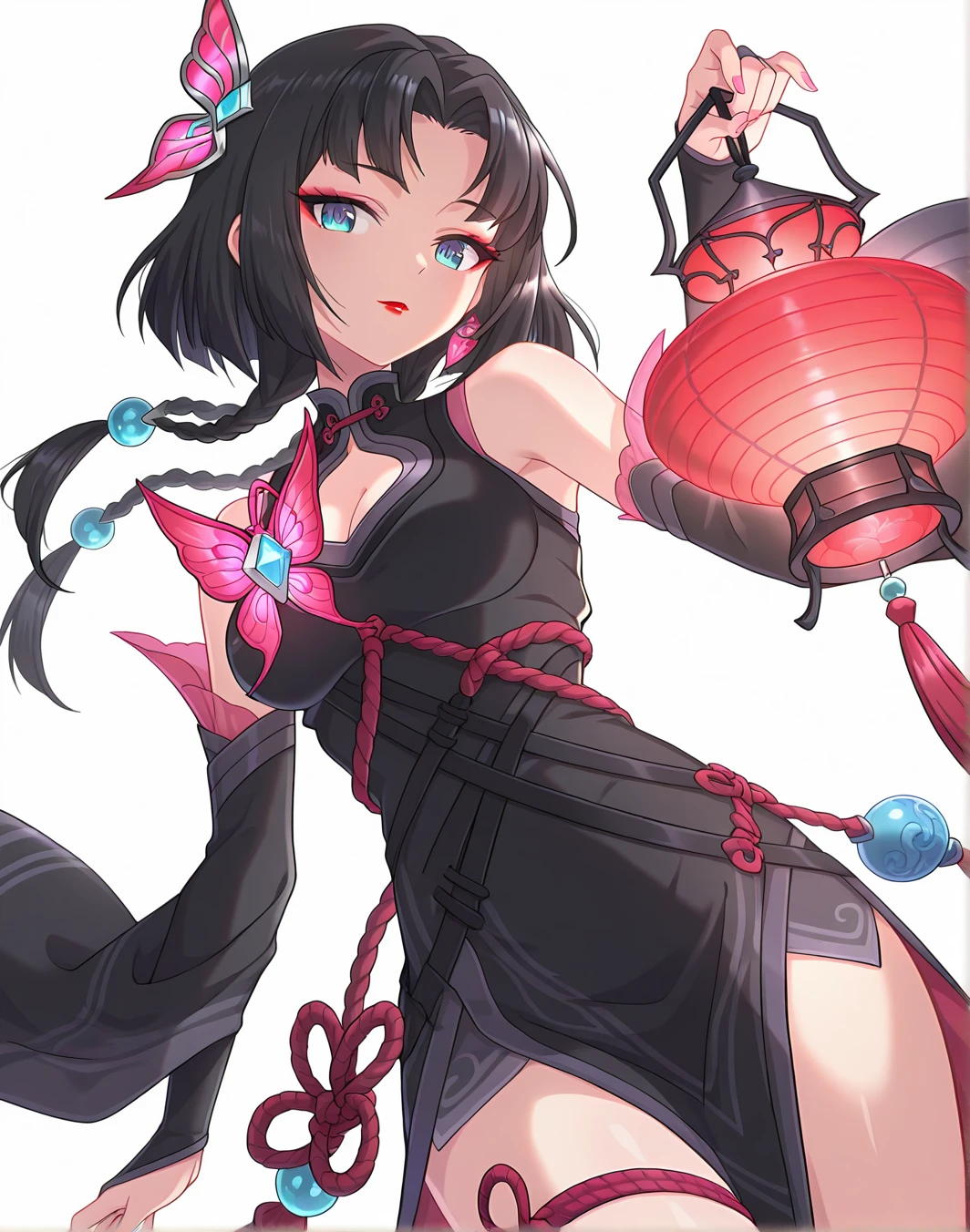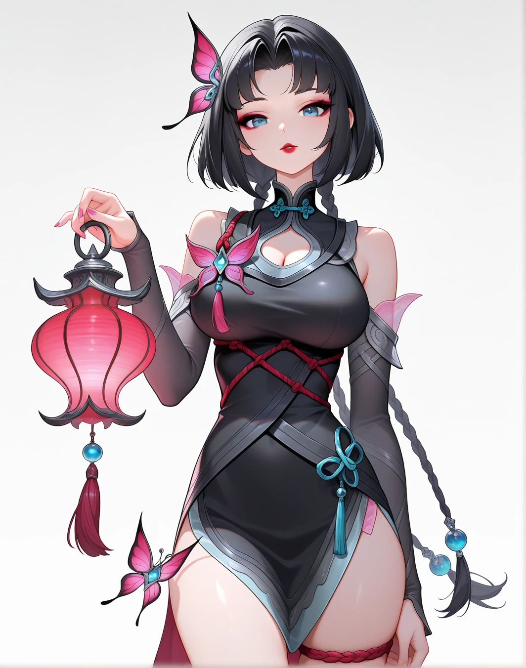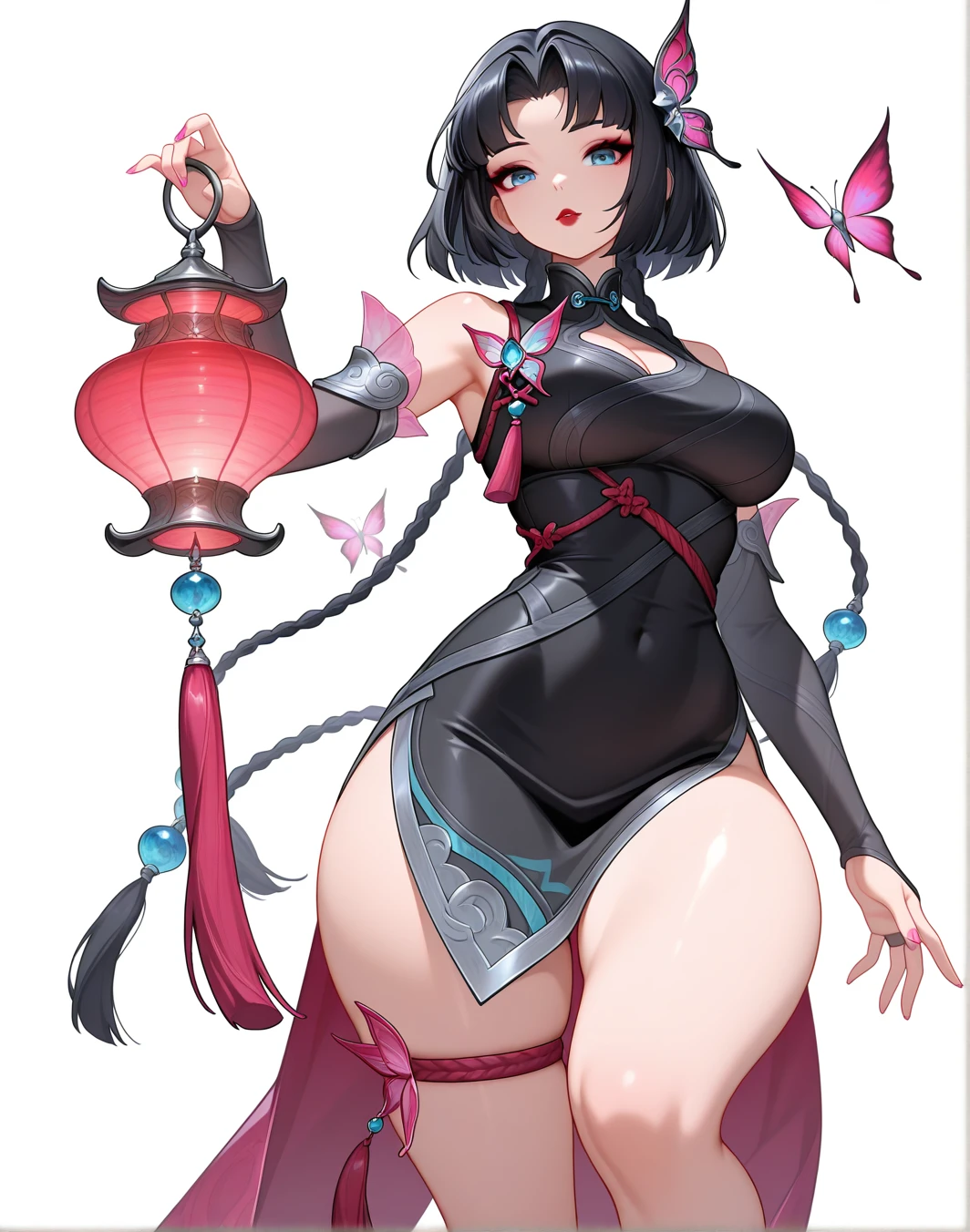 Prompt: Zhuxin-Liver020, 1girl, solo, short hair, long hair, black hair, blue eyes, large breasts, bare shoulders, braid, twin braids, hair ornament, dress, black dress, clothing cutout, cleavage cutout, detached sleeves, holding lantern, thigh strap, butterfly, lantern, makeup, lipstick, eyeshadow, red lips, pink nails, nail polish, rope, japanese clothes, chinese clothes, bridal gauntlets