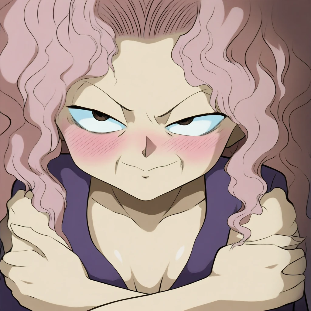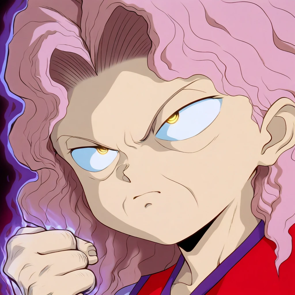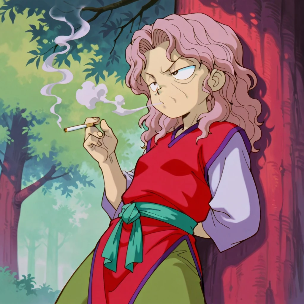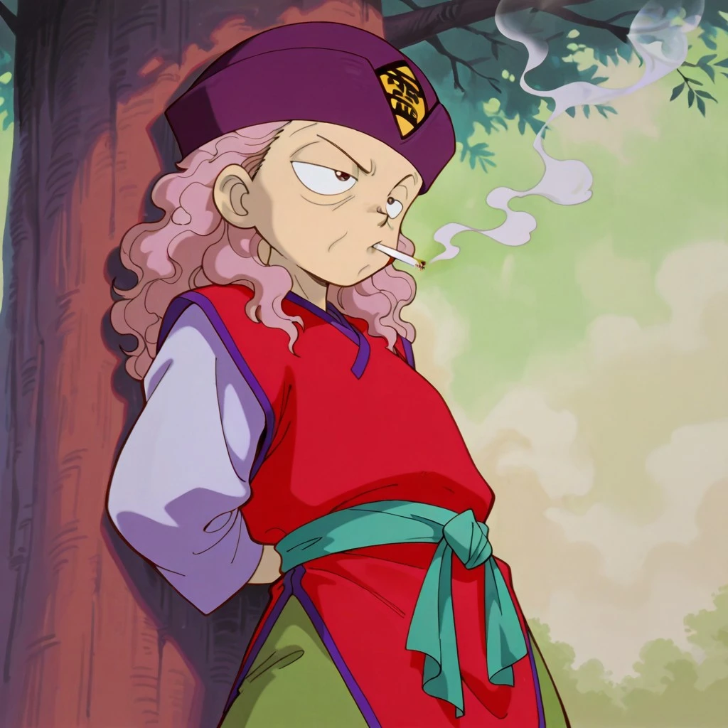 mature female, solo, short, wavy dark pink hair, hazel eyes, wrinkles, red martial arts tunic with white sleeves, green pants, tied green belt, purple martial arts cap,