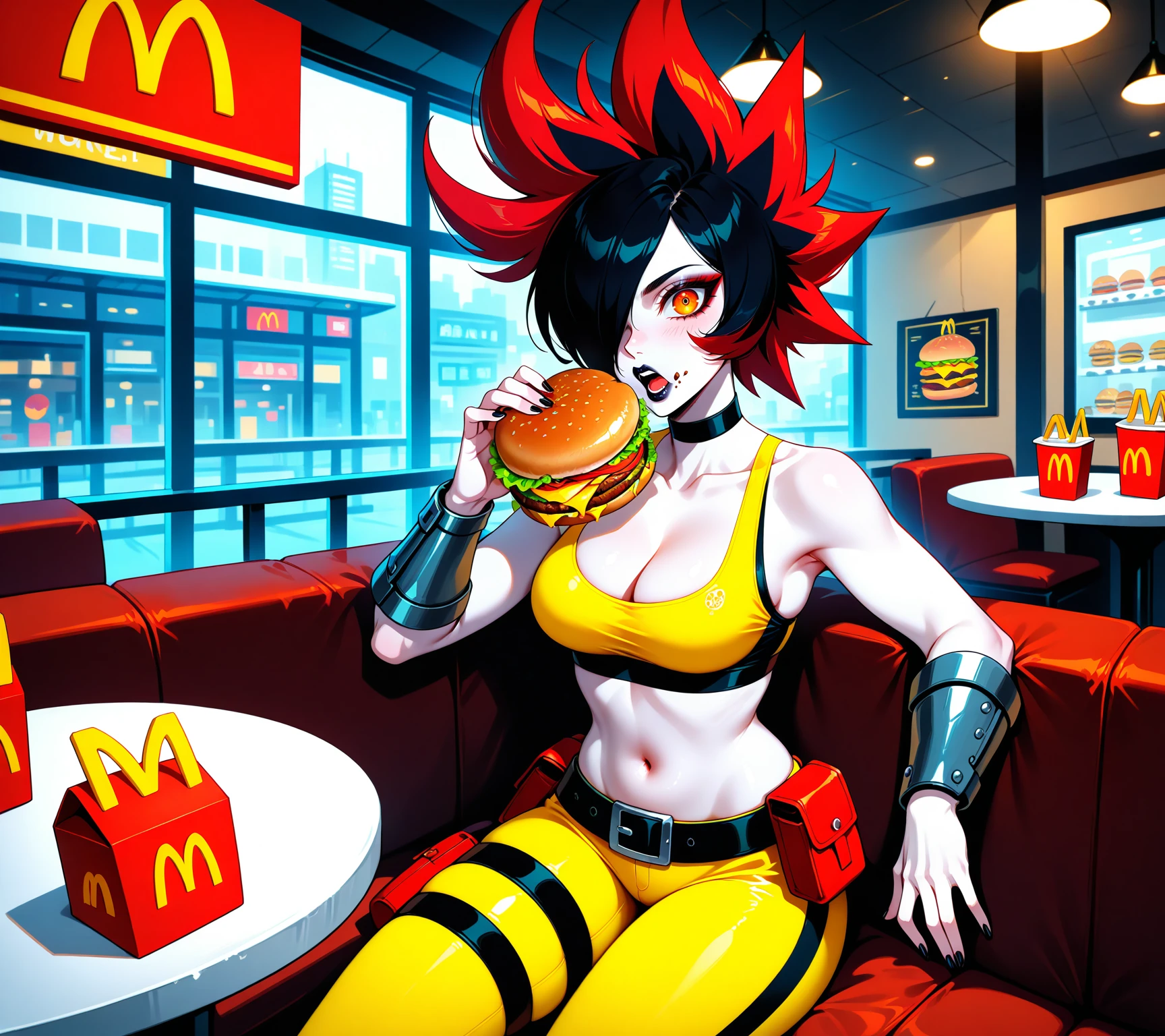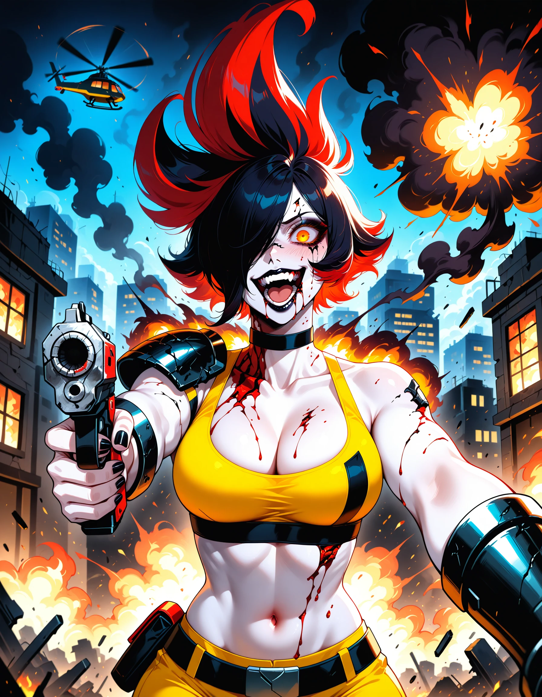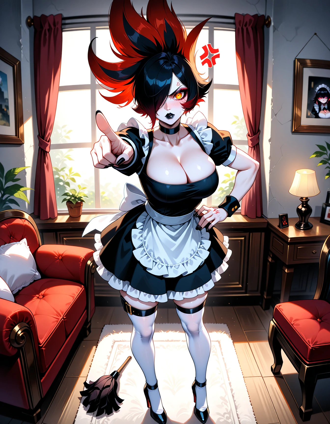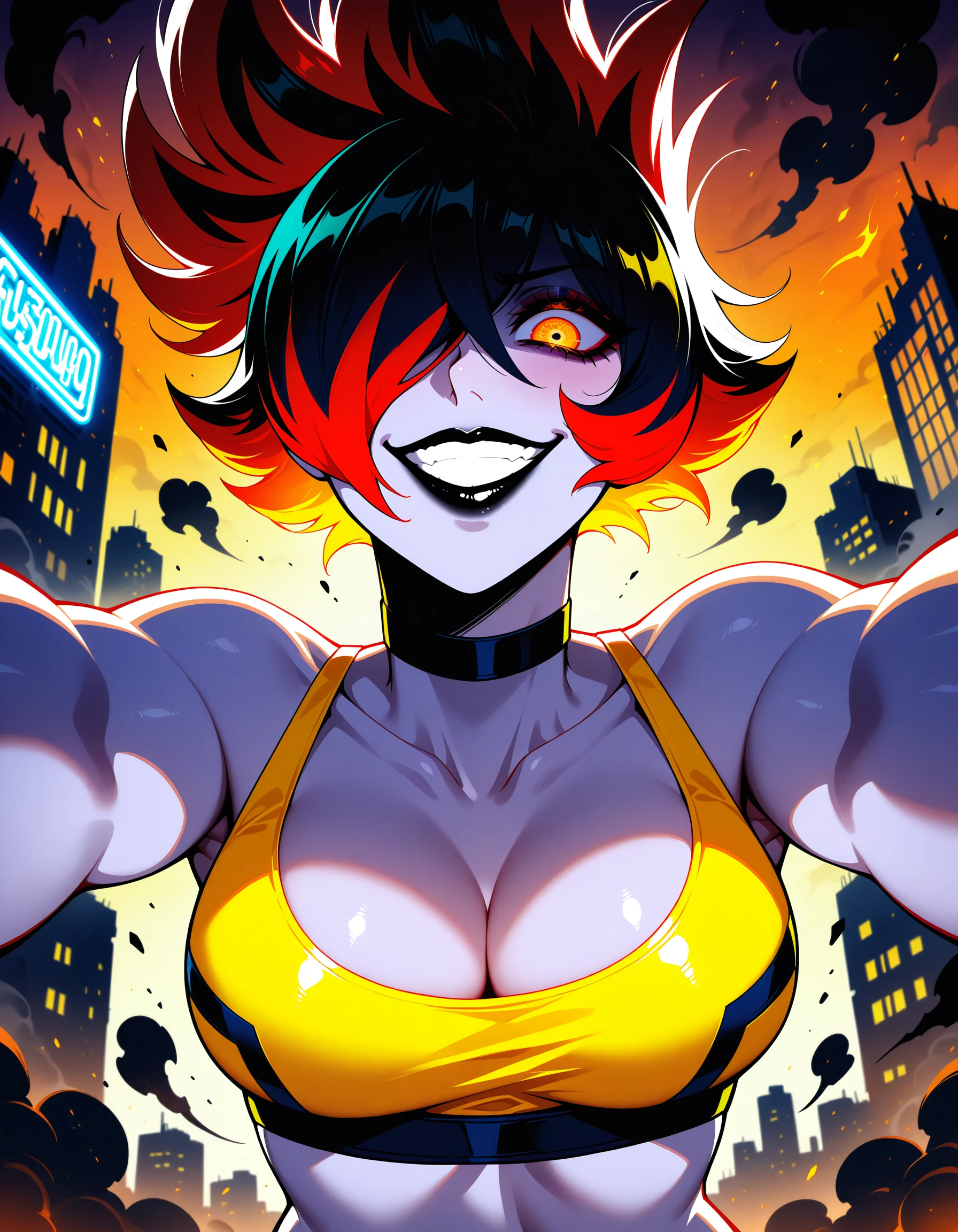 black nails, navel, cleavage, two-tone hair, pale skin, red hair, black hair, orange eyes