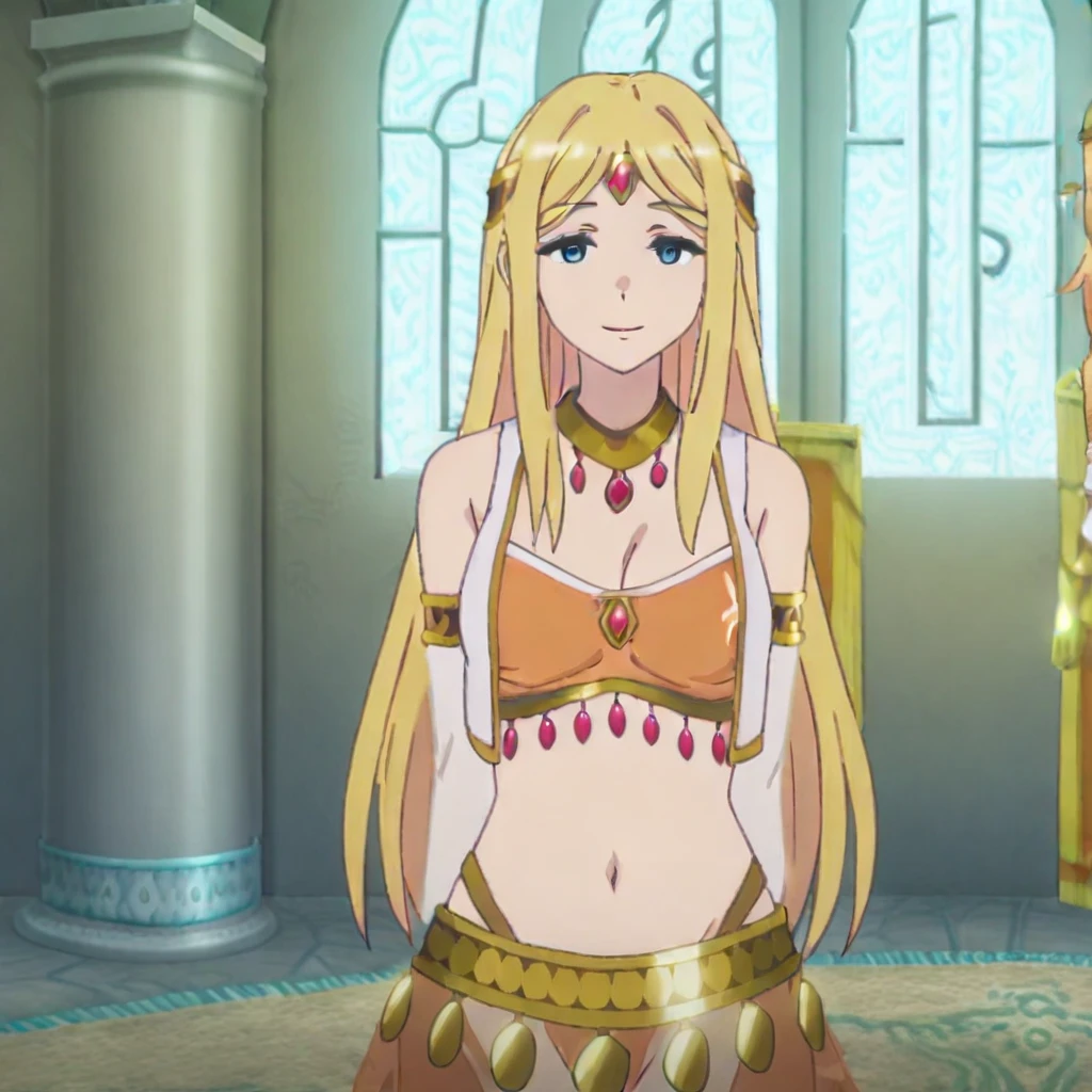 source_anime, merjana, long hair, yellow hair, hair ornament closed eyes, merjana_outfit, upper body, armband, arabian clothes, large breasts, cleavage, red earrings, jewel collar , jewel on breasts, midriff
