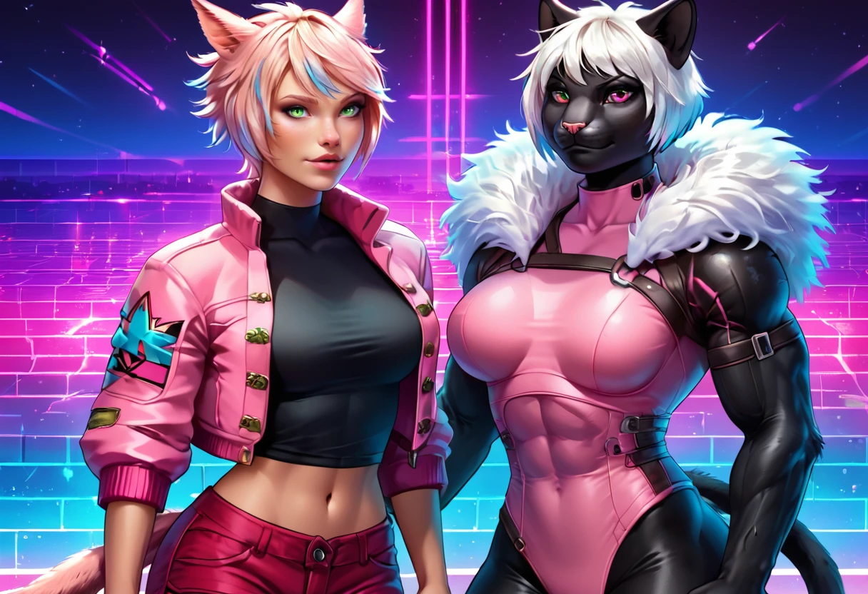 Black Cat: blackc4t ,furry female, muscular, pink hair pink cat ears, black fur, body fur, claws, bodysuit, fur trim