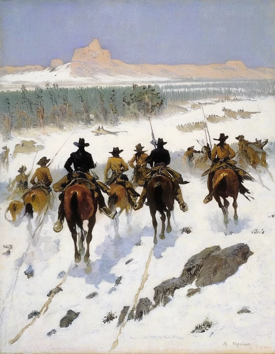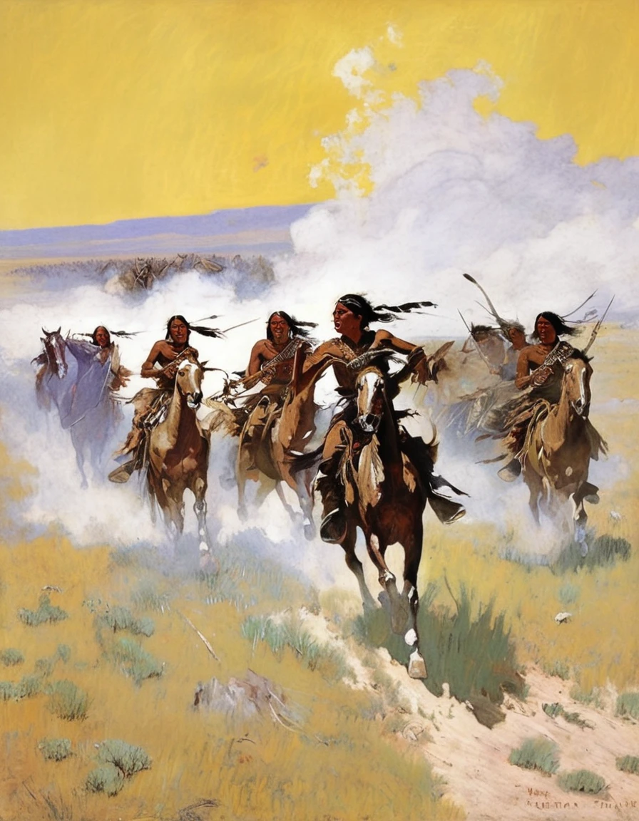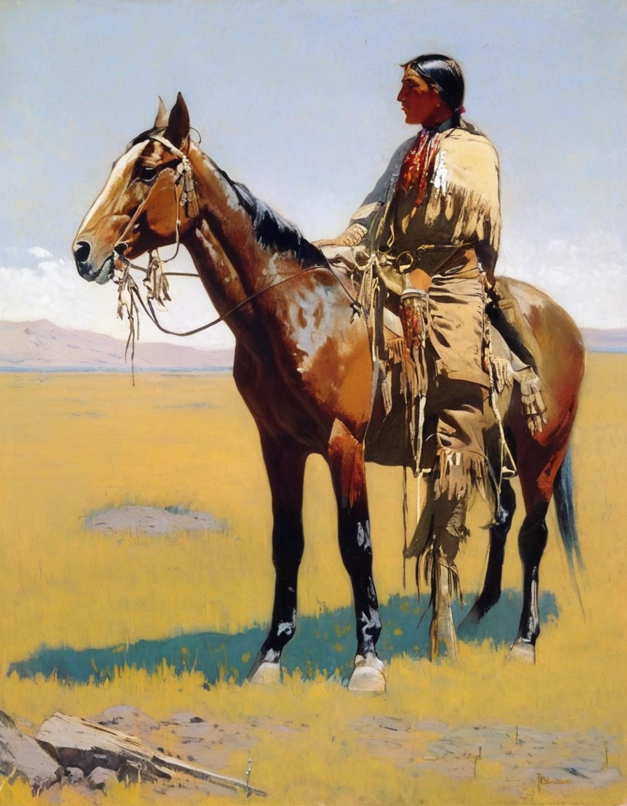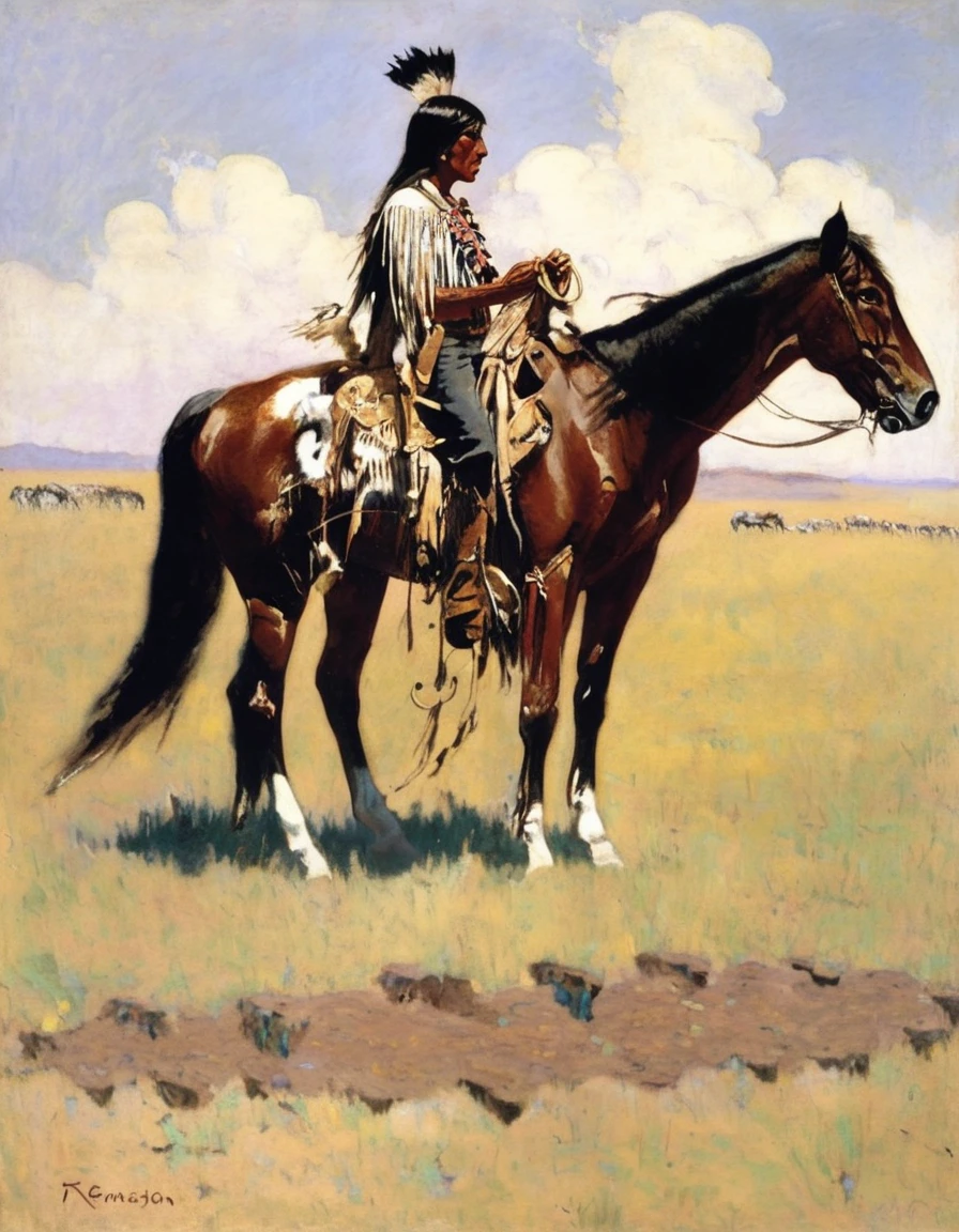 I love the style and themes of Frederic Remington. "Frederic Remington (1861-1909) was an American painter, illustrator, and sculptor, best known for his iconic depictions of the American West"
