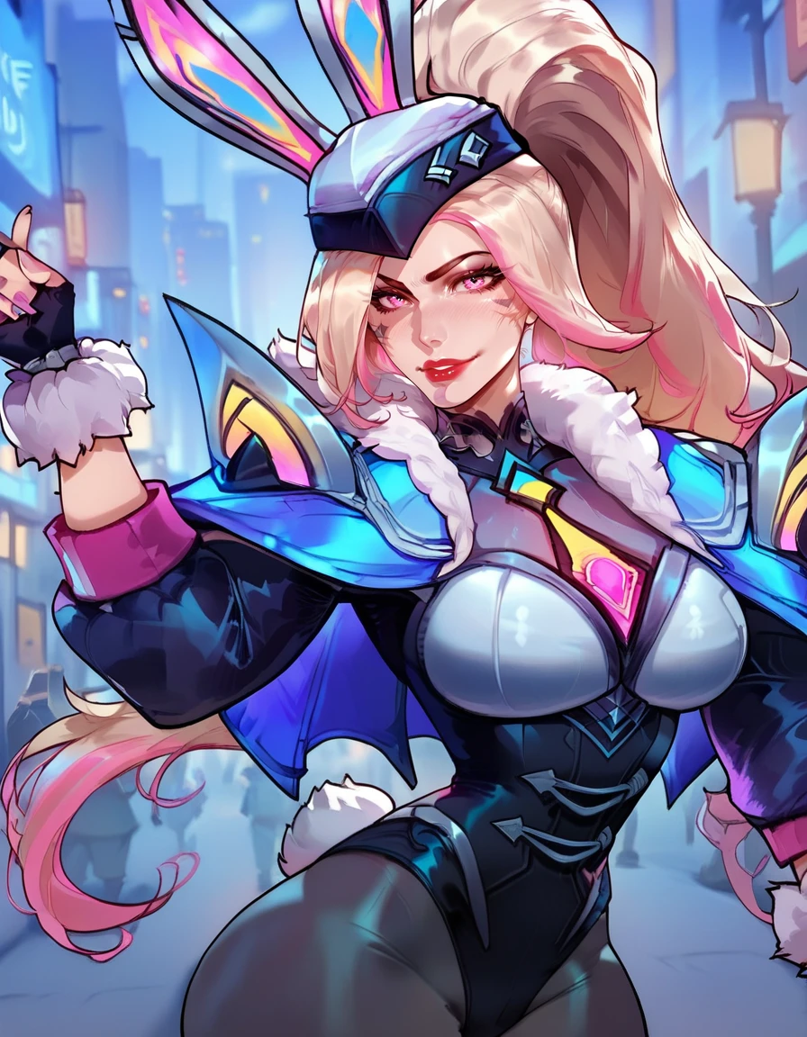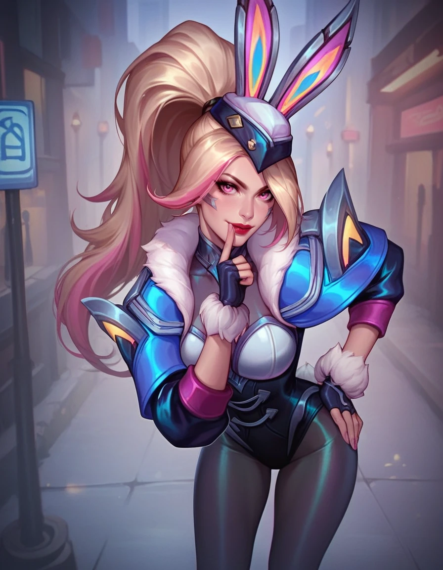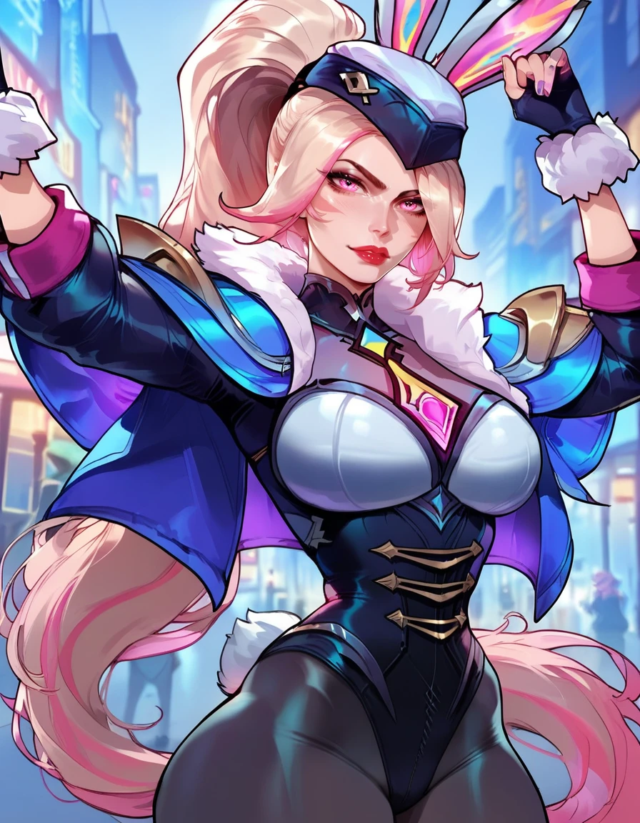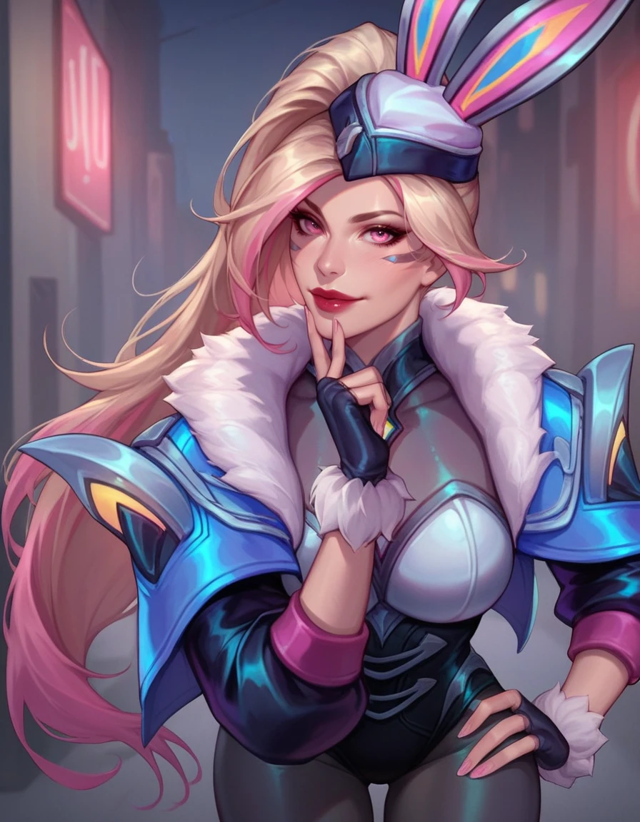 Tags for head "hat, bunny ears, ponytail, multicolored hair, blonde hair, pink hair, pink eyes, red lips"
