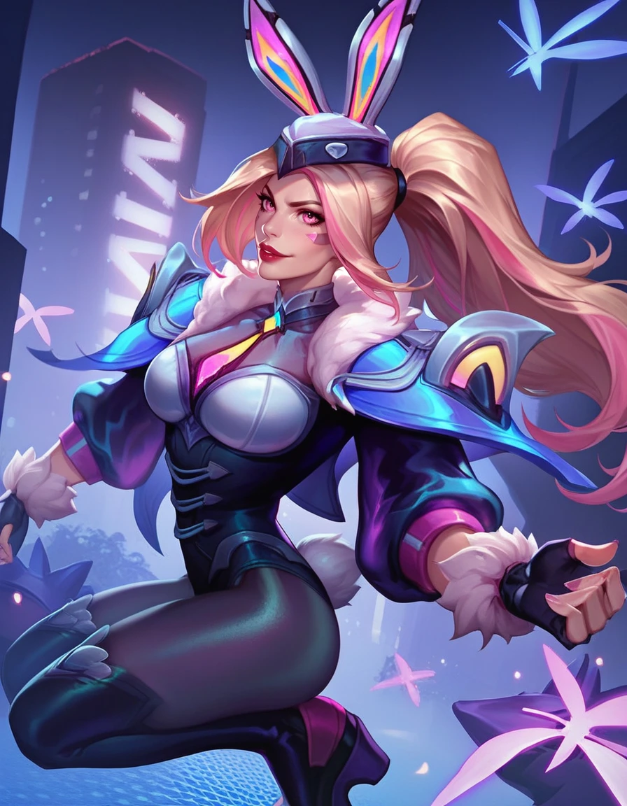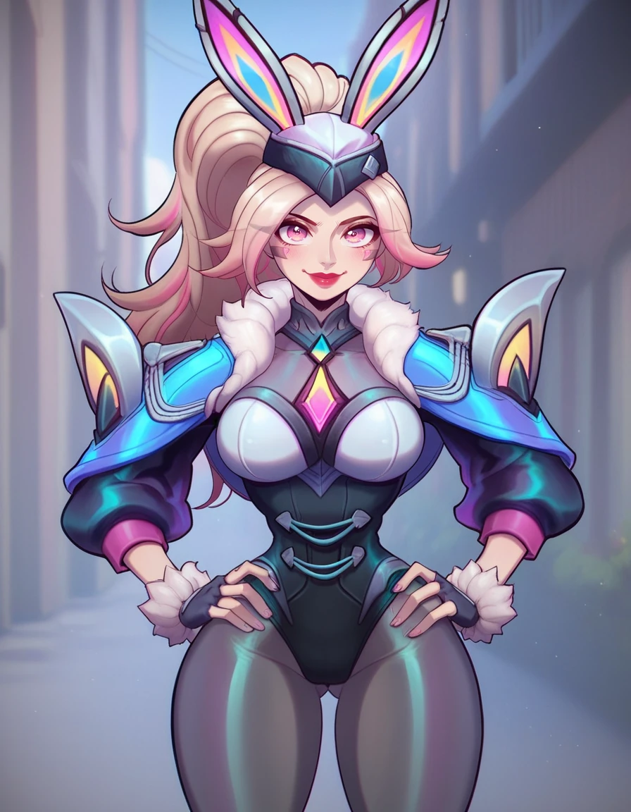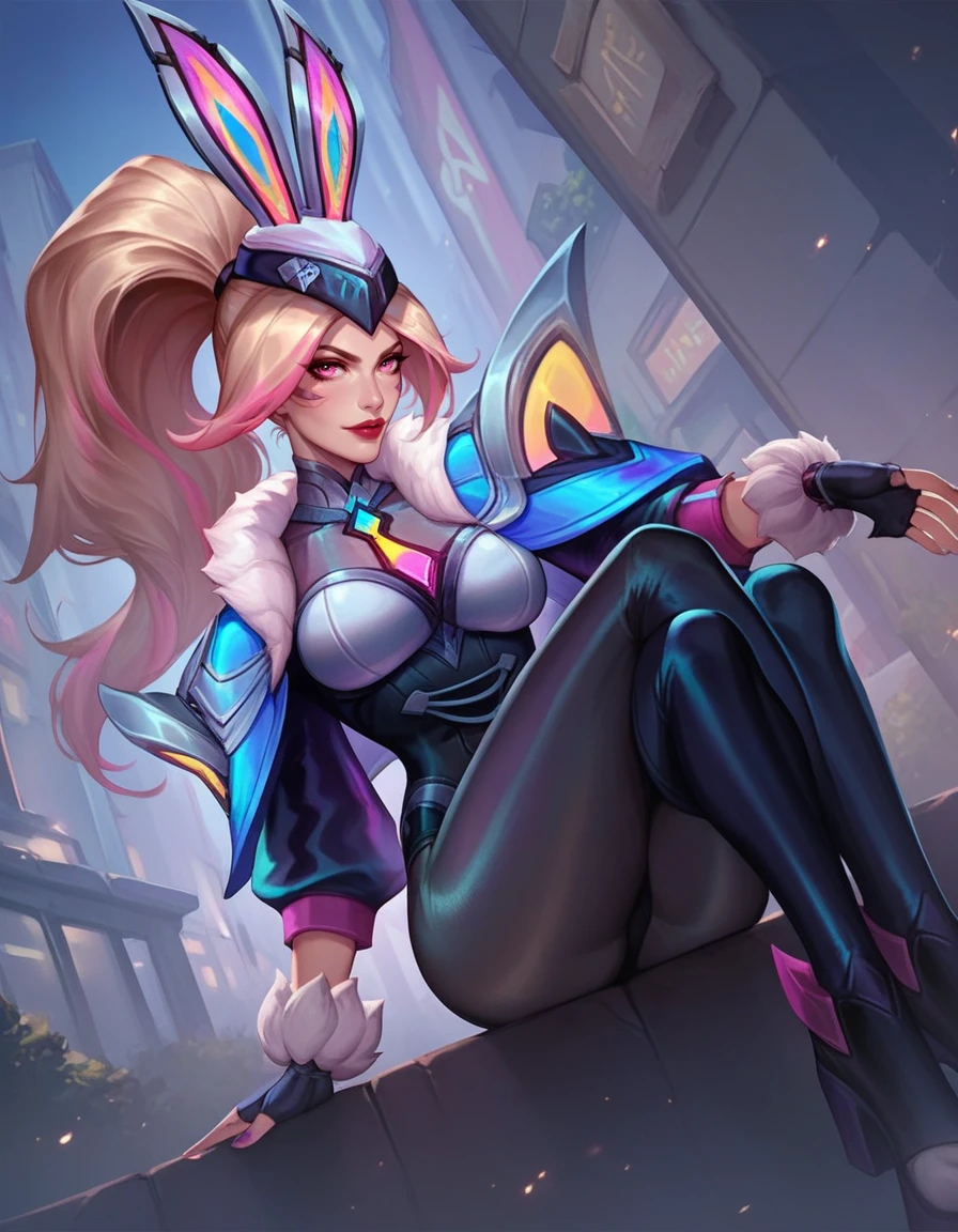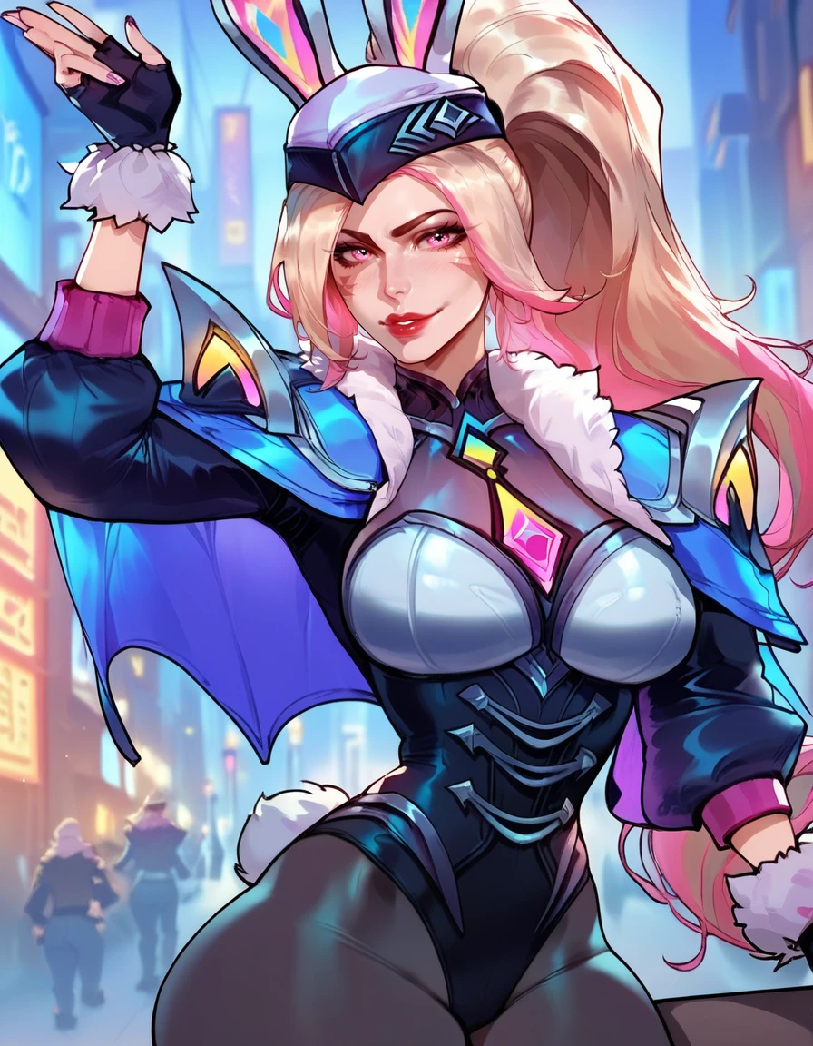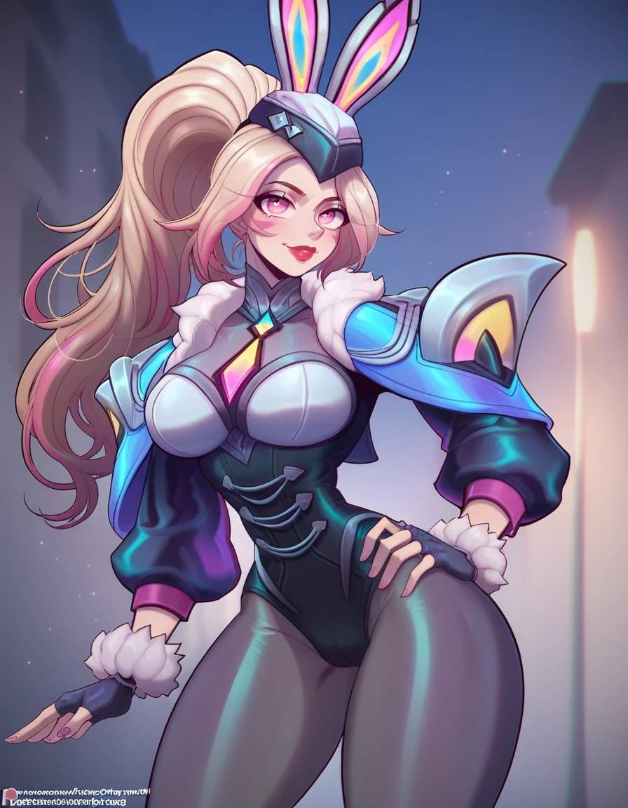 Tags for head "hat, bunny ears, ponytail, multicolored hair, blonde hair, pink hair, pink eyes, red lips"